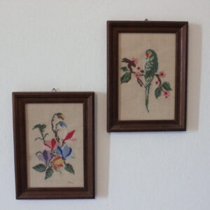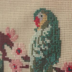 The canvas is Gobelin. The design motif was sourced from a magazine. The stitch is half Gobelin stitch.