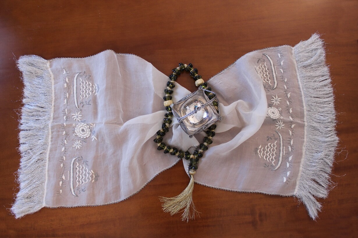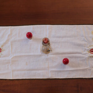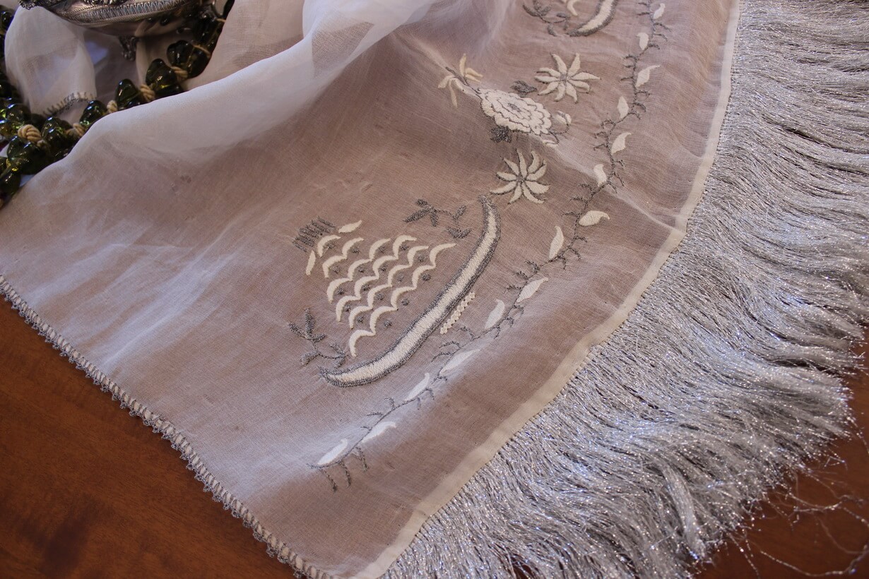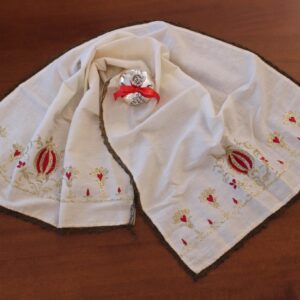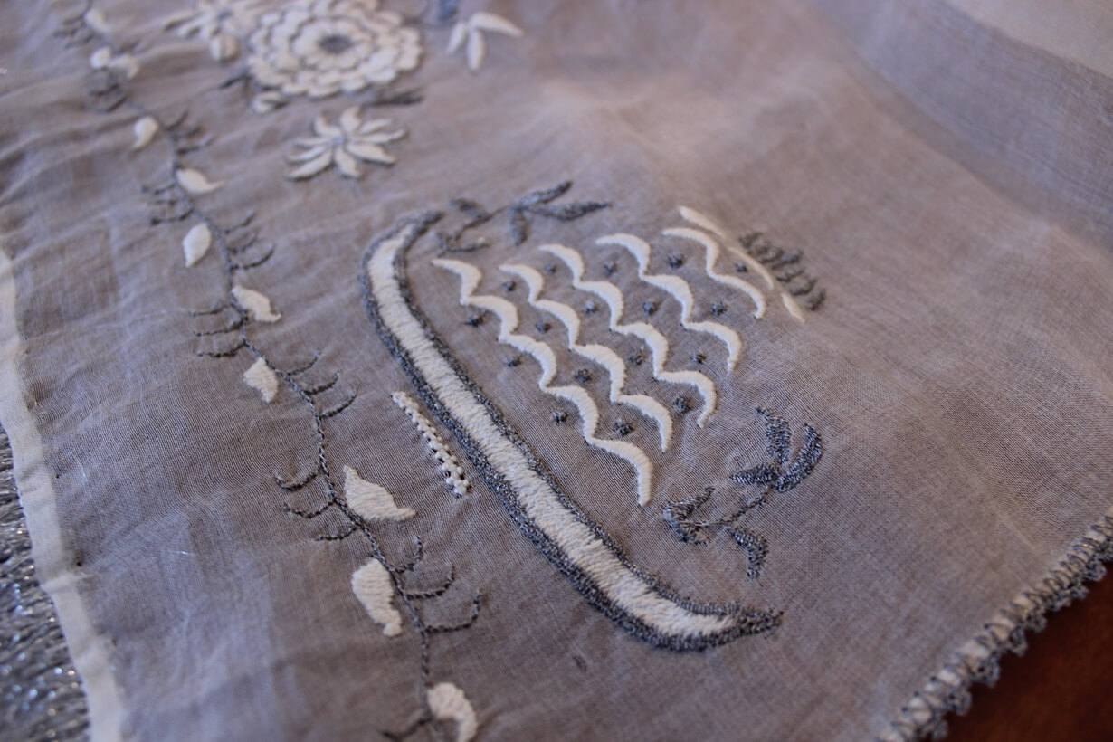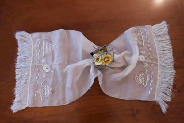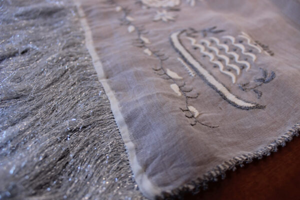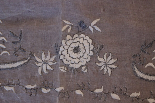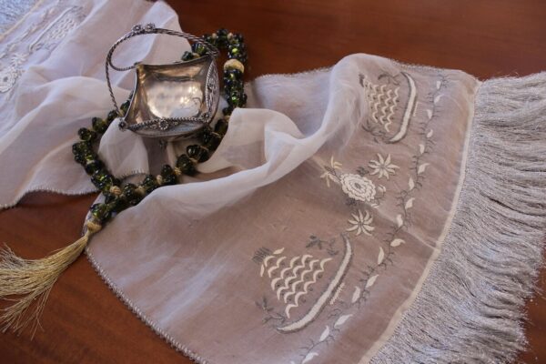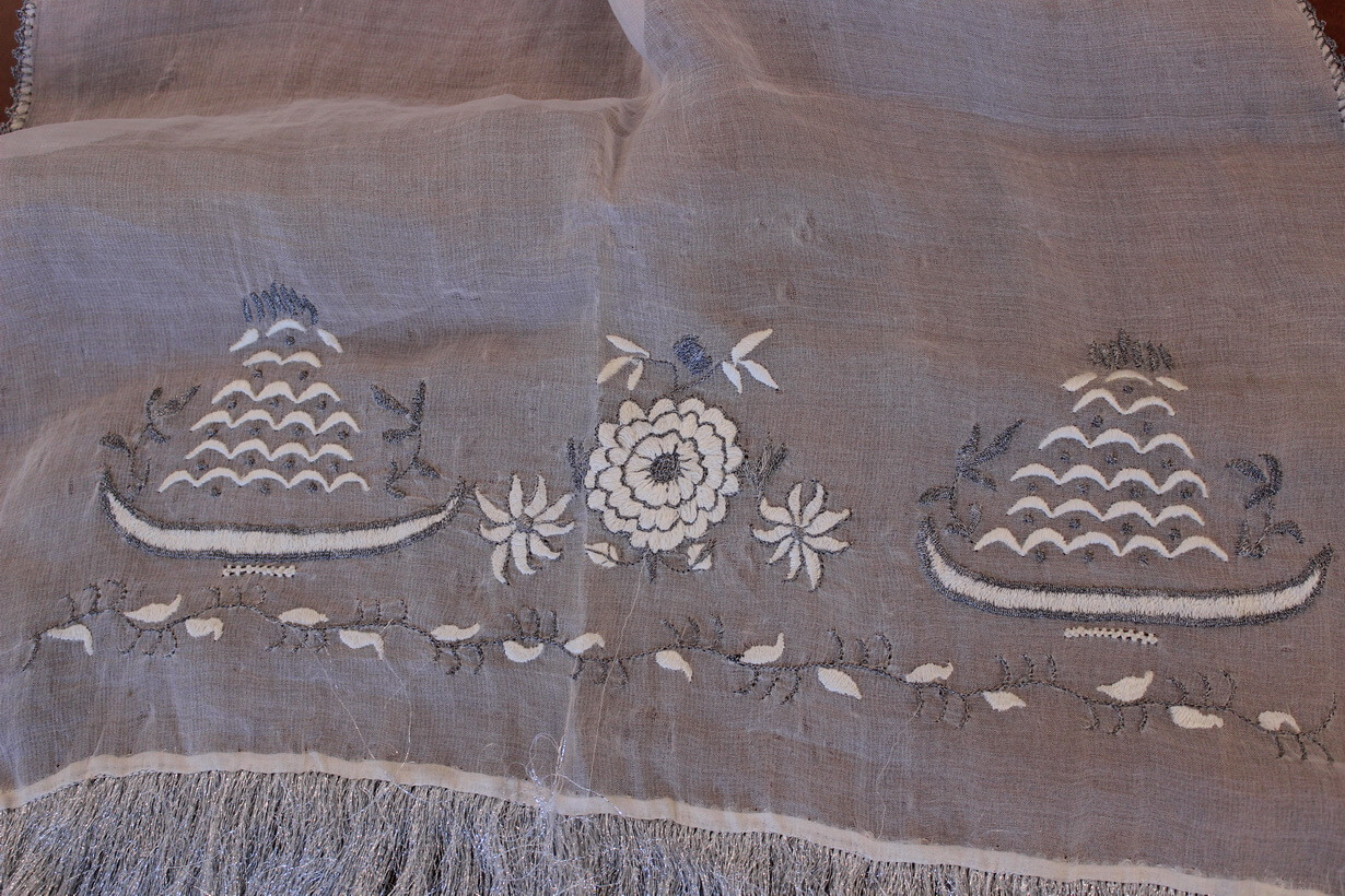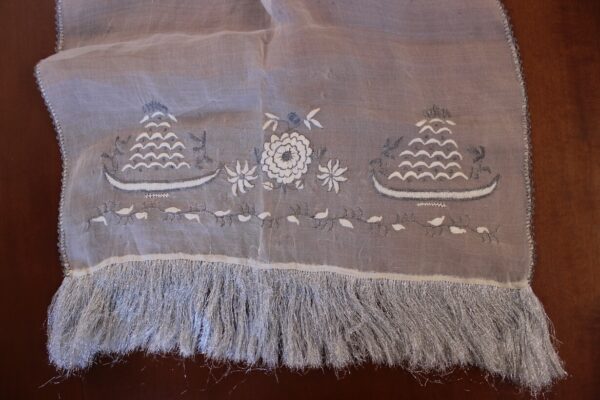 From her early works, featuring an oriental character. The white fabric is silk made from silkworms cultivated in Soufli, Greece, and is known as “Soufliotiko”. The design motif was sourced from a magazine and used to create this composition.