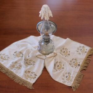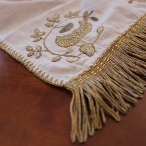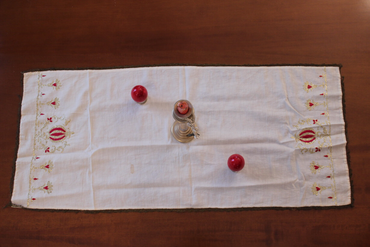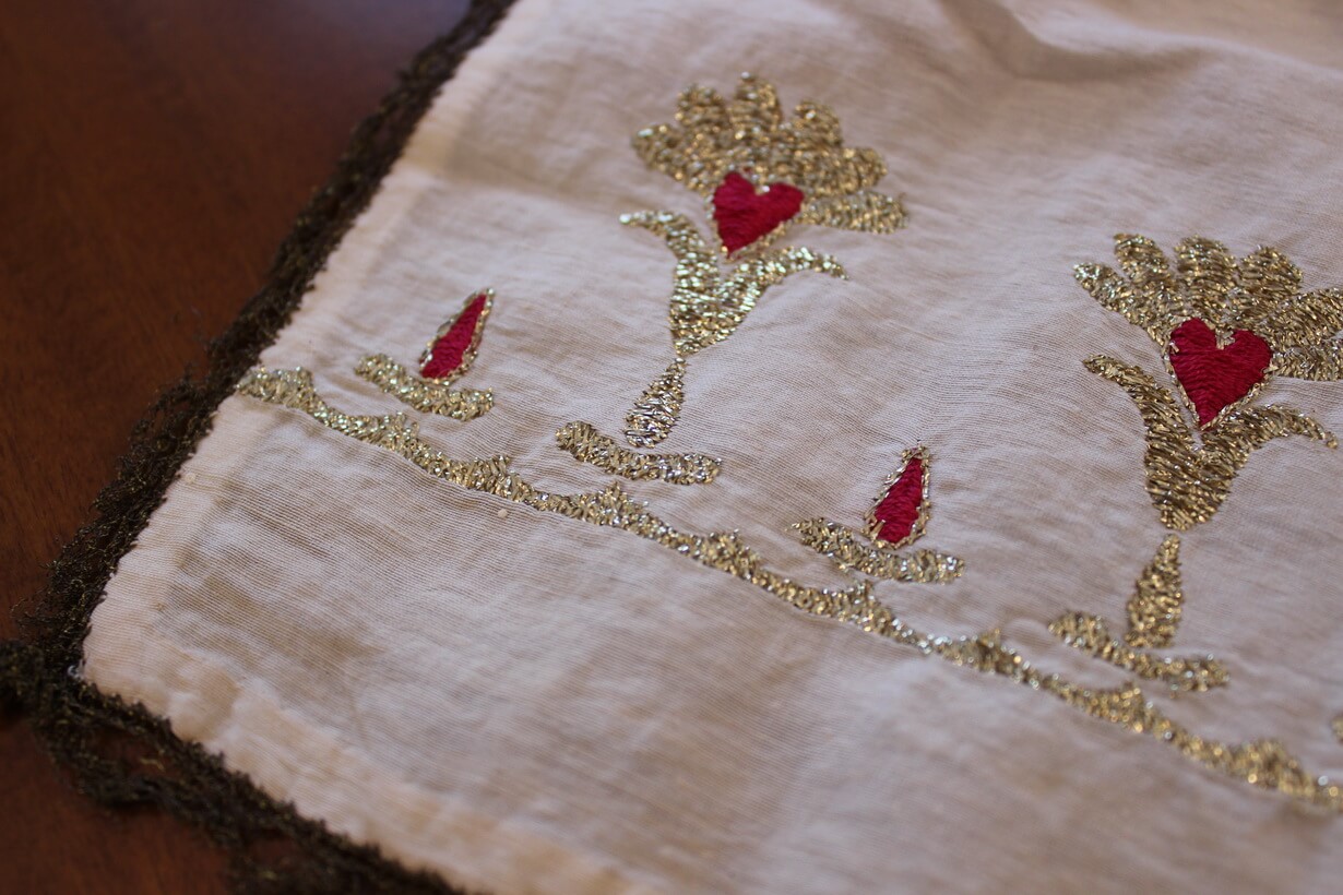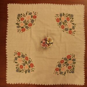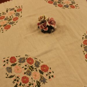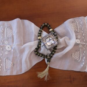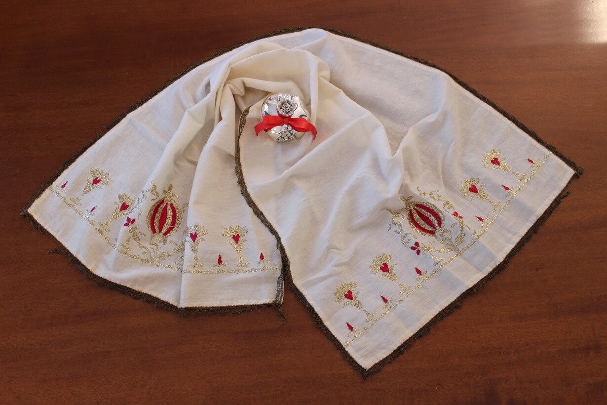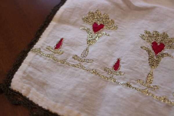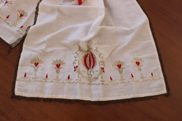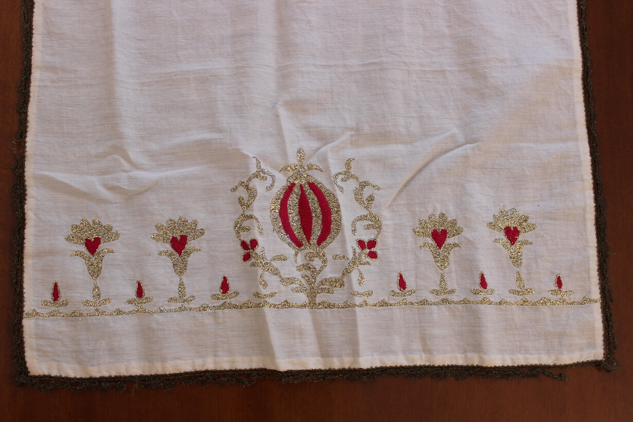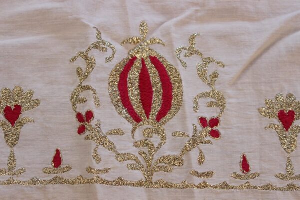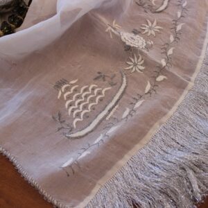 From her early works, featuring an oriental character. The white fabric is silk made from silkworms cultivated in Soufli, Greece, and is known as “Soufliotiko”. The design motif was sourced from a magazine and used to create this composition.
