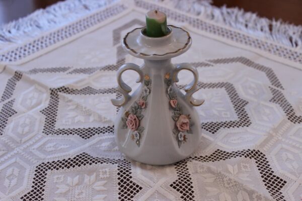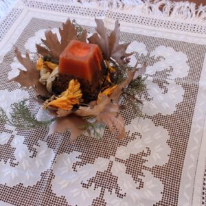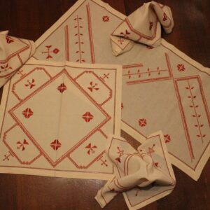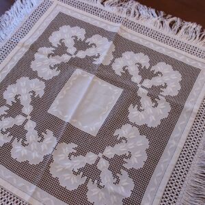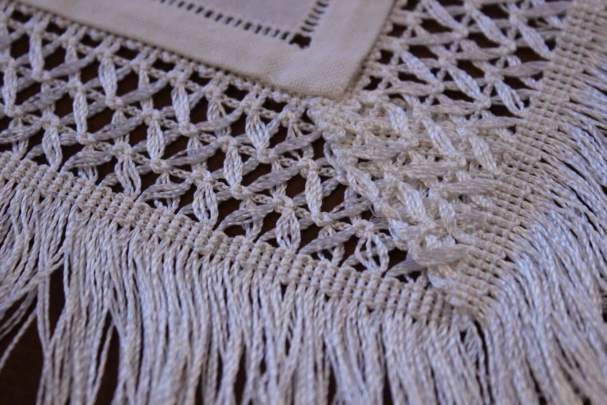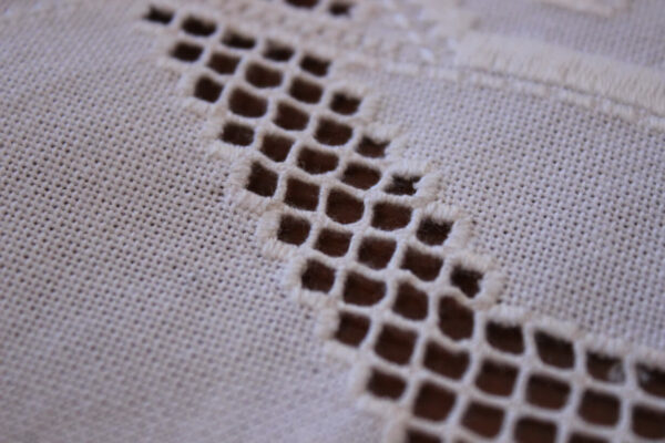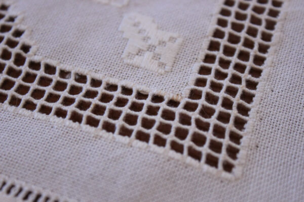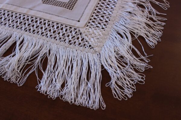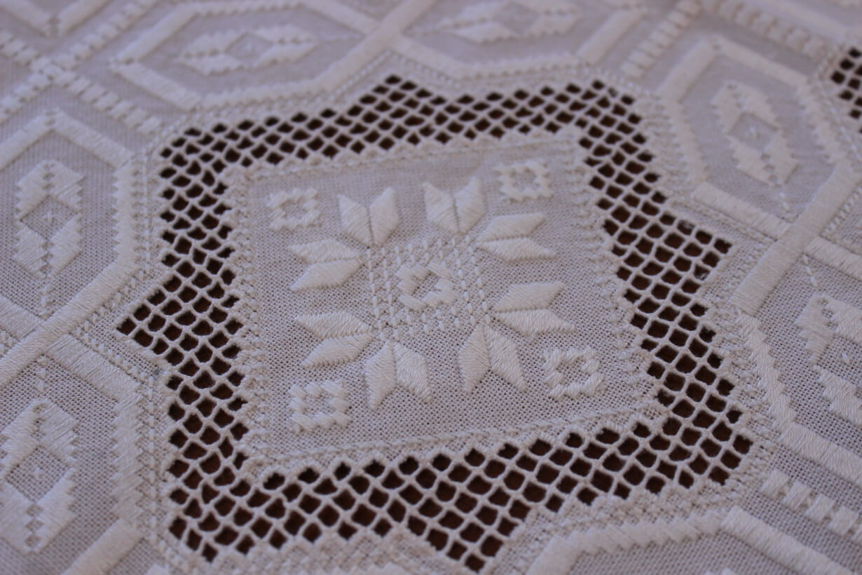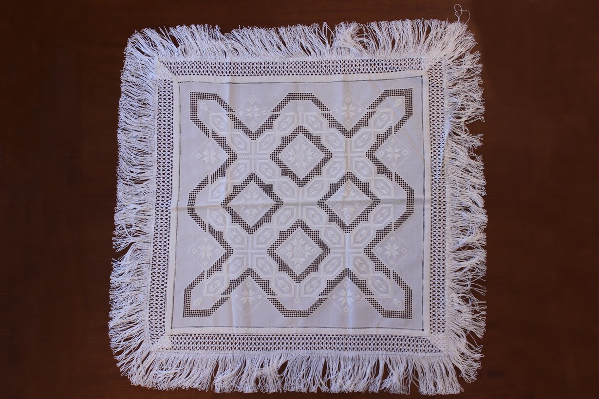 The white fabric is linen. The design motif was sourced from a magazine and used to create this composition. The difficulty of this type of embroidery is very high, as threads are removed and their cut edges are embroidered to create these squares, giving the appearance of lace (drawn thread work). This type of work is called Lefkaditiko.