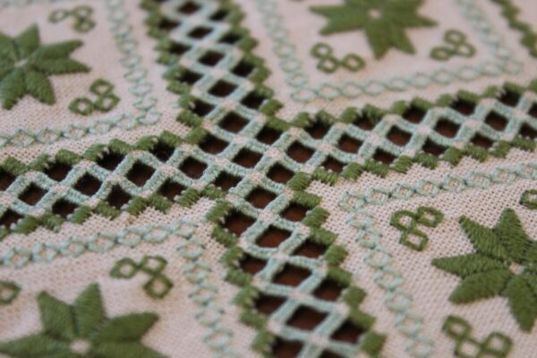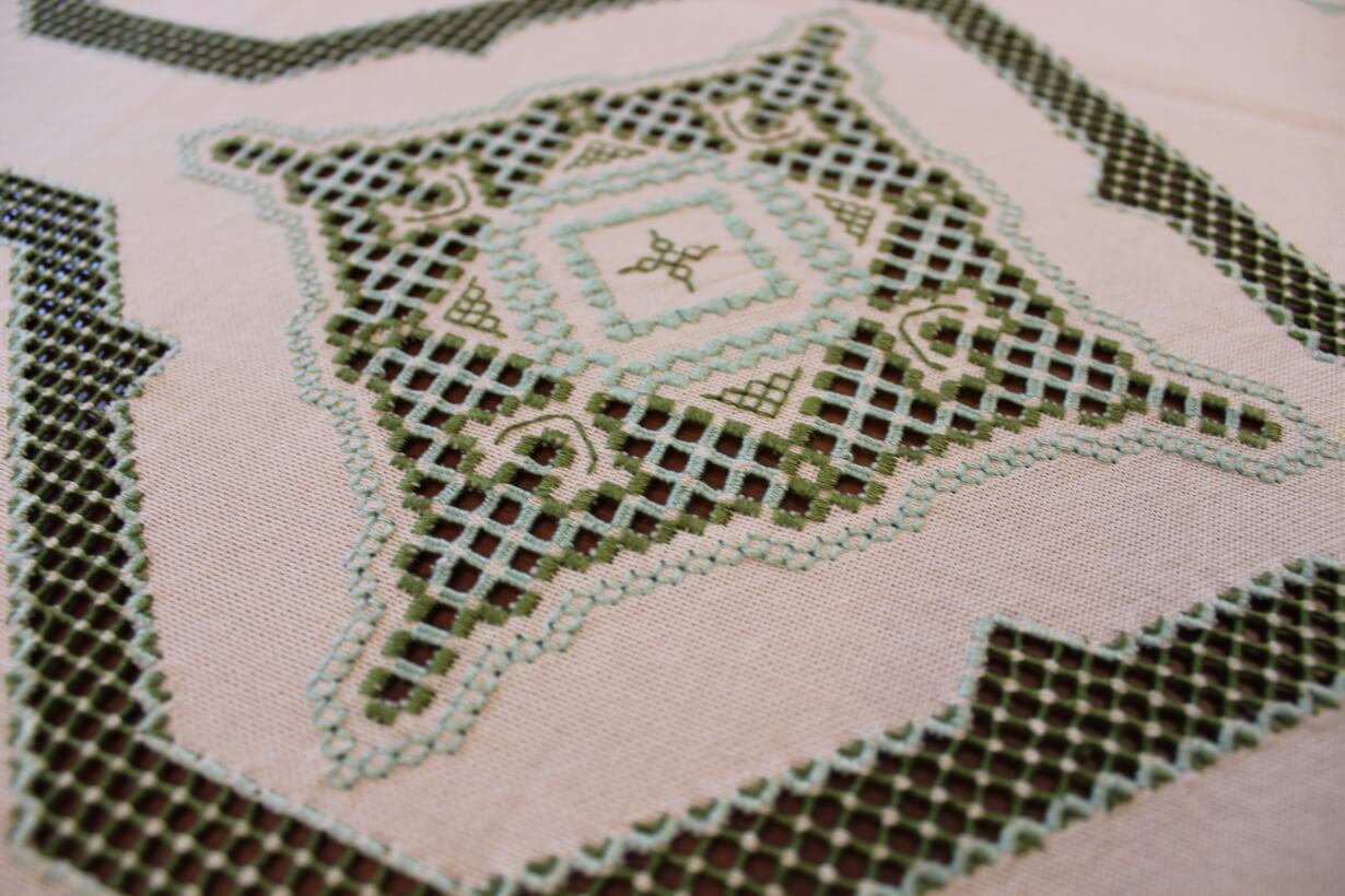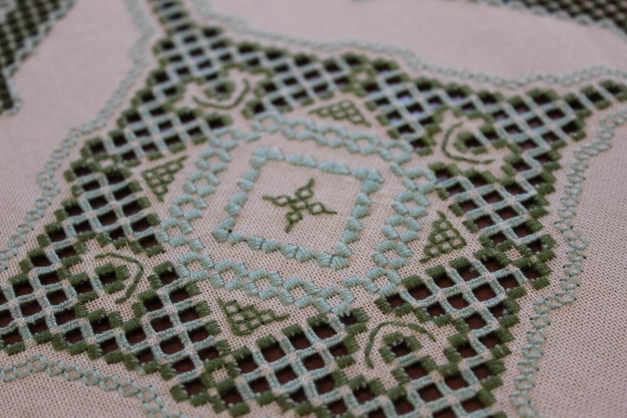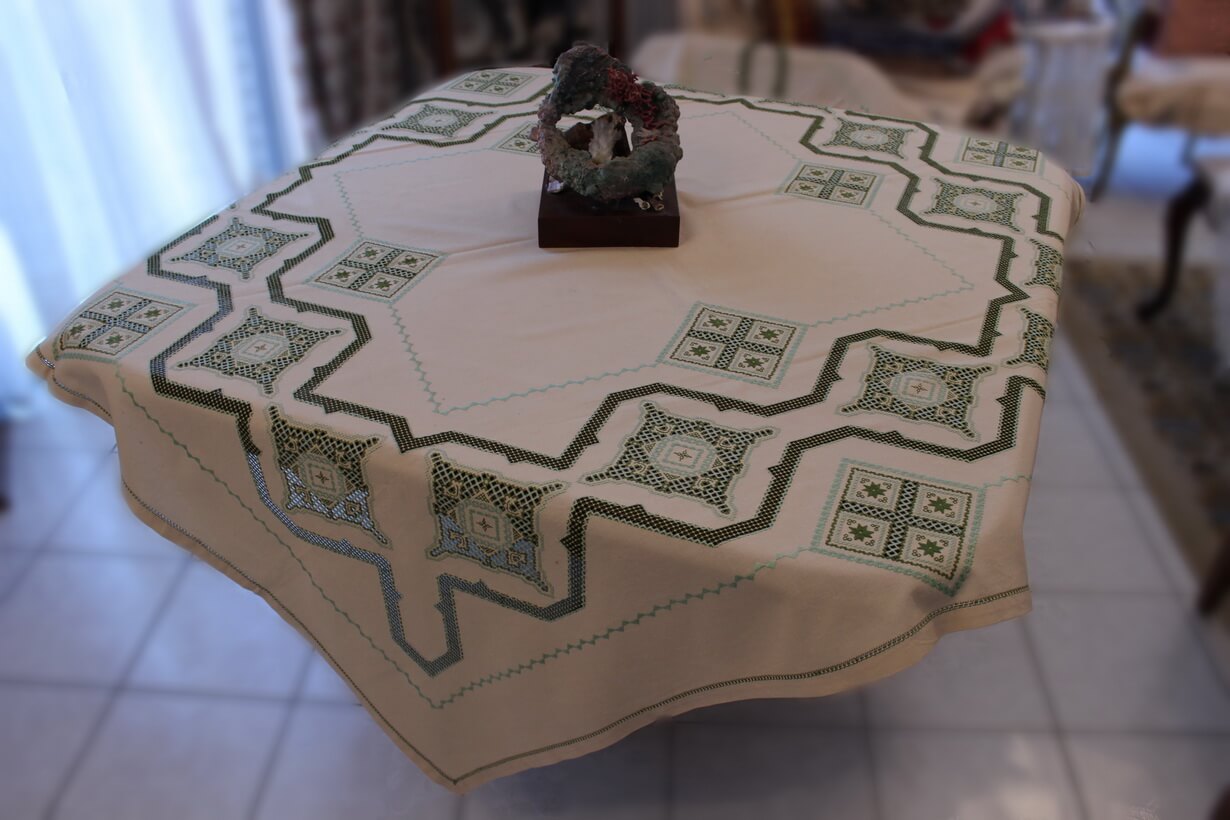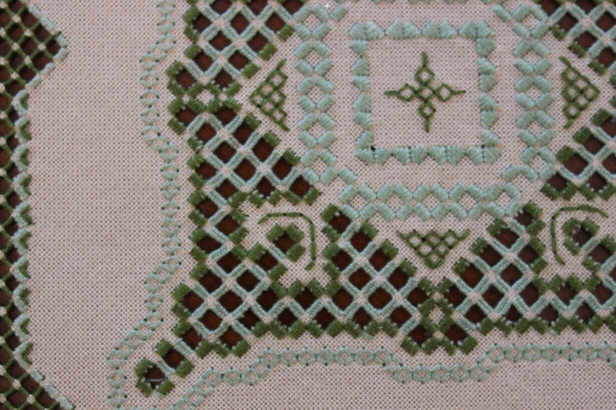 The beige fabric is etamine. The design motif was sourced from a magazine and used to create this composition. The difficulty of this type of embroidery is very high, as threads are removed and their cut edges are embroidered to create these squares, giving the appearance of lace (drawn thread work). This type of work is called Lefkaditiko.