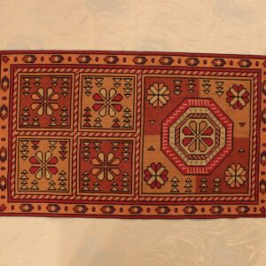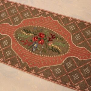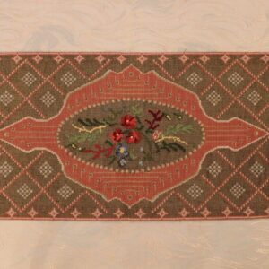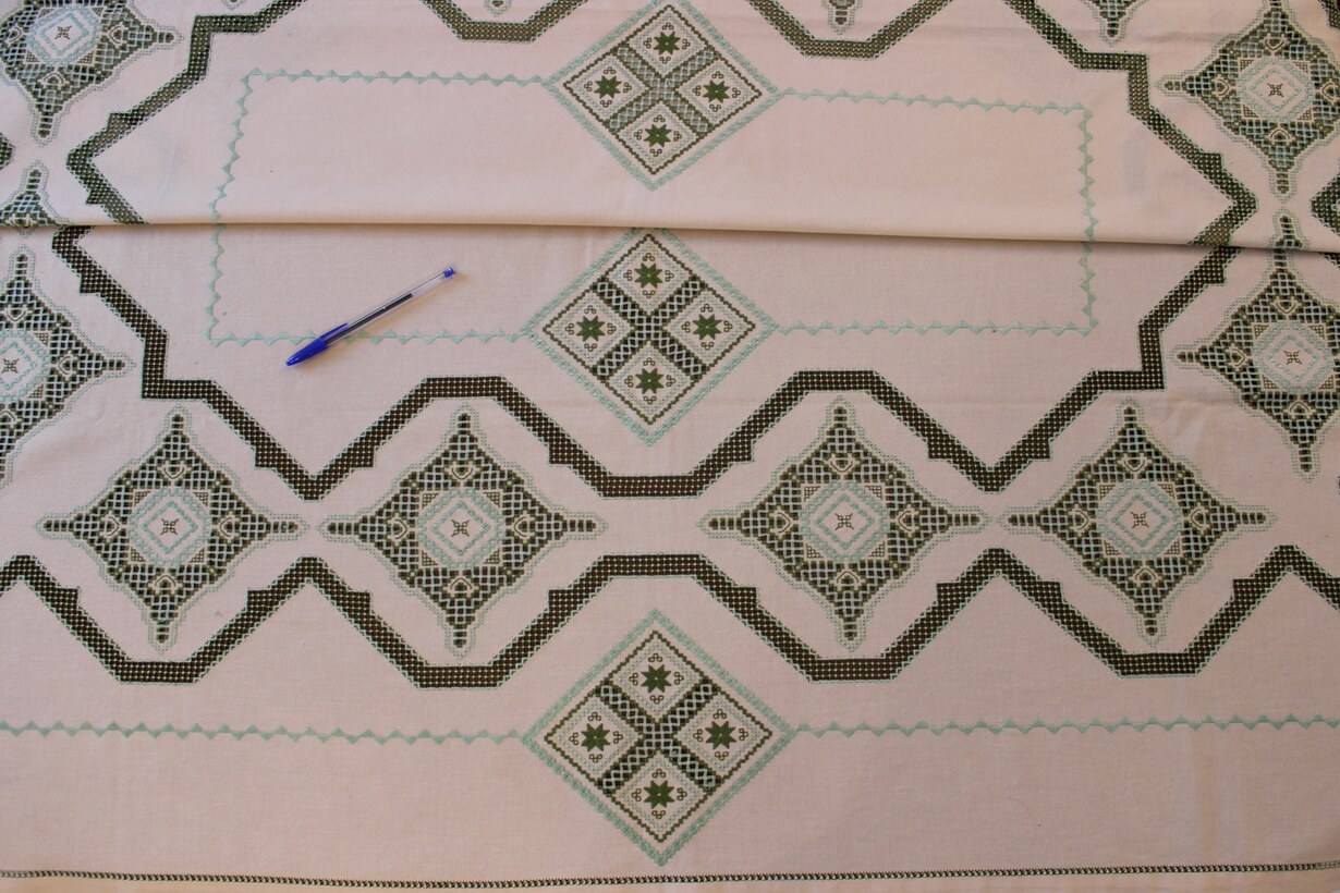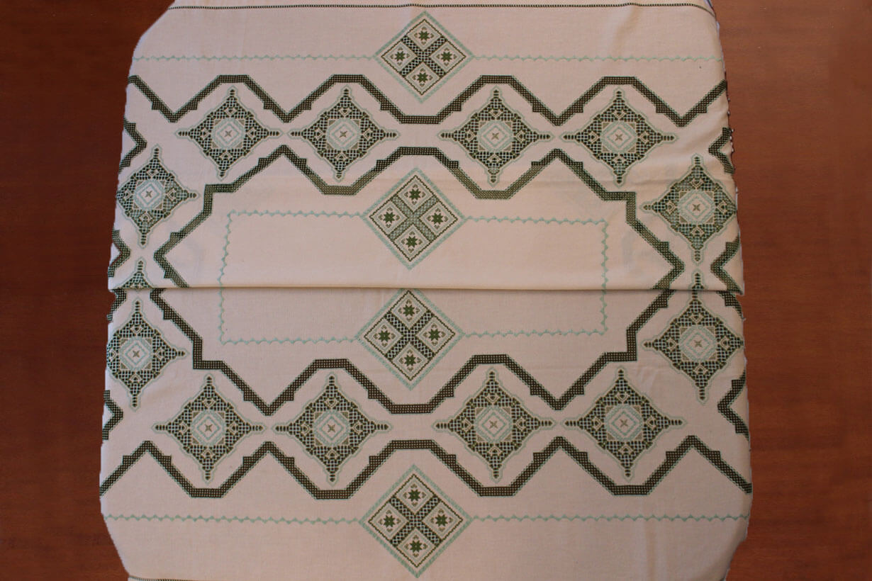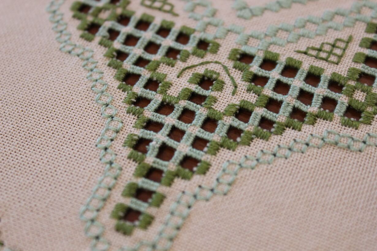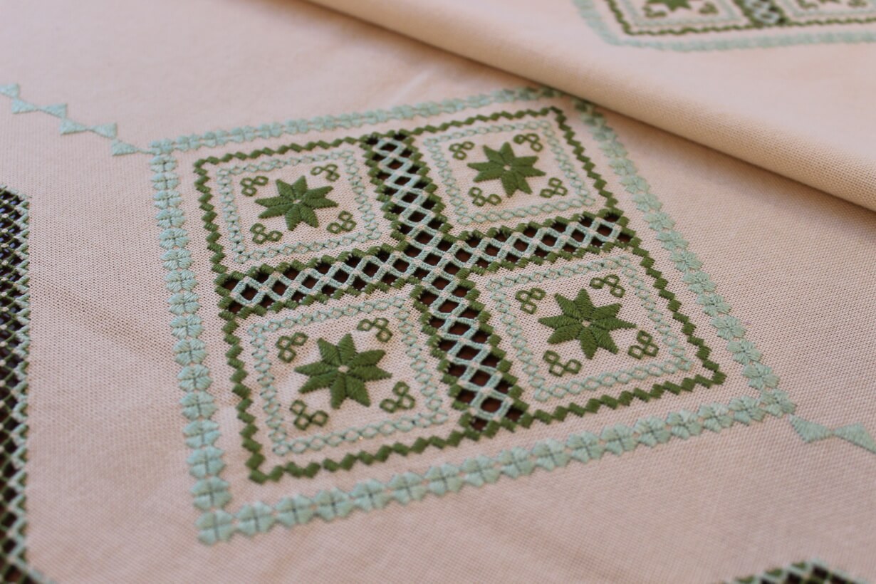 The beige fabric is etamine. The design motif was sourced from a magazine and used to create this composition. The difficulty of this type of embroidery is very high, as threads are removed and their cut edges are embroidered to create these squares, giving the appearance of lace (drawn thread work). This type of work is called Lefkaditiko.