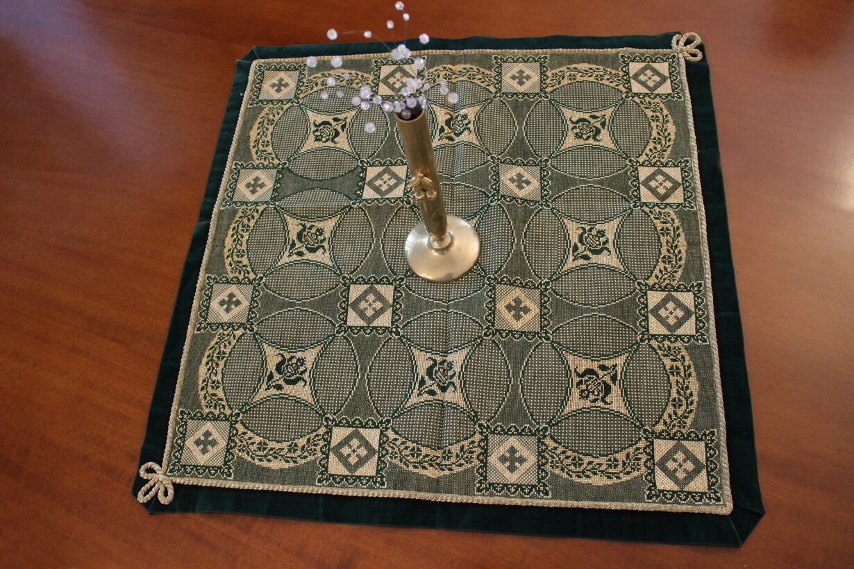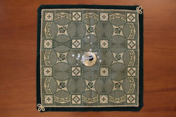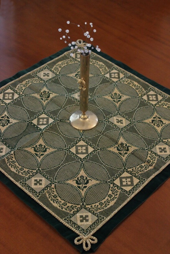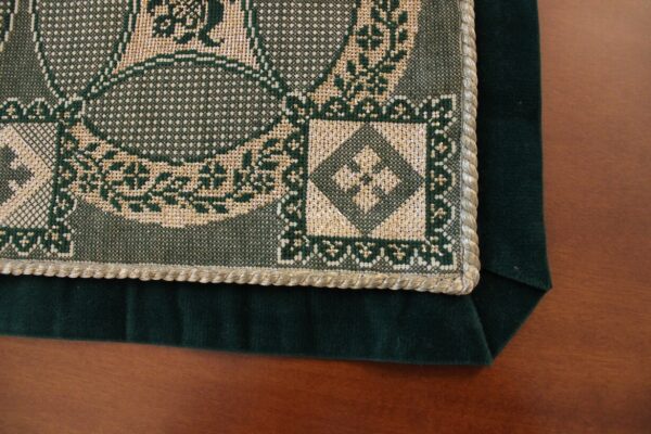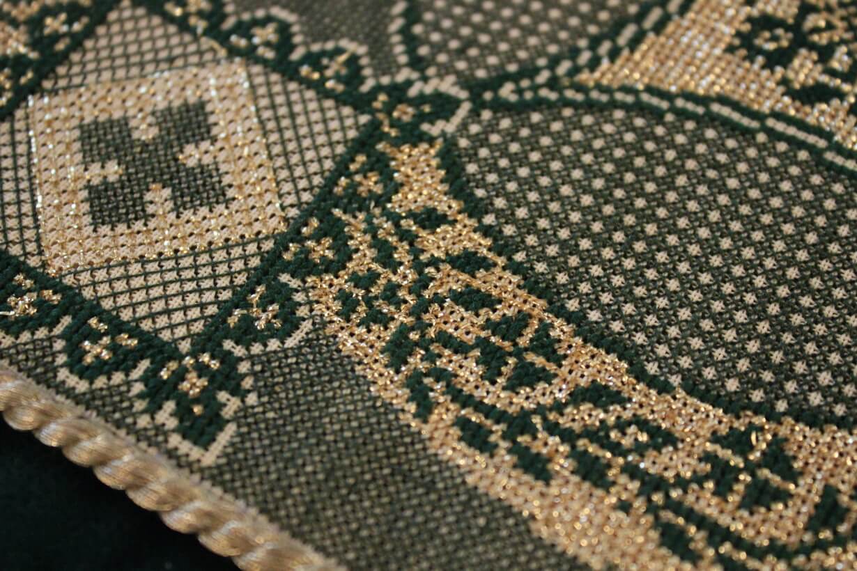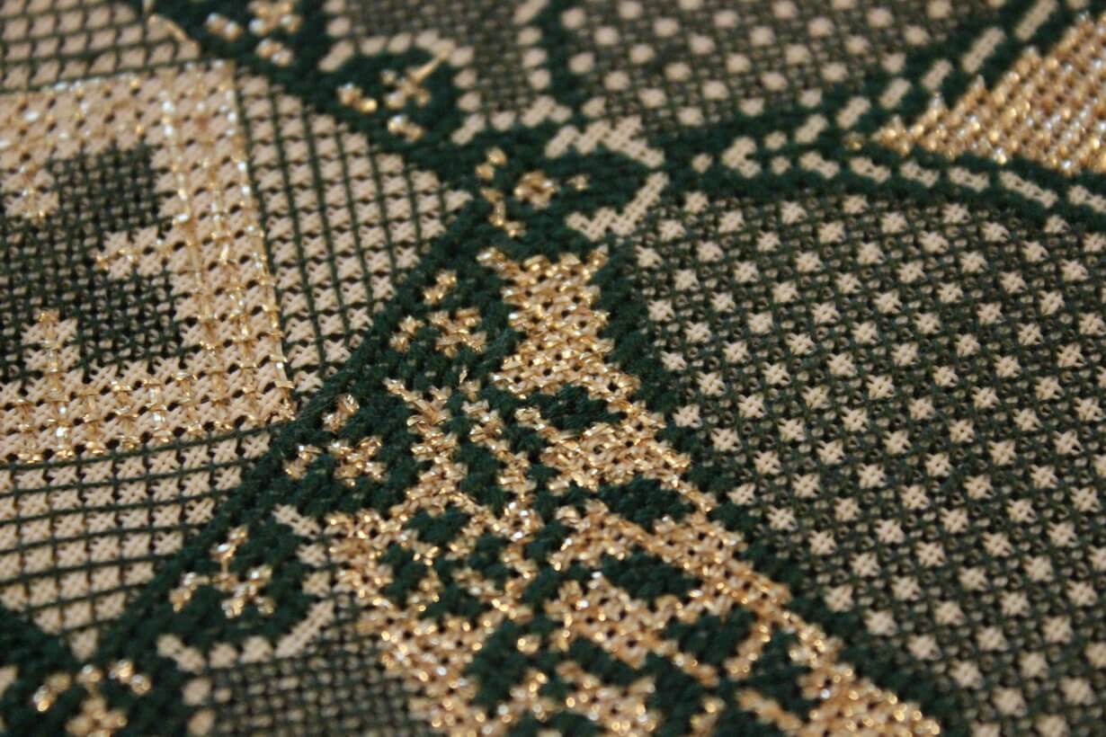 The stitch used for the designs was cross-stitch with double thread, while the stitch used for the filling was cross-stitch with single thread. This second single-thread cross-stitch is called “arachni” (spider) in Greek because it creates a soft filling effect. The filling is done with gold thread.