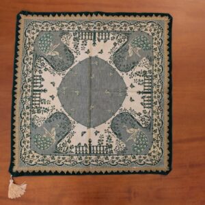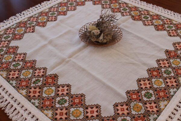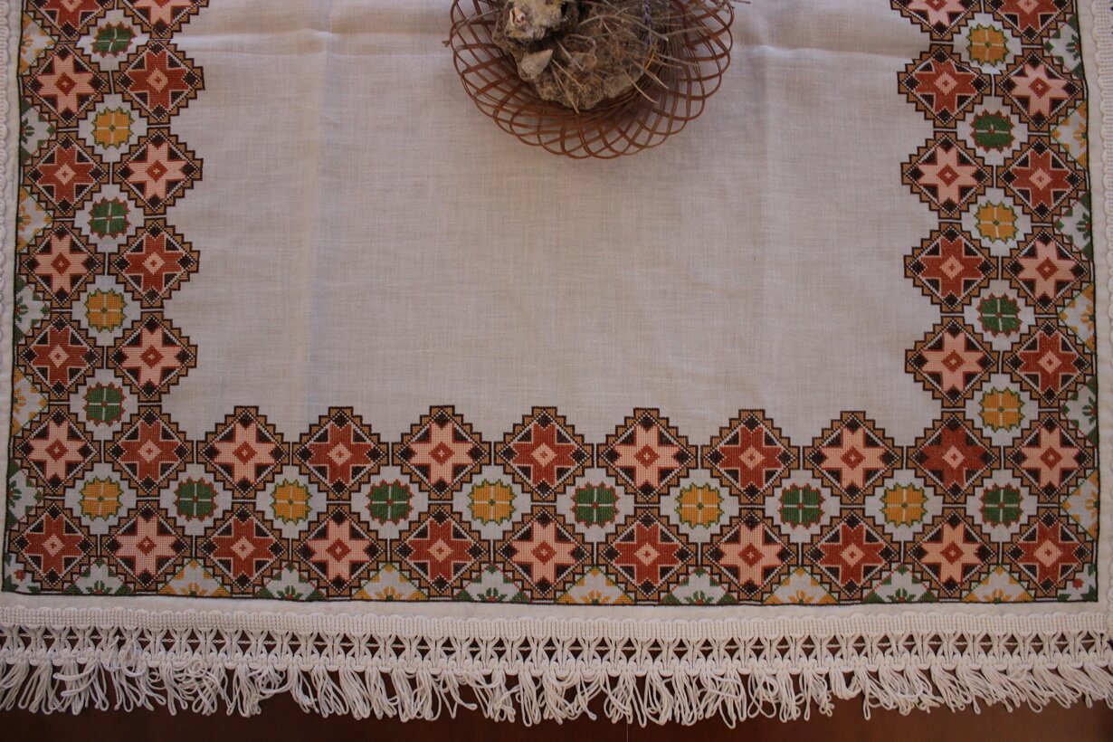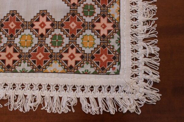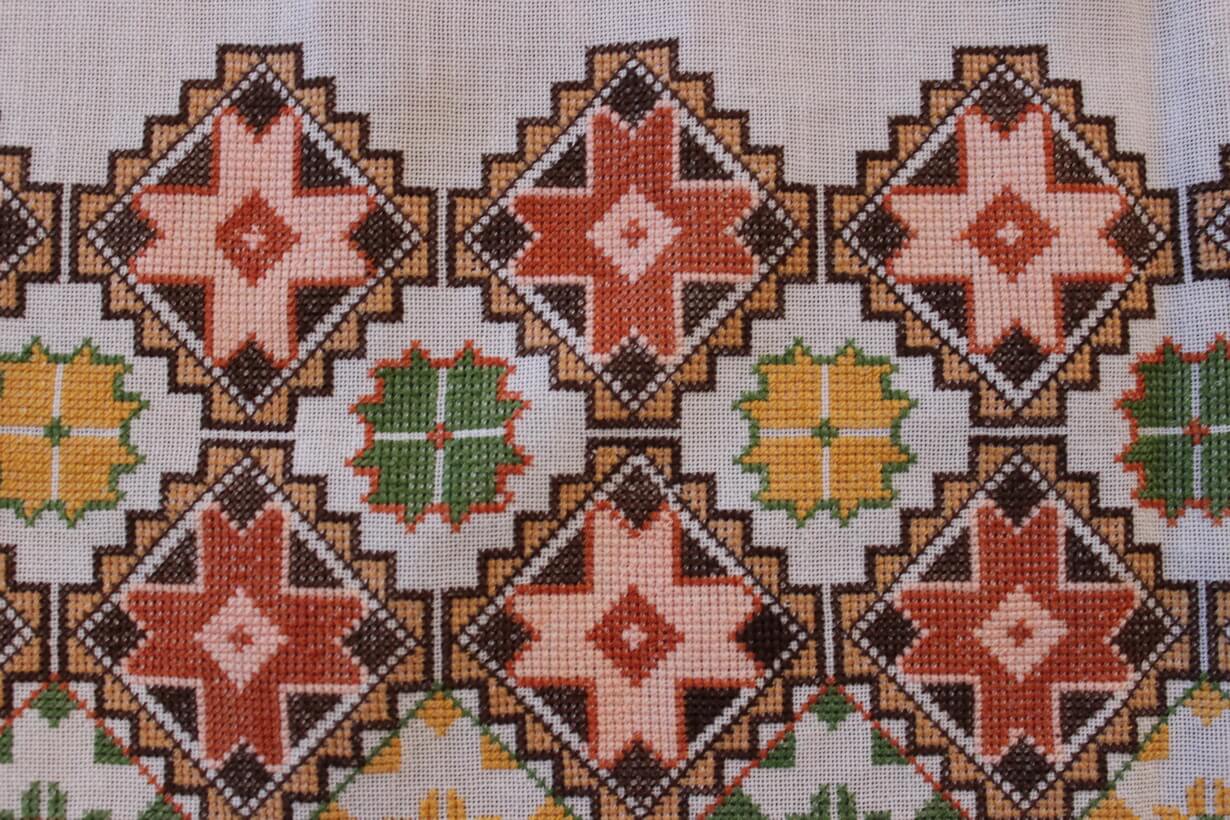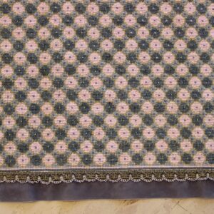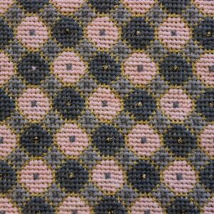 The fabric is etamine. The design motif was sourced from a magazine and is a repeating pattern done in cross-stitch. The work was created by the artist at a young age (14 years old).