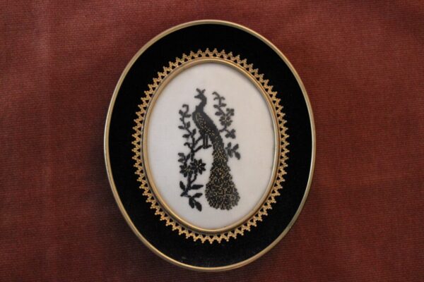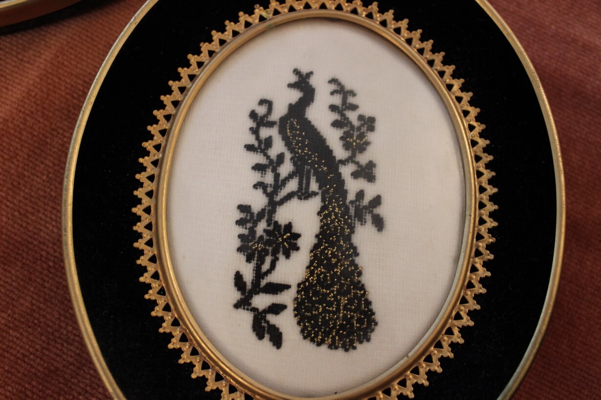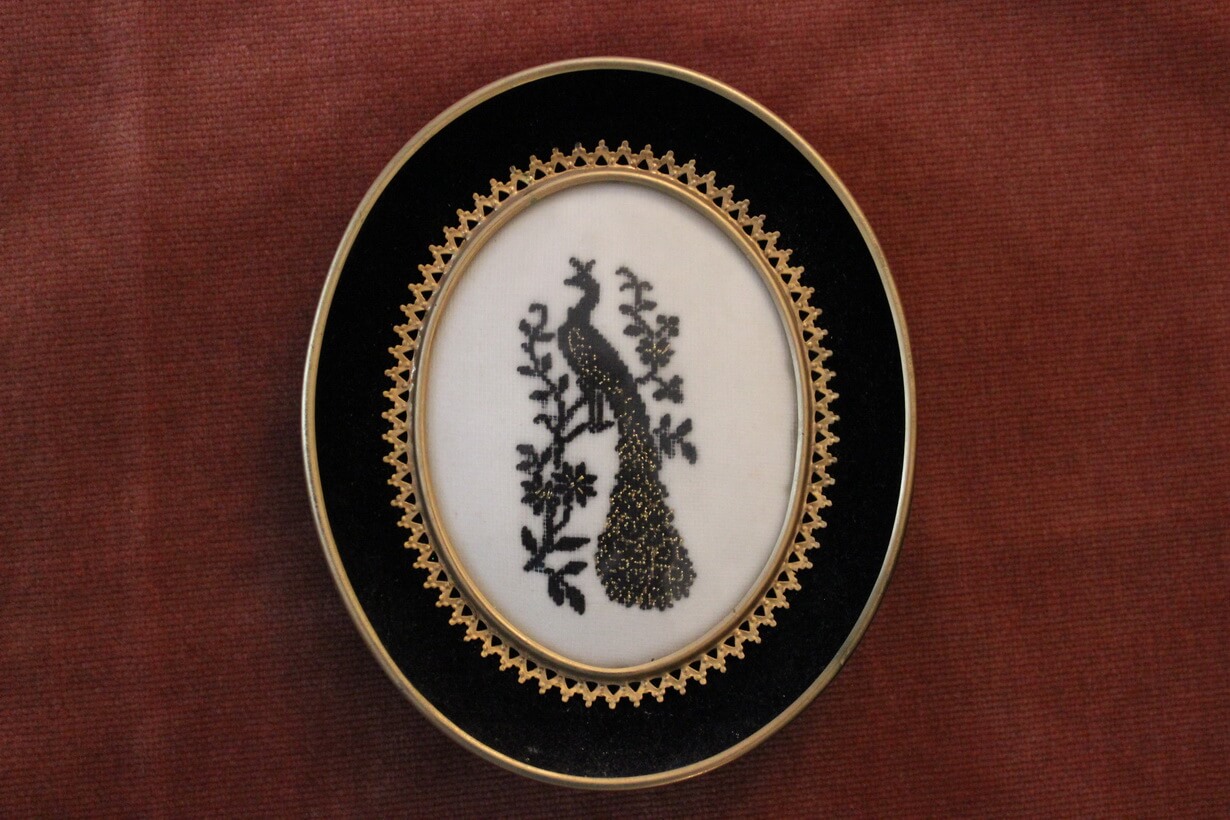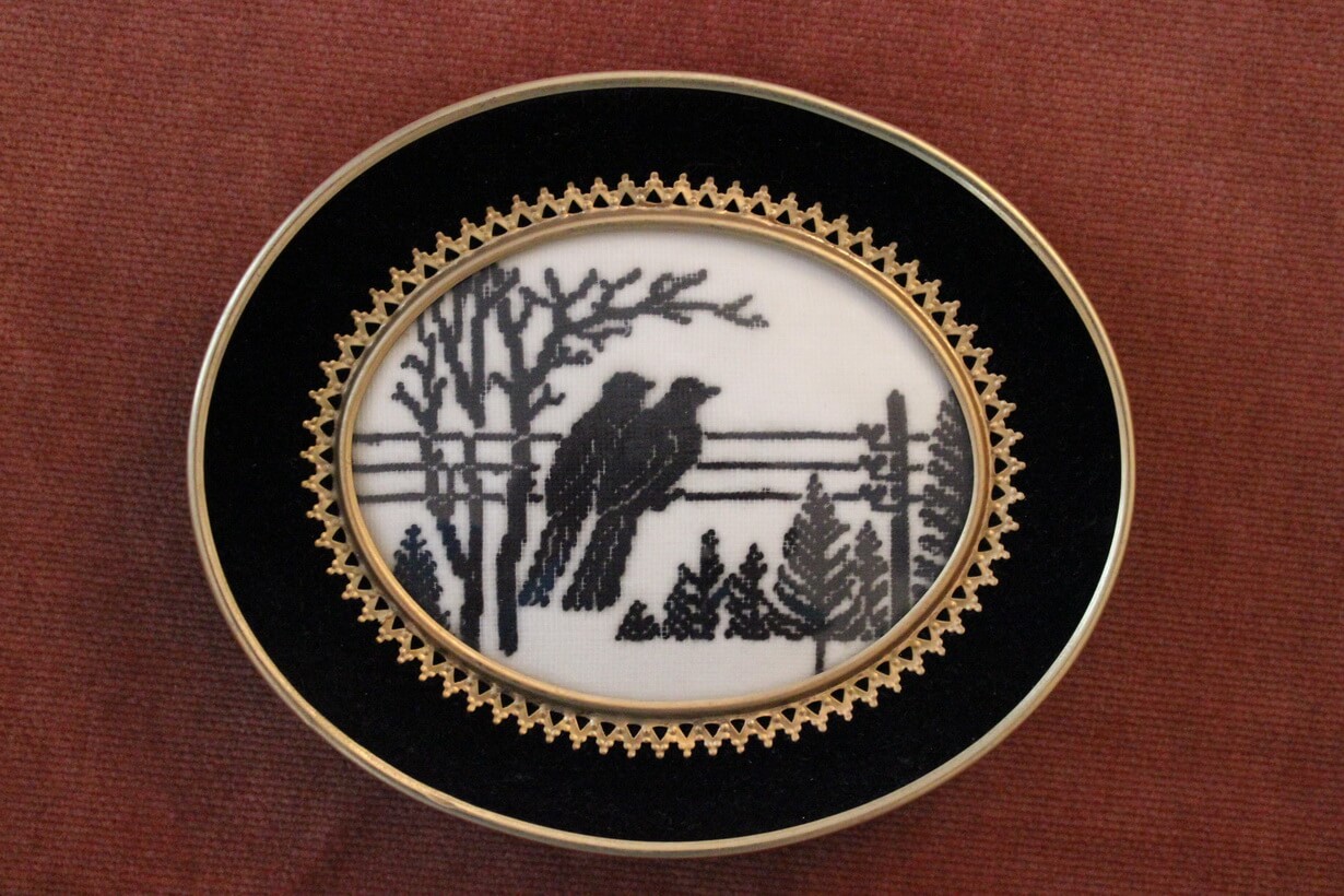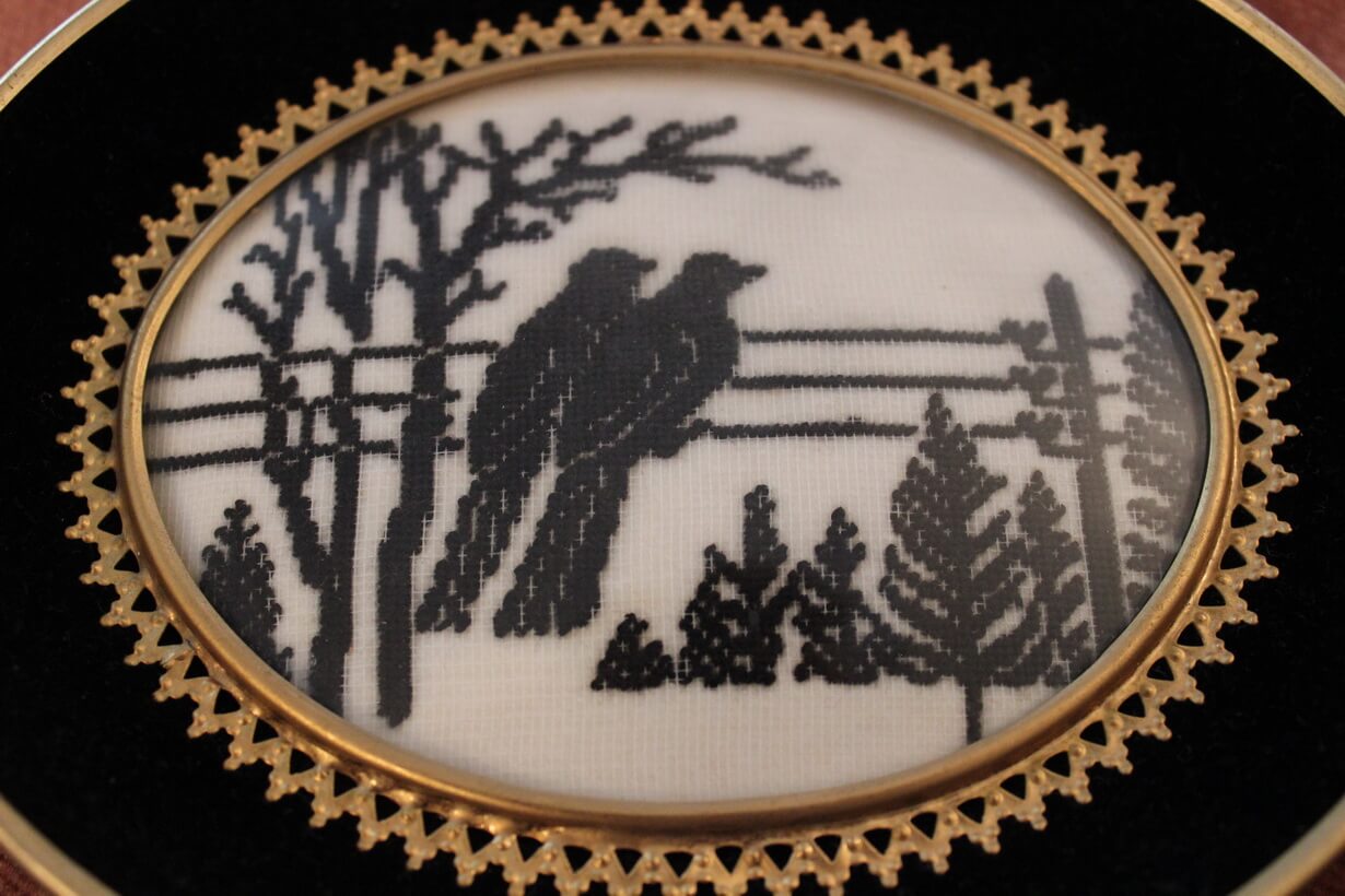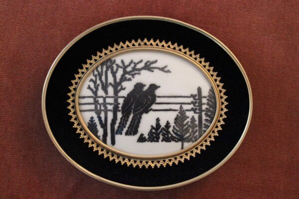 The canvas is Gobelin. The design motif was sourced from a magazine. The stitch is half Gobelin stitch.