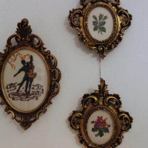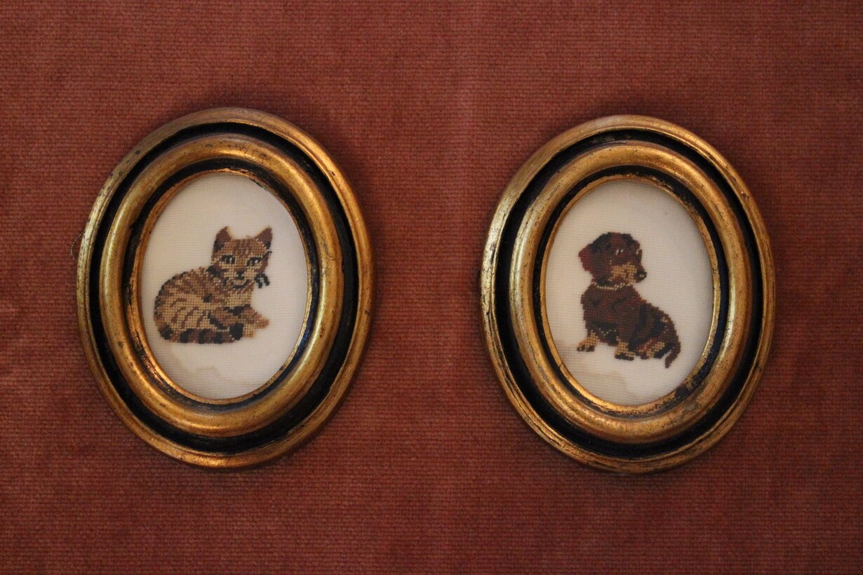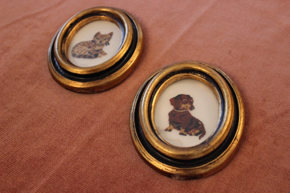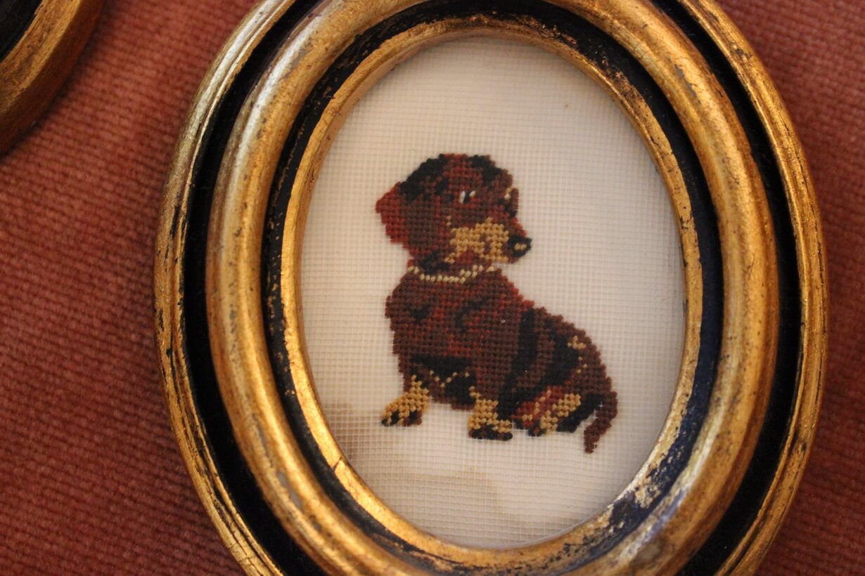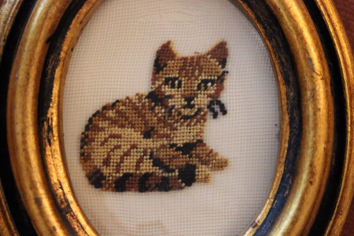 The canvas is Gobelin. The design motif was sourced from a magazine. The stitch is half Gobelin stitch.