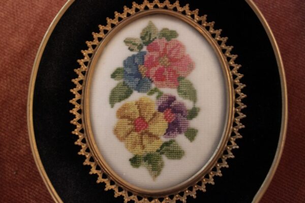 The canvas is Gobelin. The design motif was sourced from a magazine. The stitch is half Gobelin stitch.