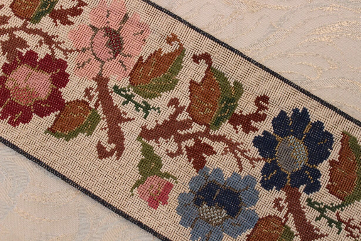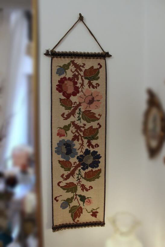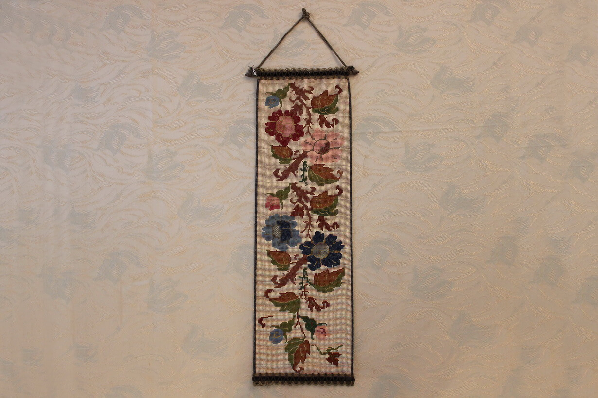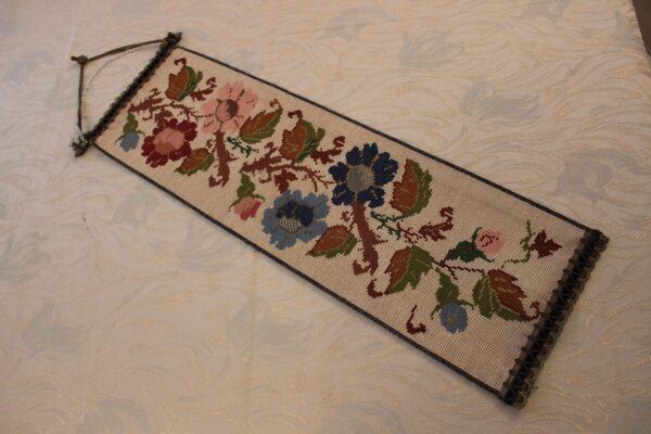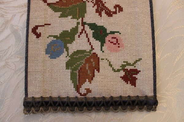 The canvas is medium. The design motif was sourced from a magazine and is a repeating pattern done in cross-stitch.