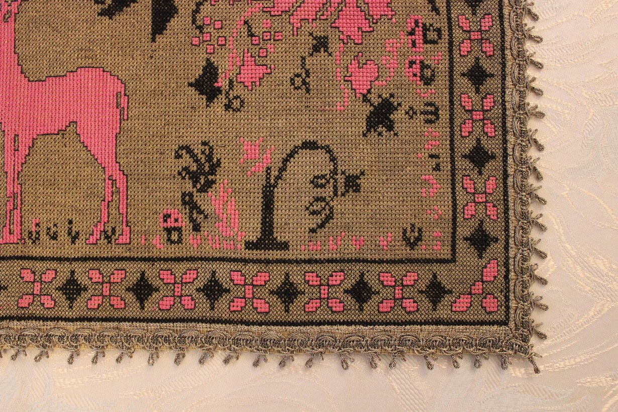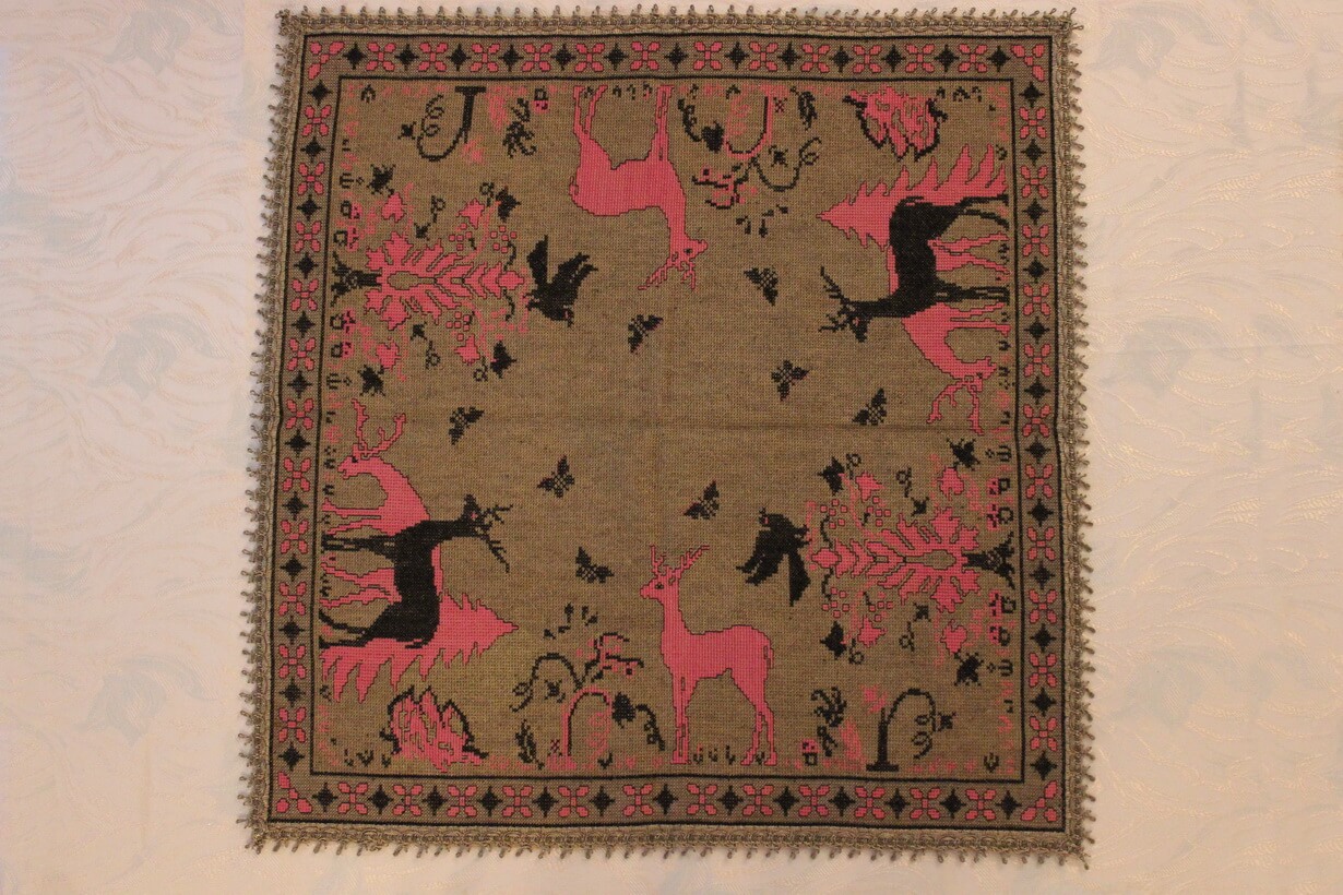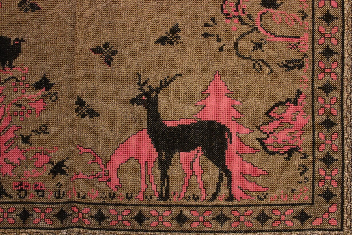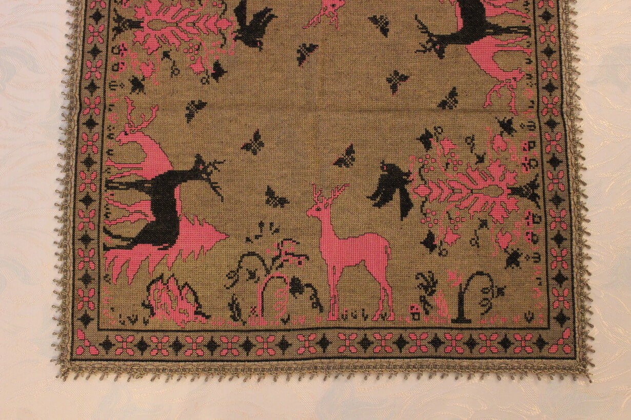 The canvas is medium. The design motif was sourced from a magazine combined with improvisation. The improvisation involves the final placement and arrangement of the central subjects depicted (deer, plants, etc.) and their repetition. The filling is dark gold. The choice of colors was entirely personal.