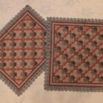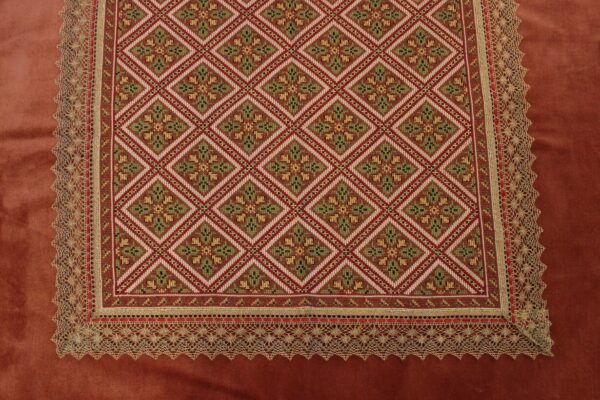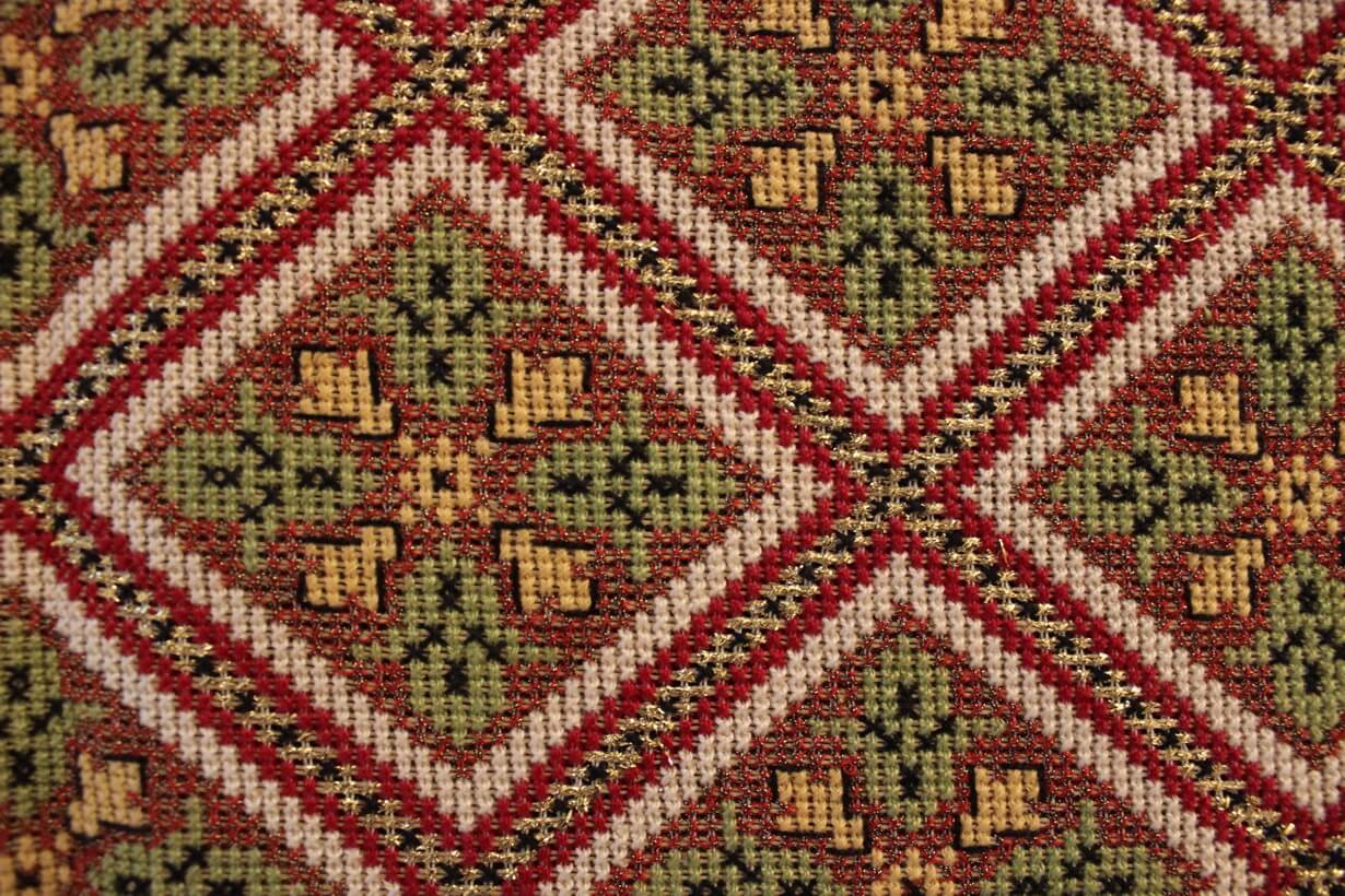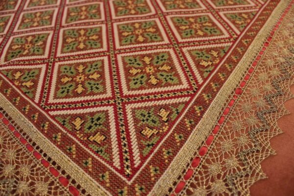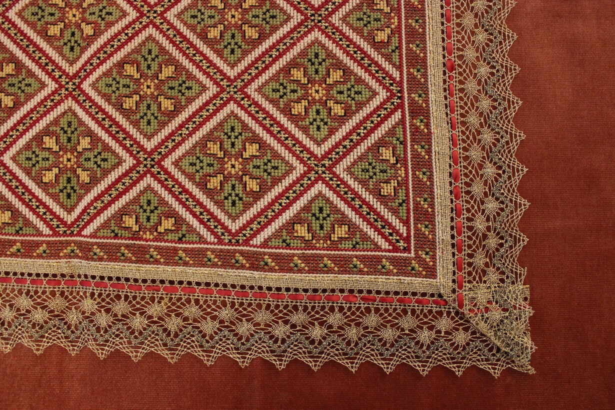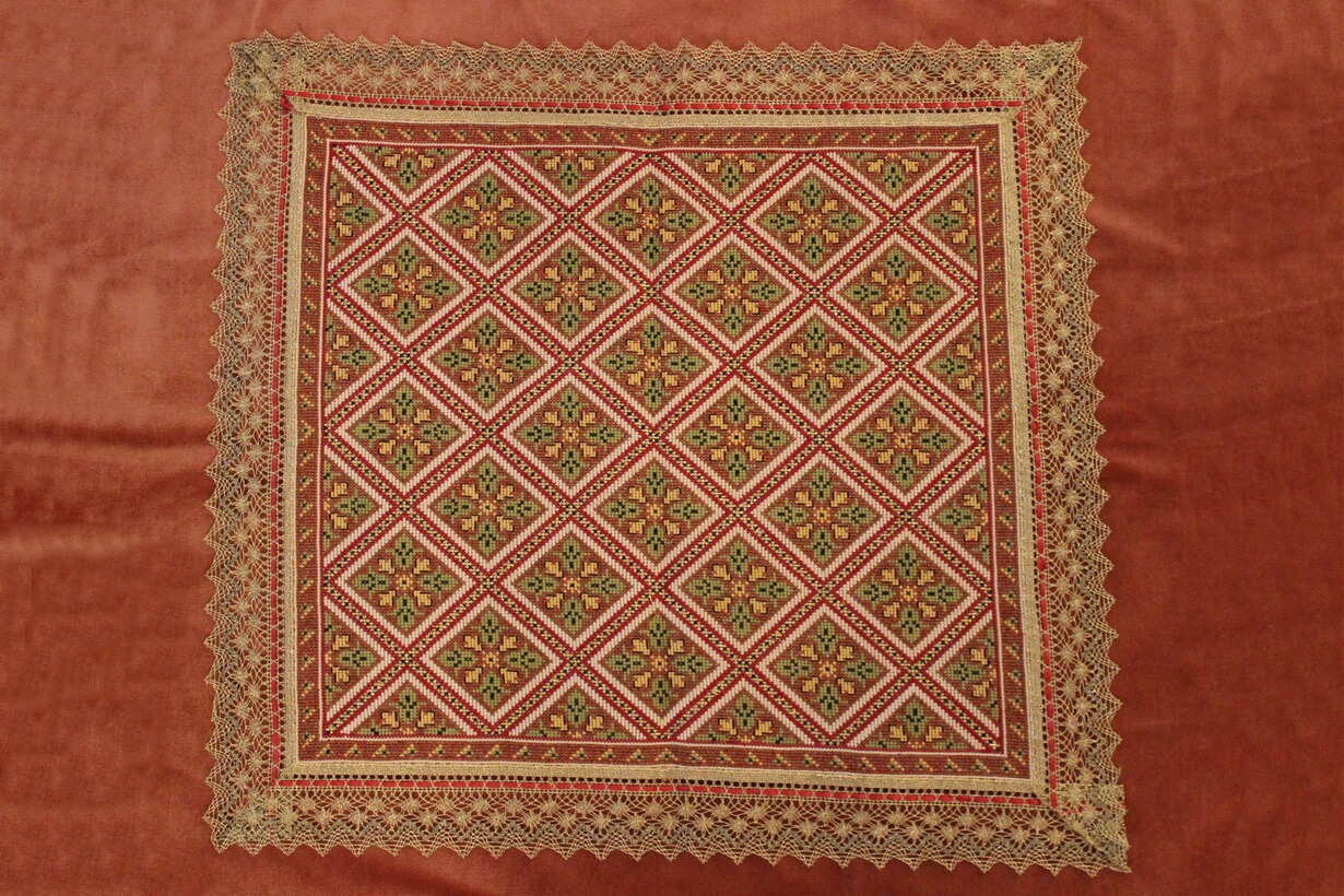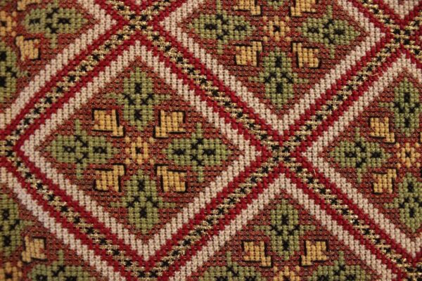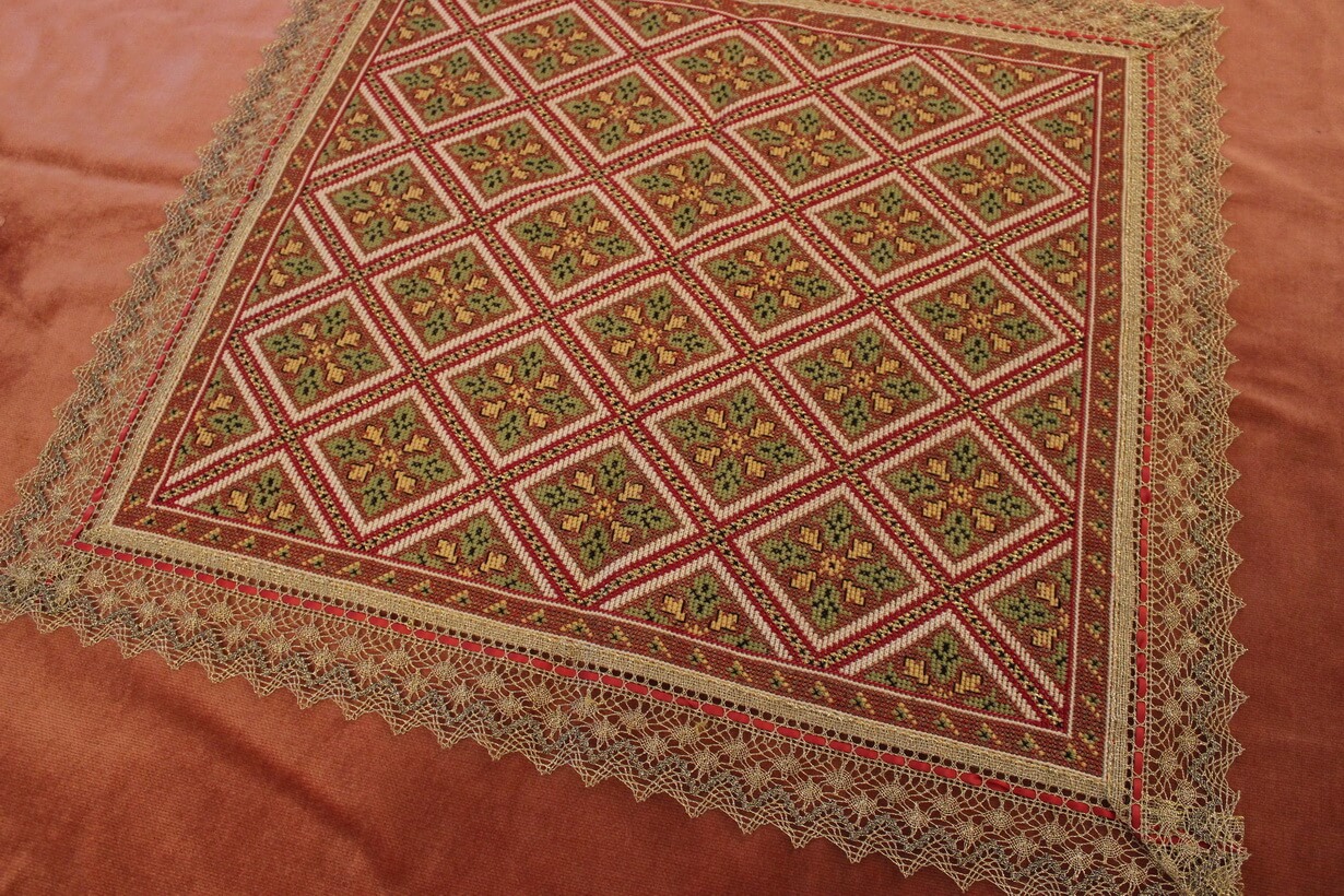 The canvas is fine. The design motif was created using a basic pattern and repetition. Cross-stitch was used. The choice of colors was personal.