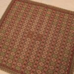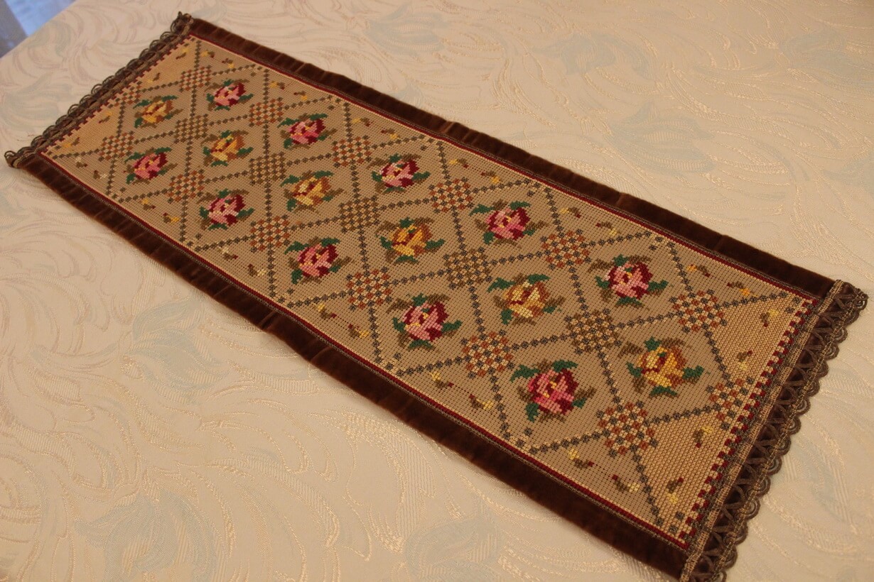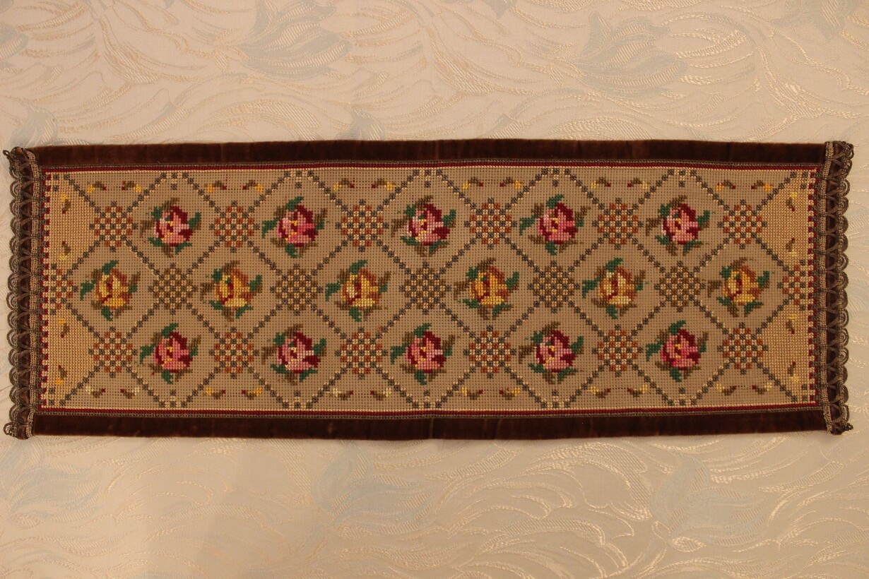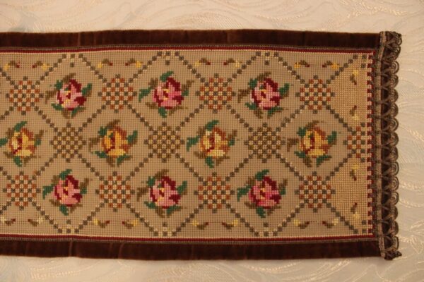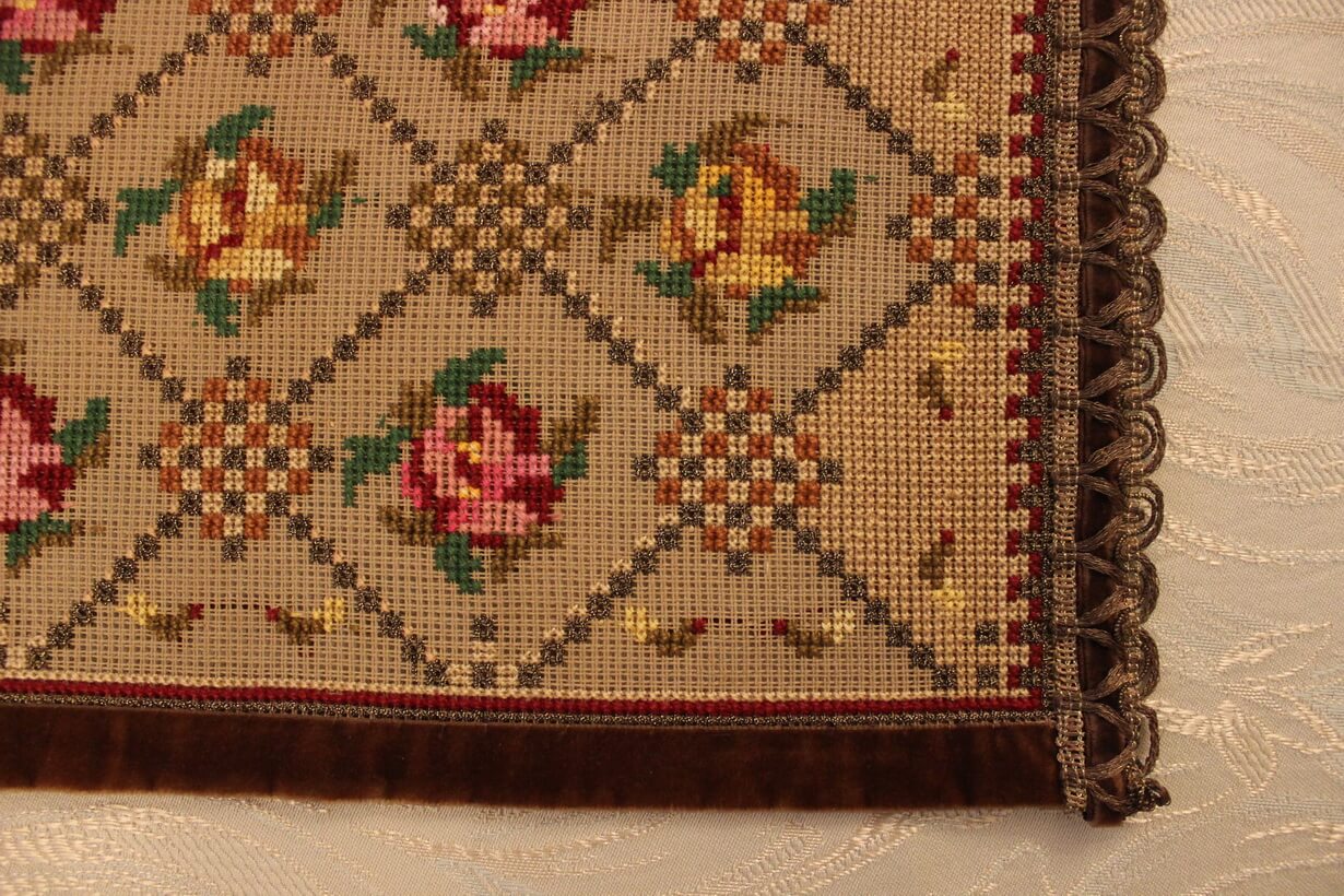 The canvas is thick. The design motif was created using a basic pattern and repetition. It used only leftover threads as well as leftover canvas remaining from a previous work (stash busting).
