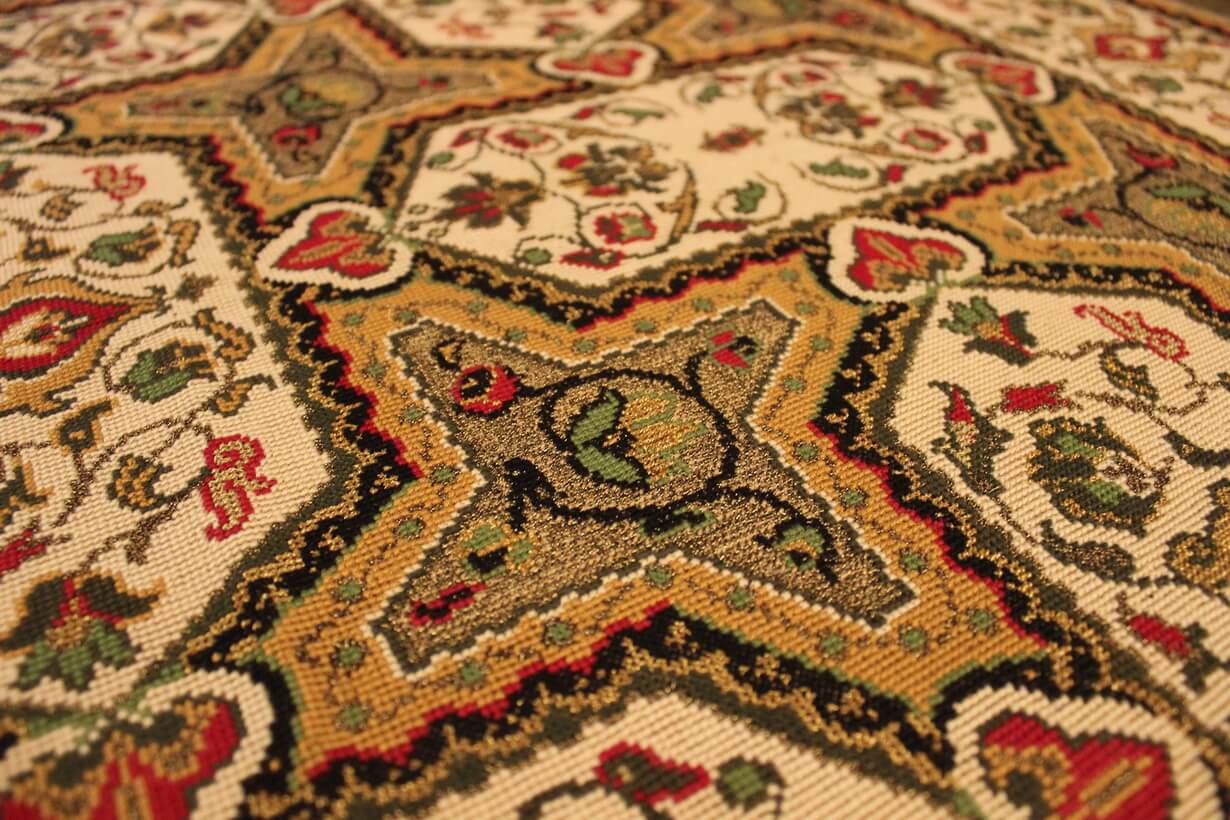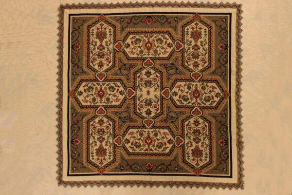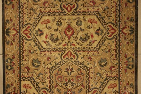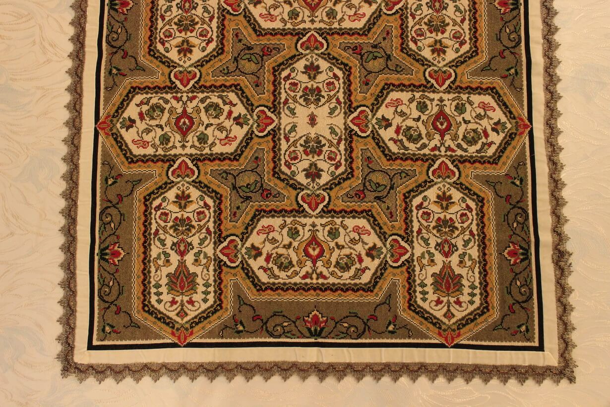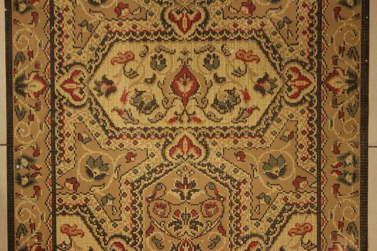The design came from a careful analysis of a printed plastic hallway runner and was then transferred into embroidery.
