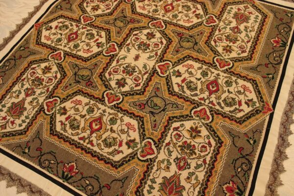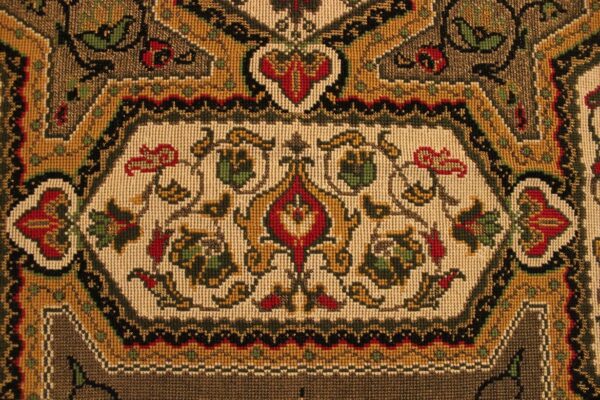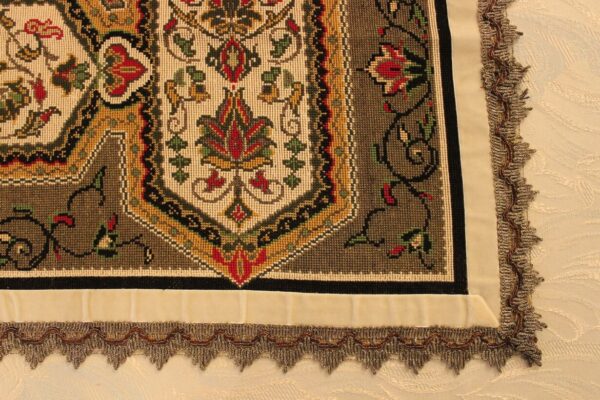 The canvas is fine. The design is the result of composition. Cross-stitch was used. The filling is done with dark gold thread.