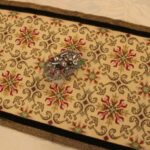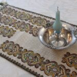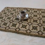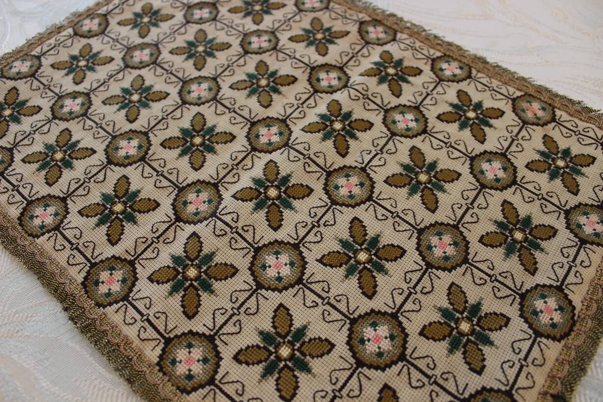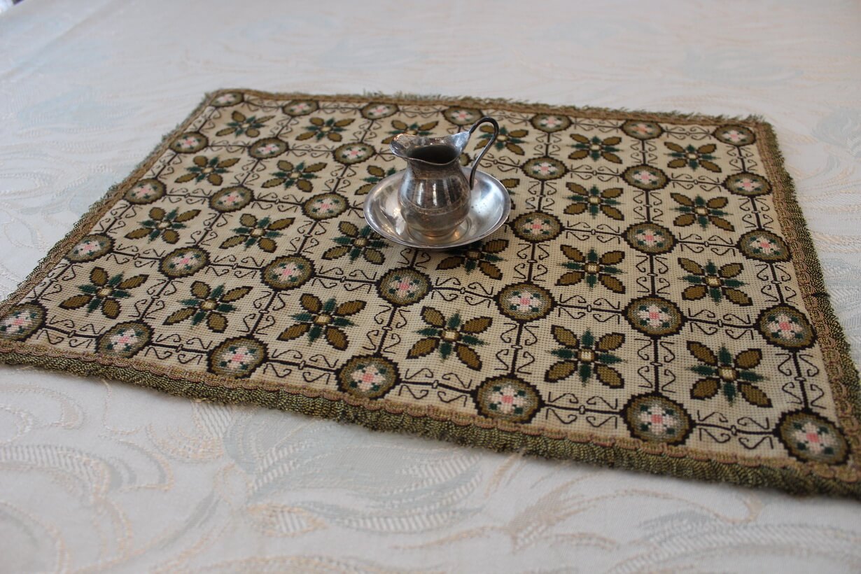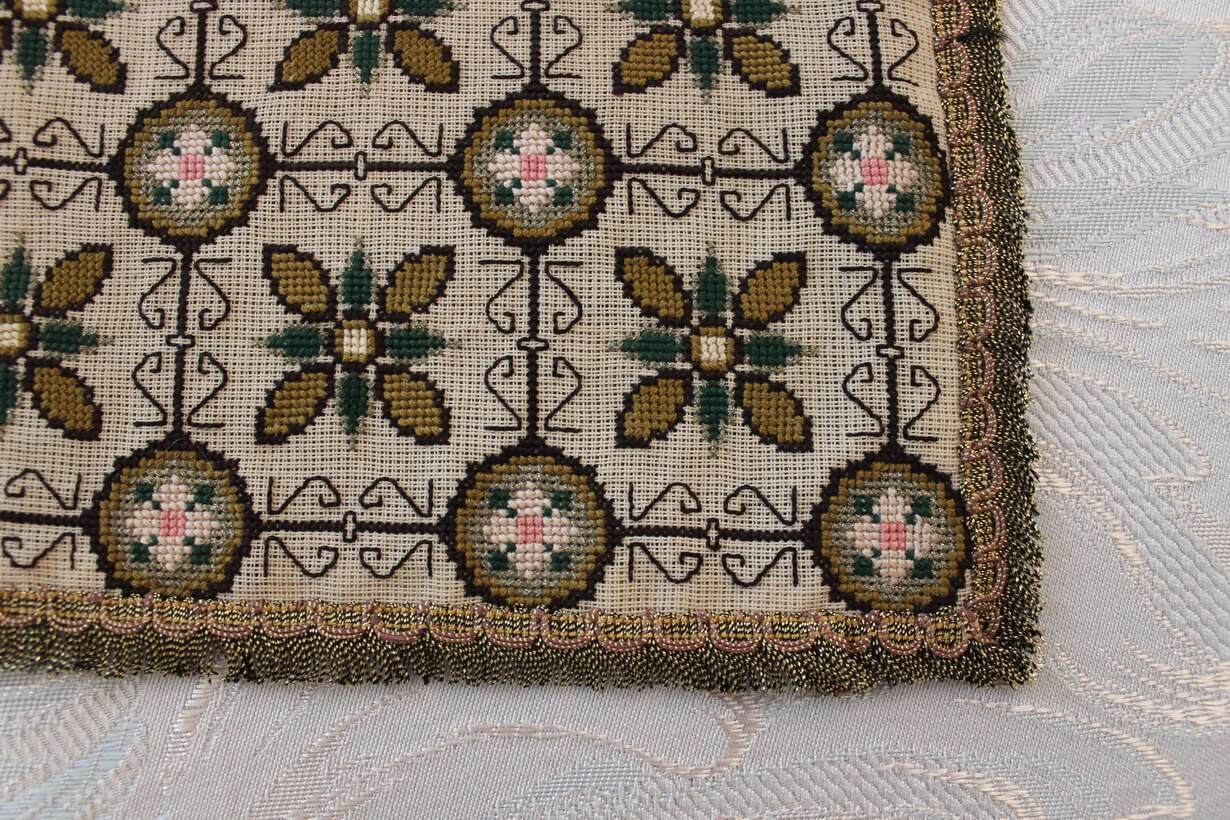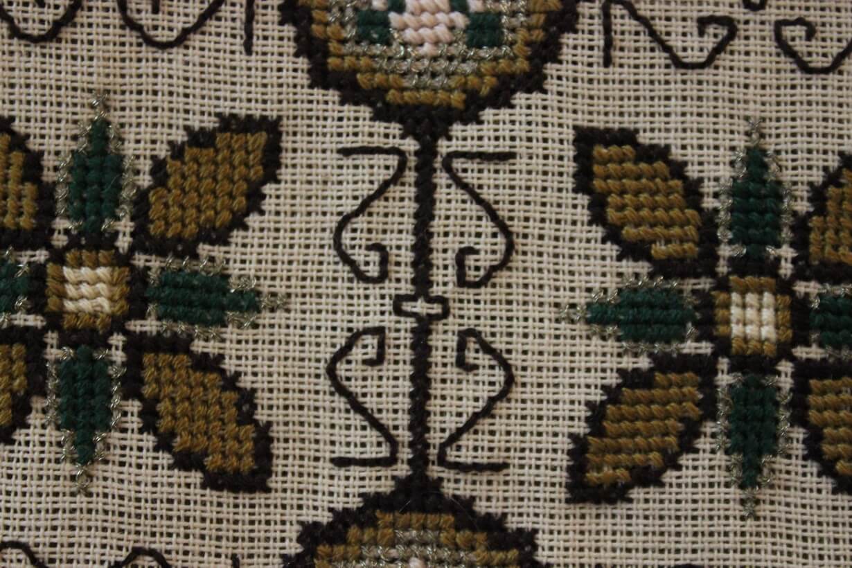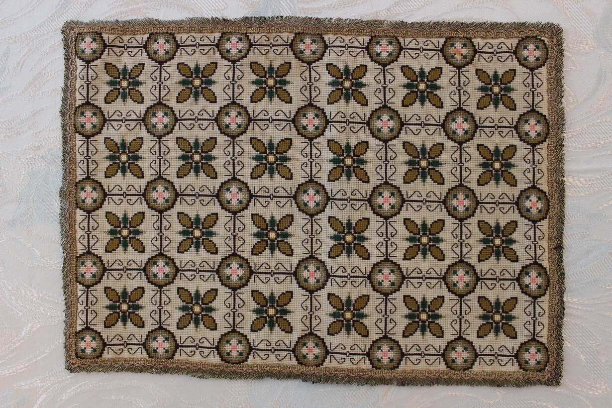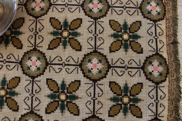 The canvas is fine. The design motif was sourced from a magazine and is a repeating pattern done in cross-stitch and hand topstitch.