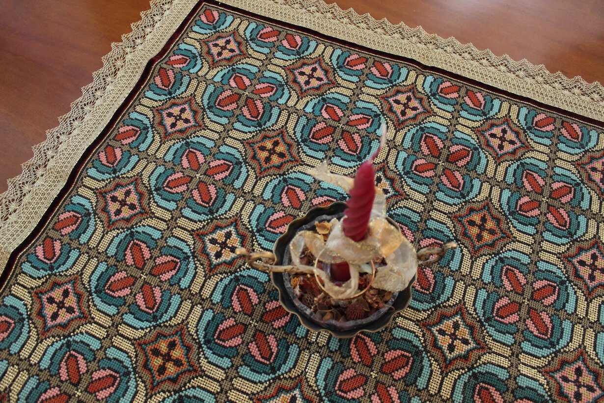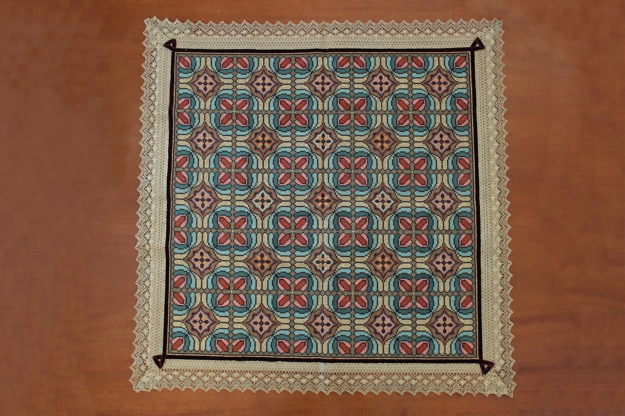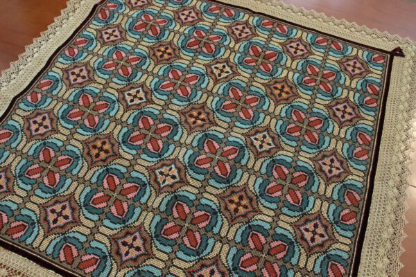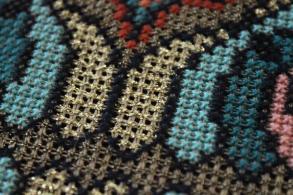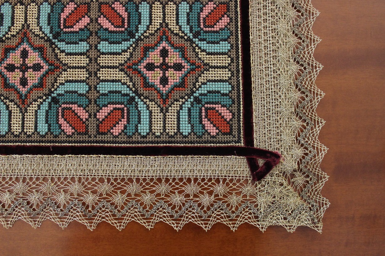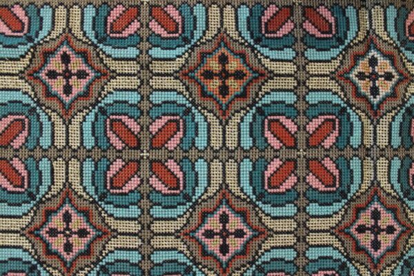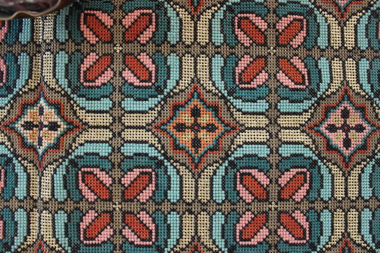 The canvas is thick. The design is the result of 100% improvisation with a repeating motif. Cross-stitch was used with dark gold and gold thread.