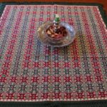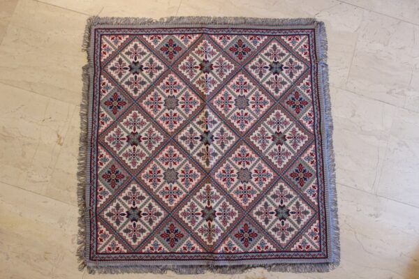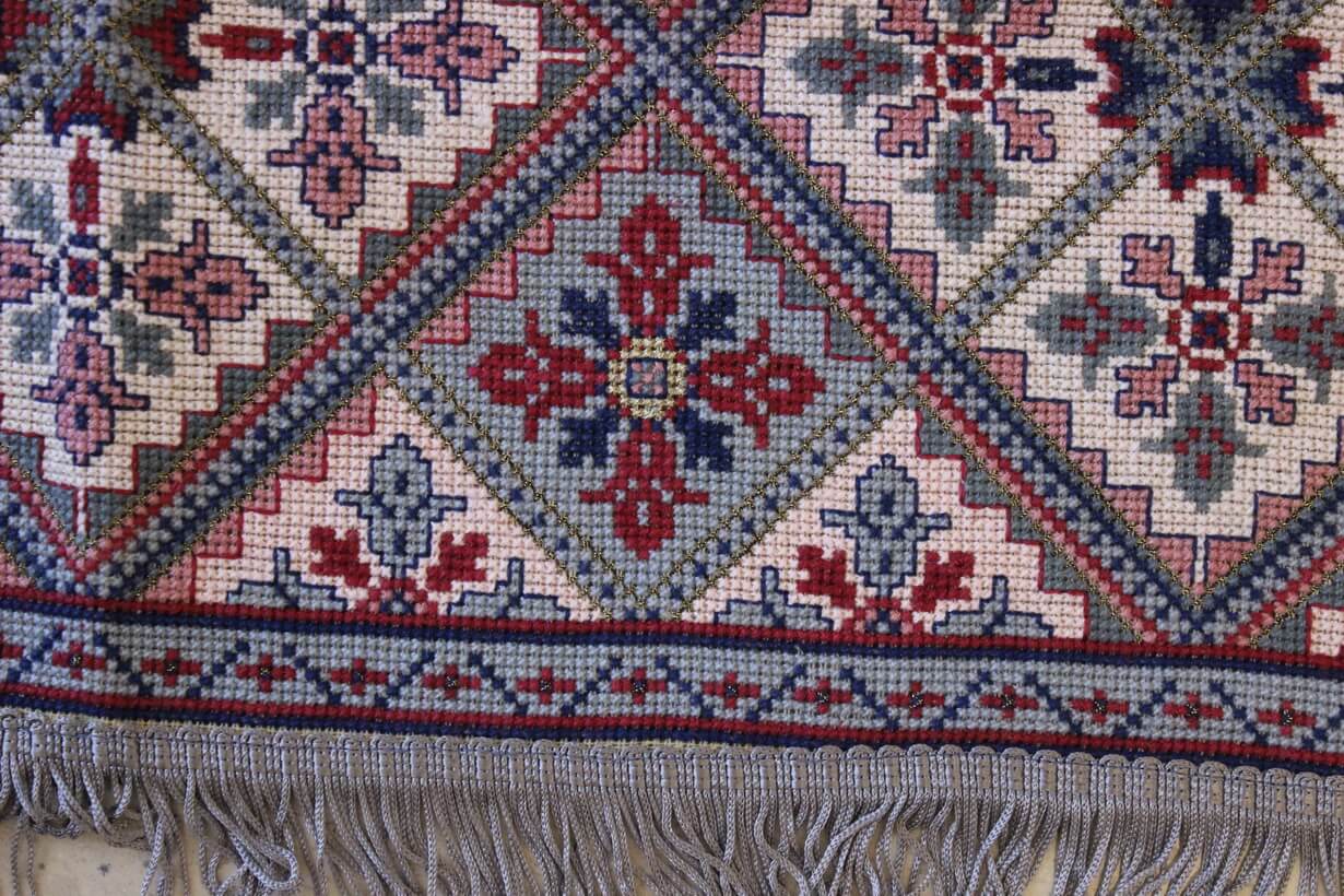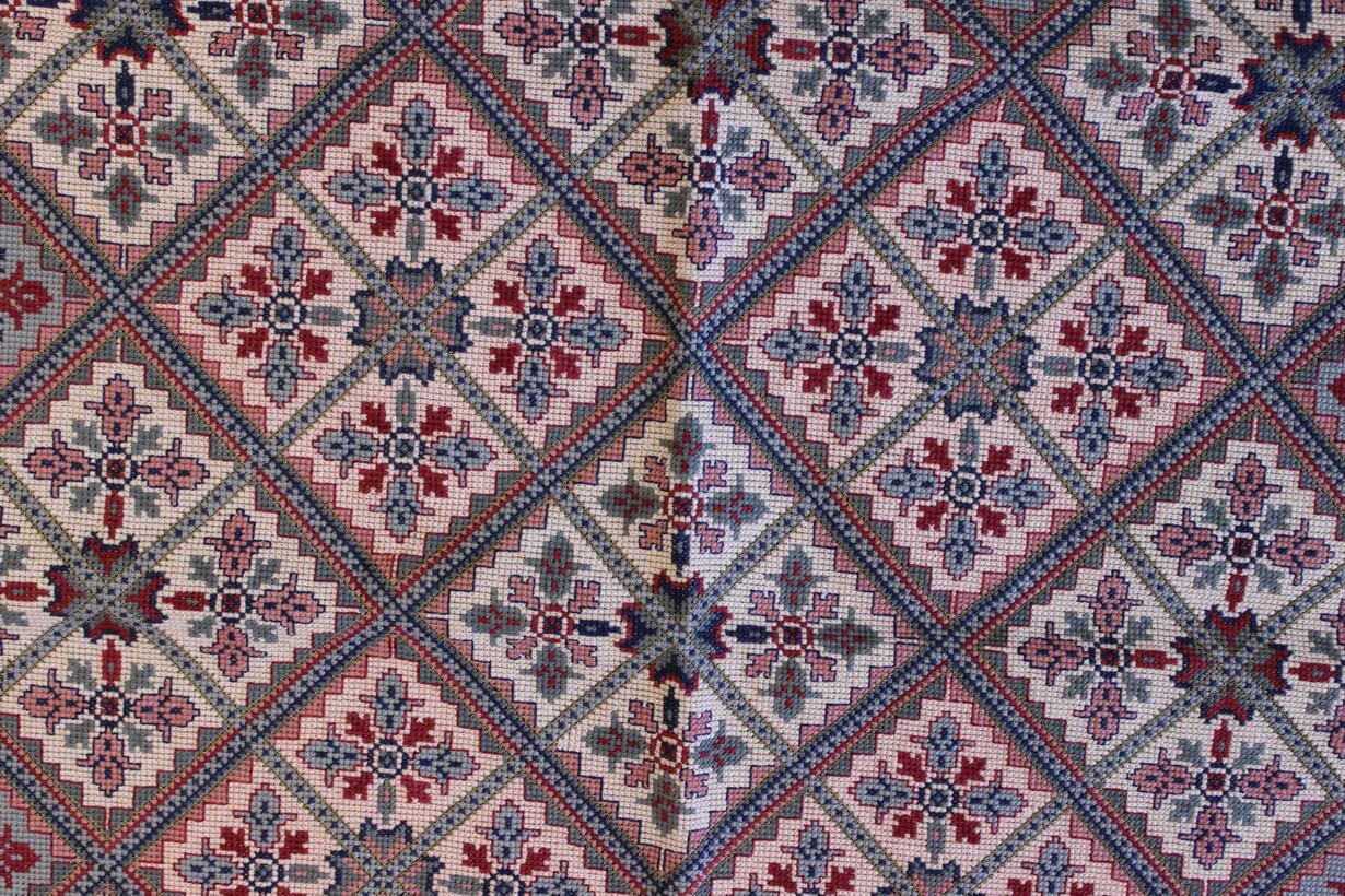 The canvas is fine. The design motif was created through the use of a basic motif and repetition. A combination of cross-stitch and topstitch was used.