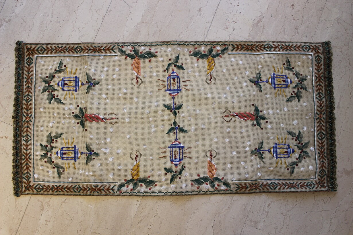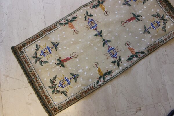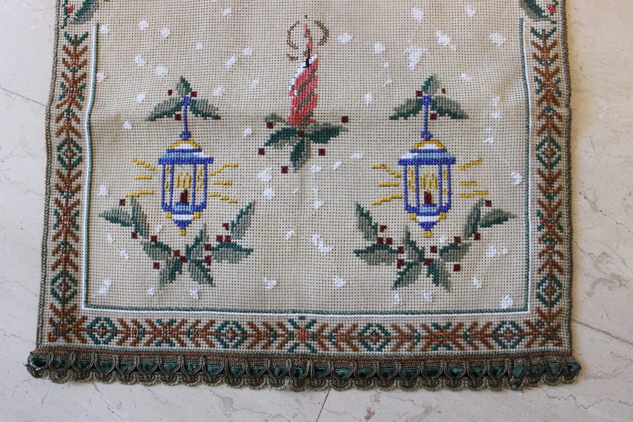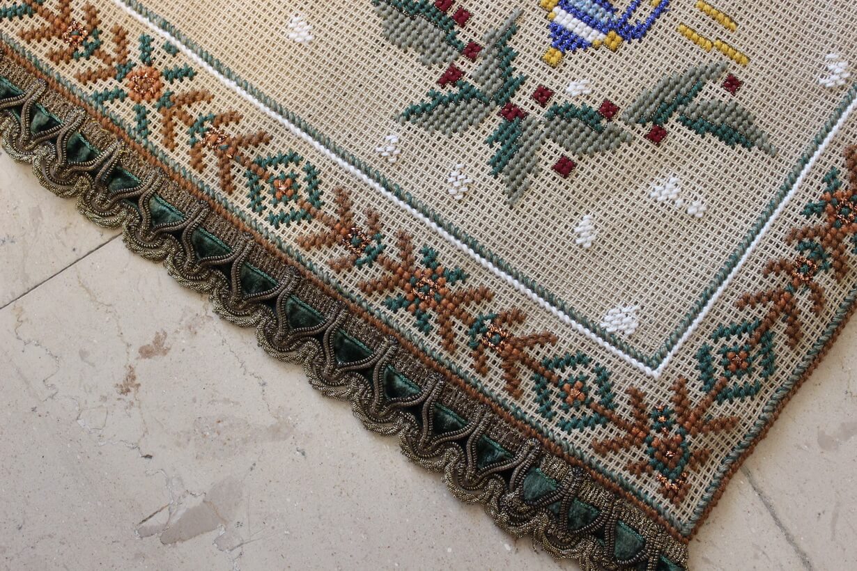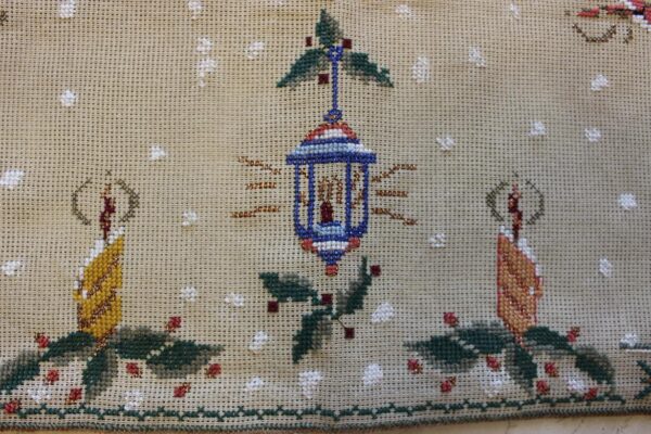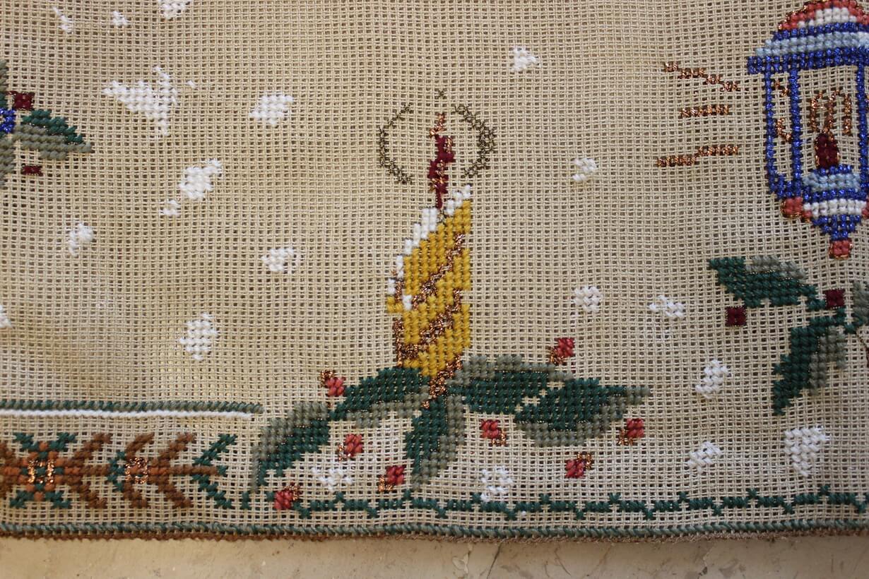 The canvas is medium. The design motif was created through the use of a basic motif and composition. Cross-stitch was used.