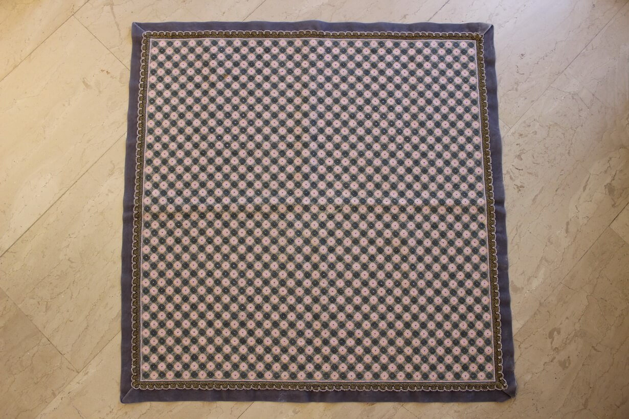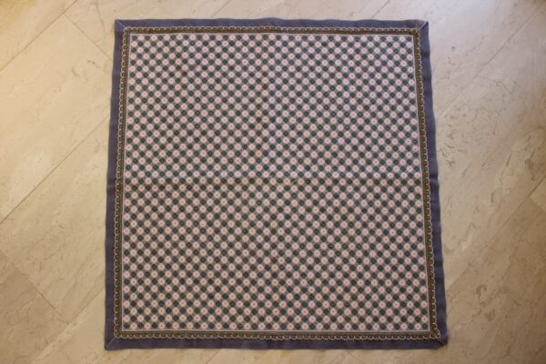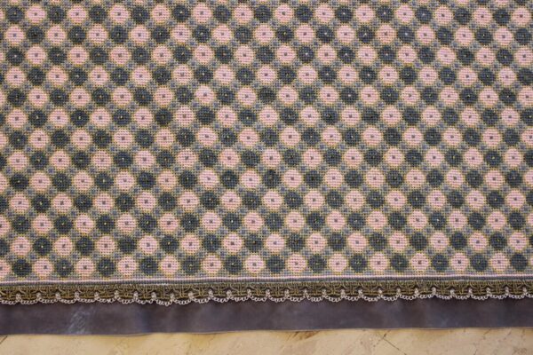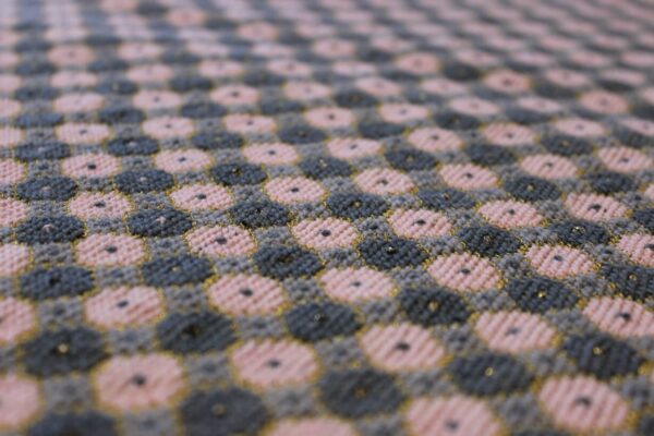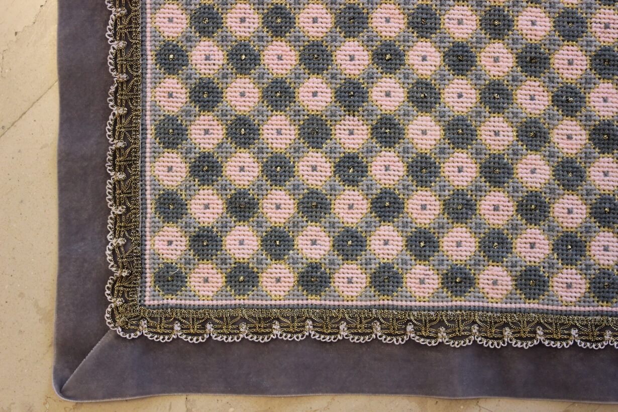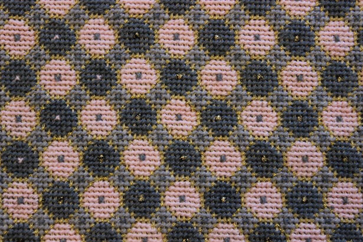 The canvas is fine. The design motif was created through the use of a basic motif and repetition. Cross-stitch was used.