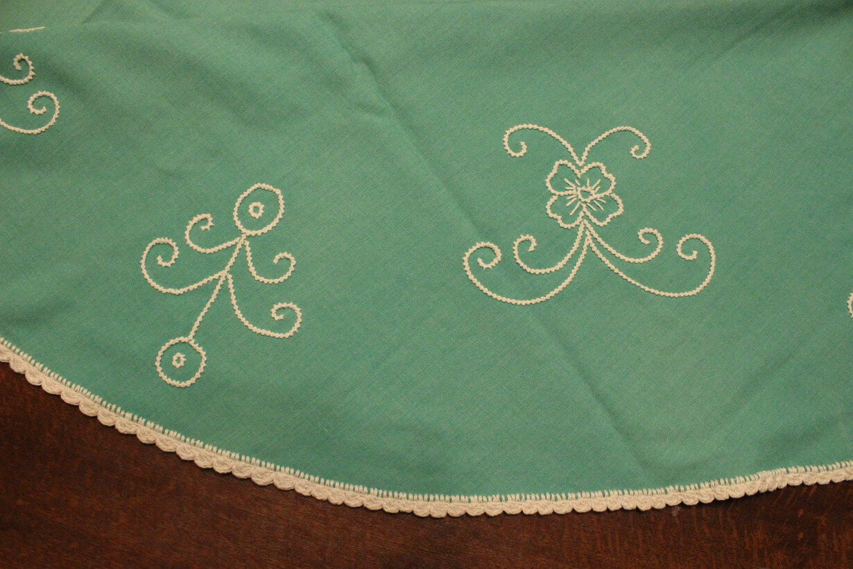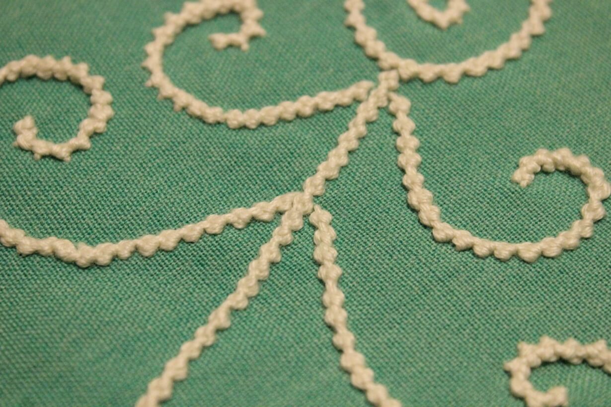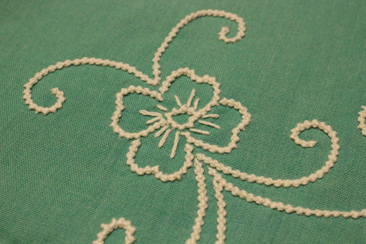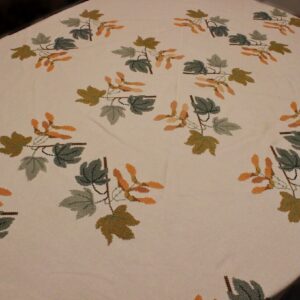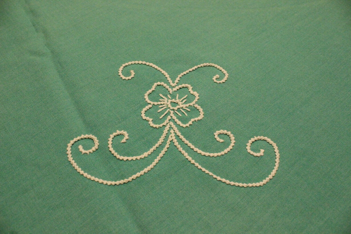 The fabric is linen for a tablecloth. The design came from improvisation and composition. French knot stitch was used.