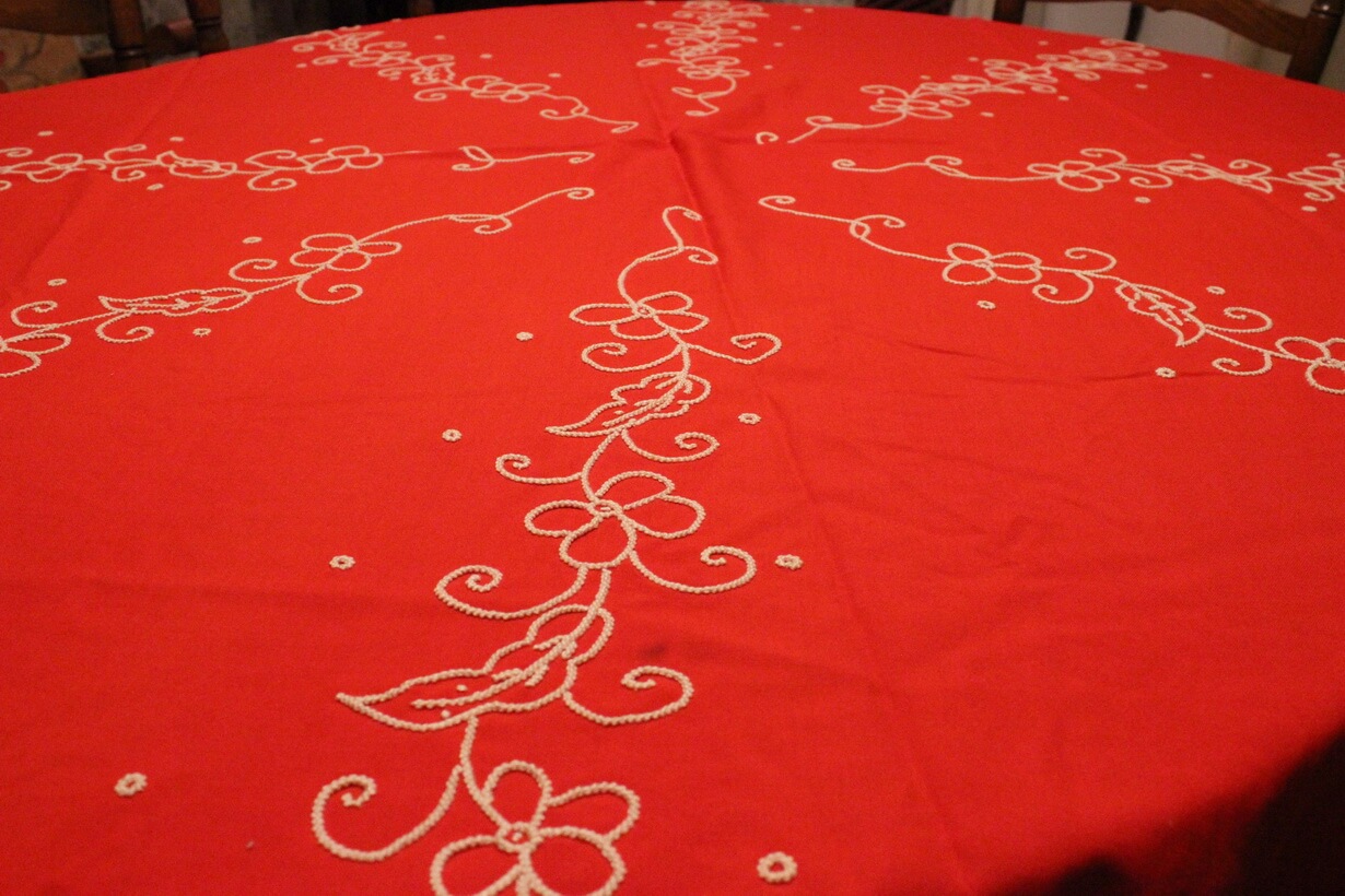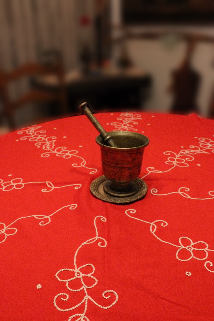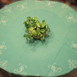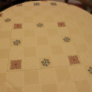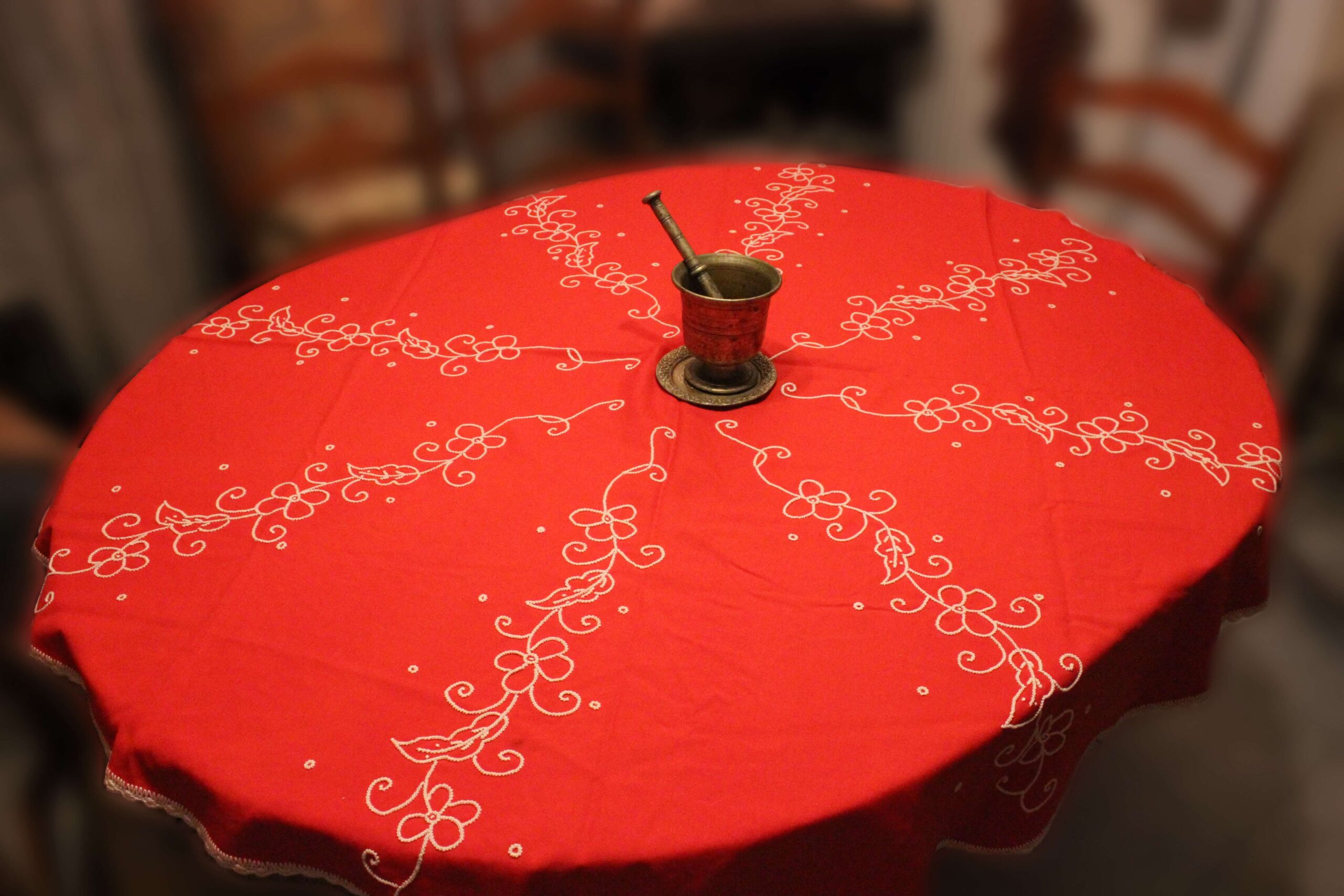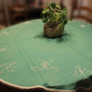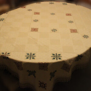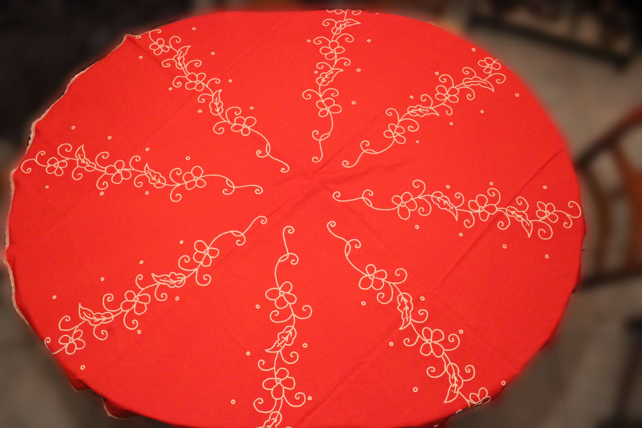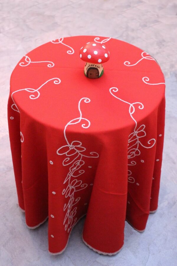 The artwork is used as a tablecloth. It has a diameter of 130cm.