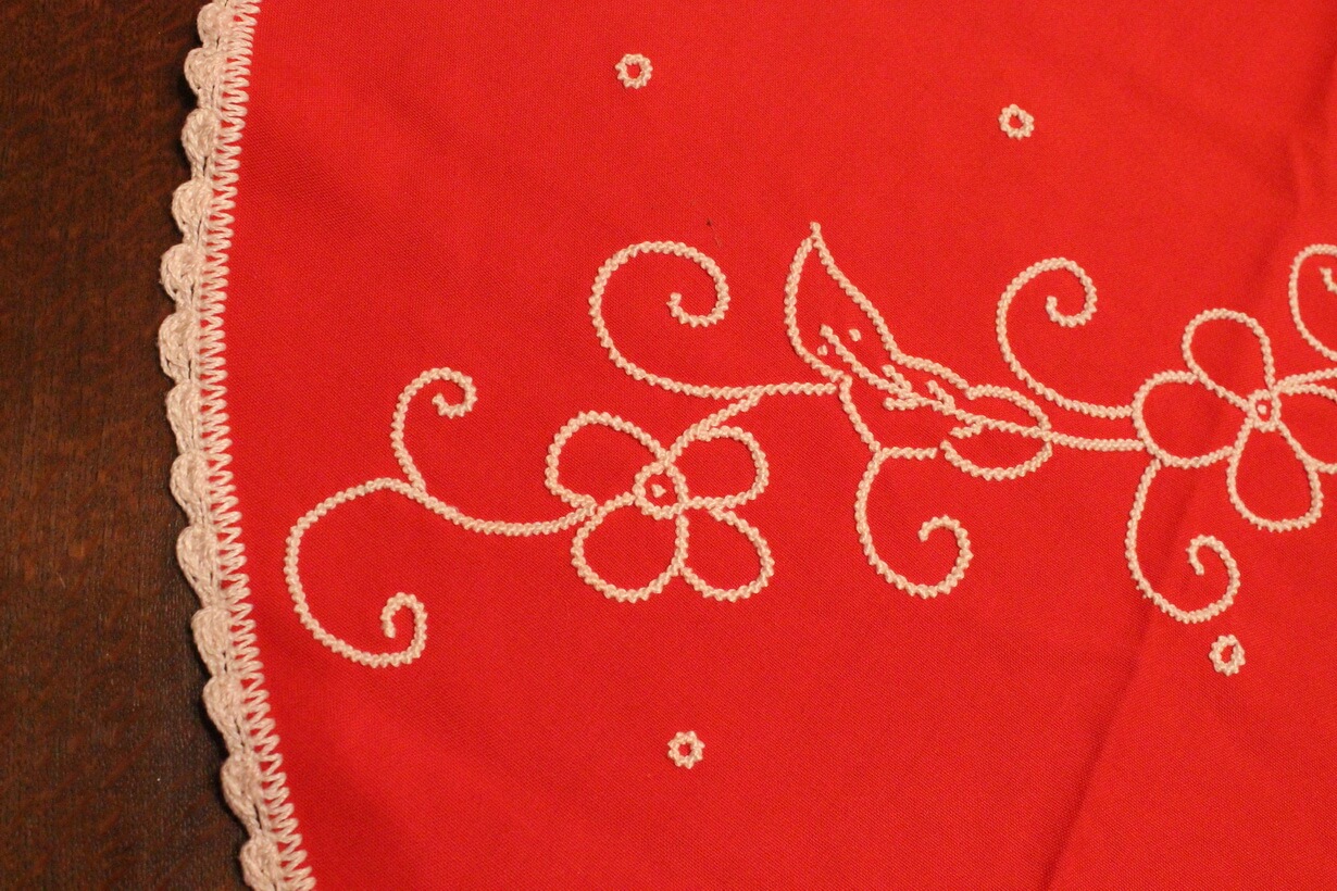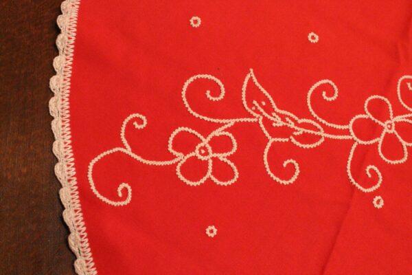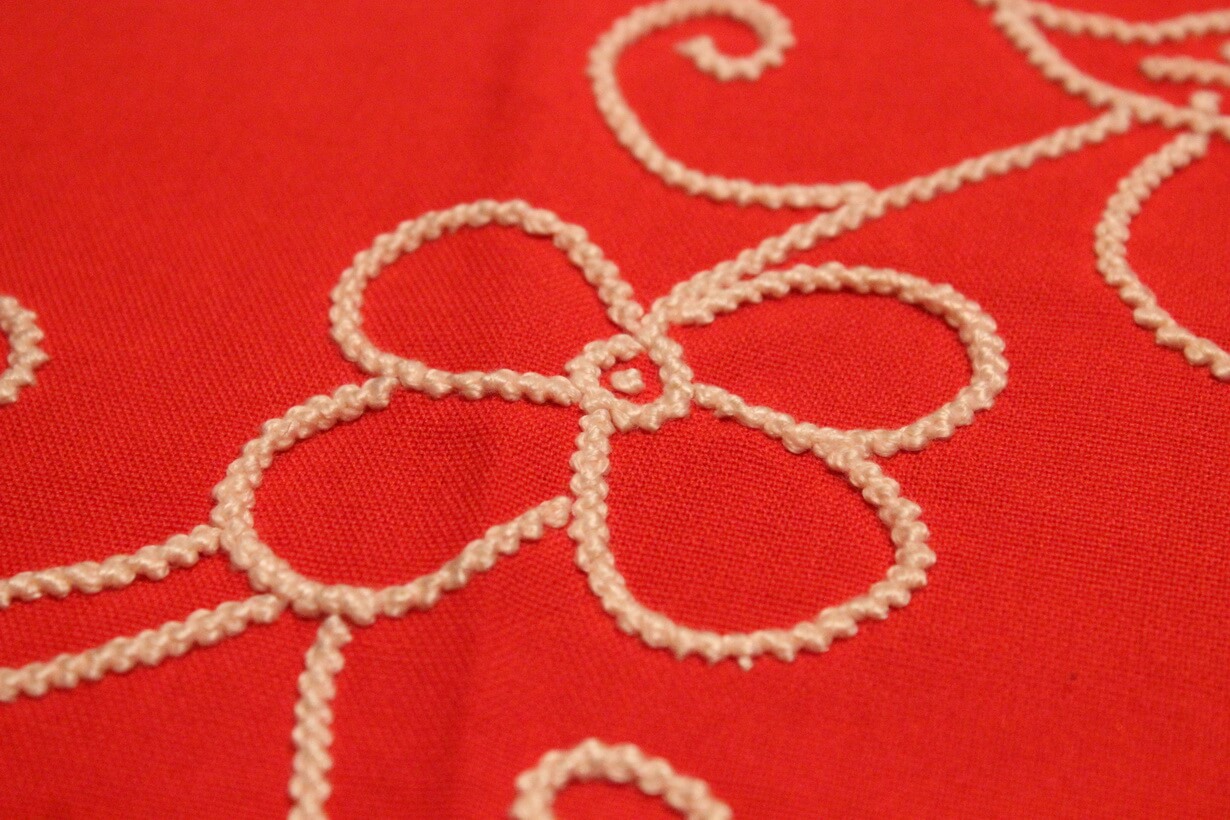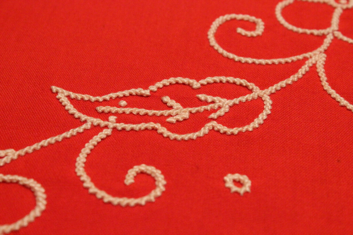 The fabric is linen for a tablecloth. The design came from improvisation and composition. French knot stitch was used.