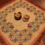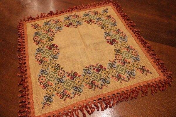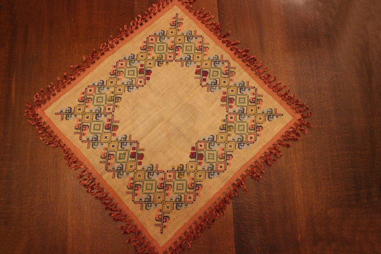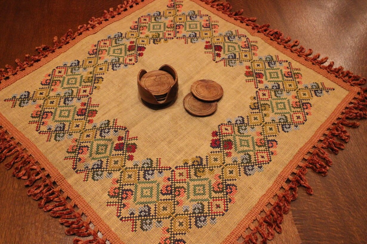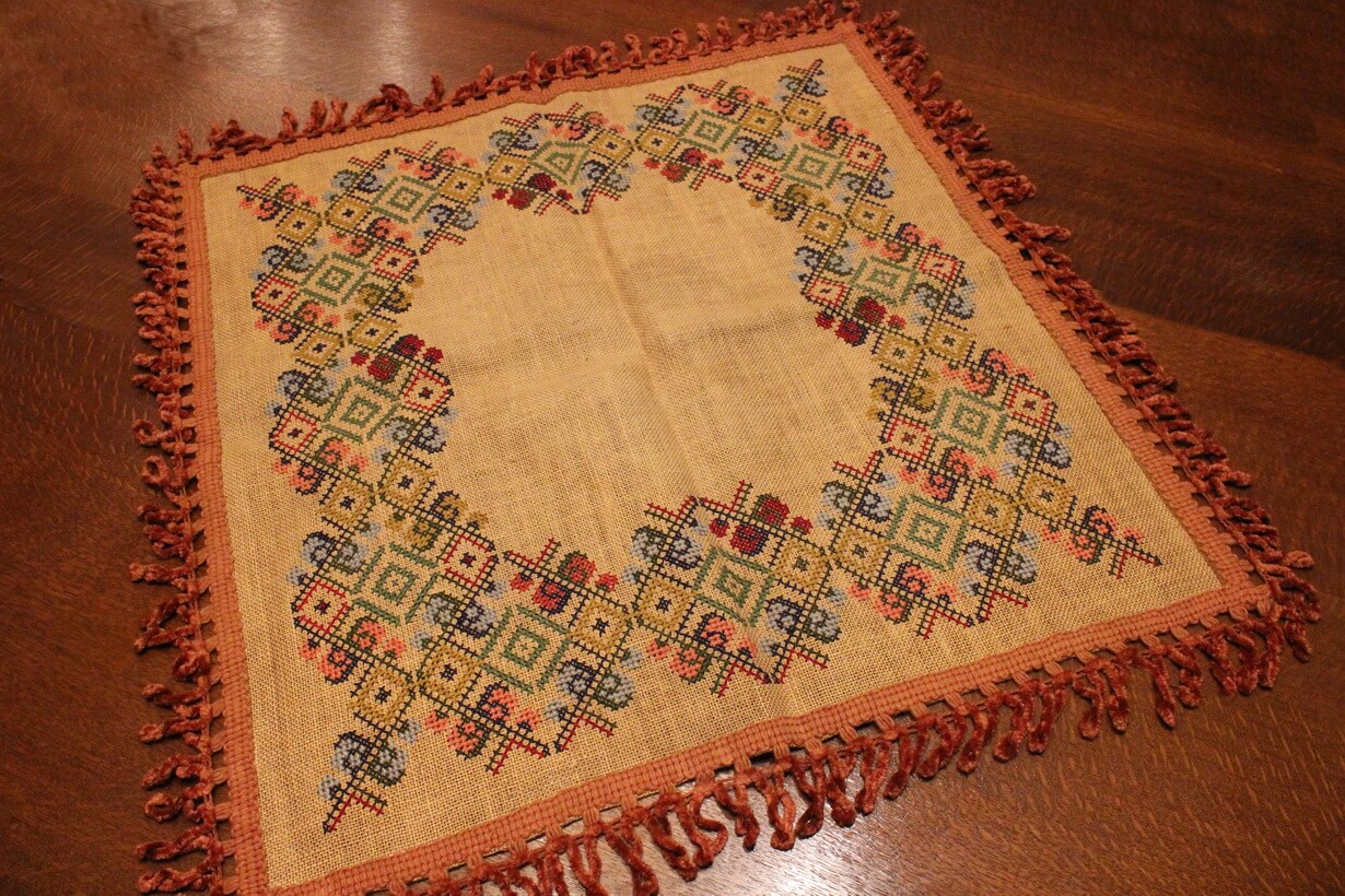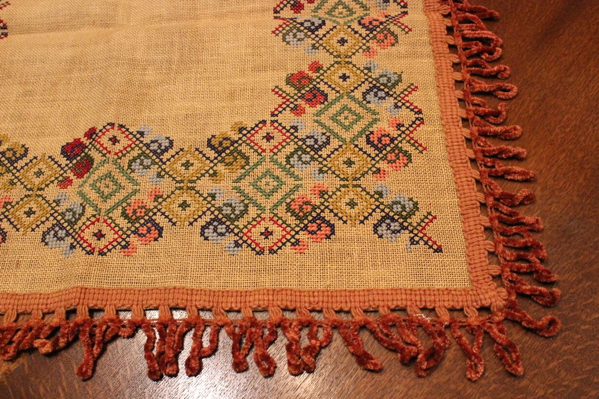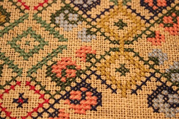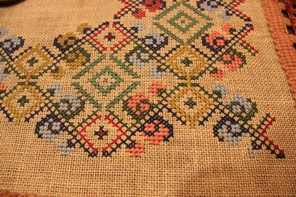 The fabric is sackcloth (Canvas Hessian). The design motif was sourced from a magazine. Cross-stitch was used. The choice of colors was personal.