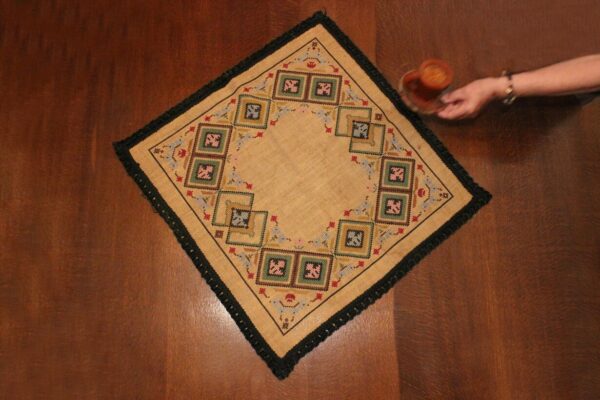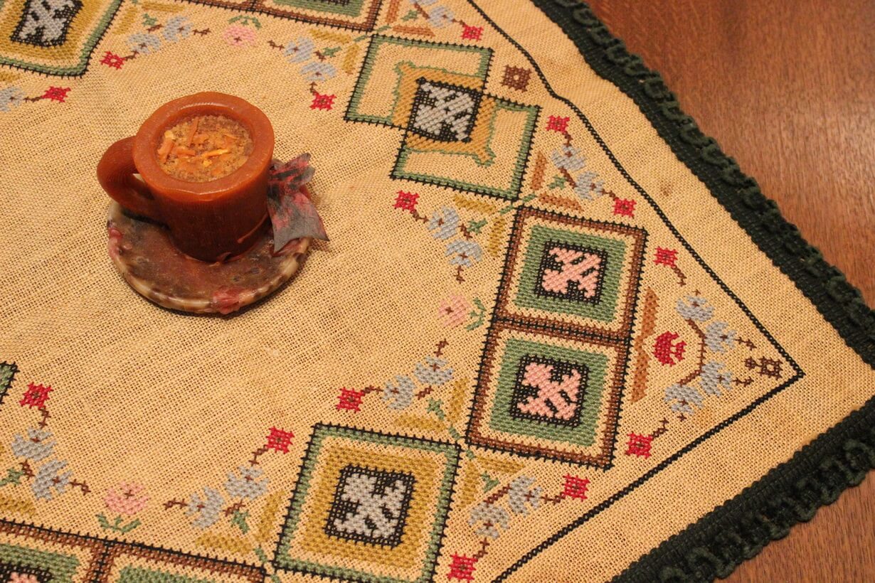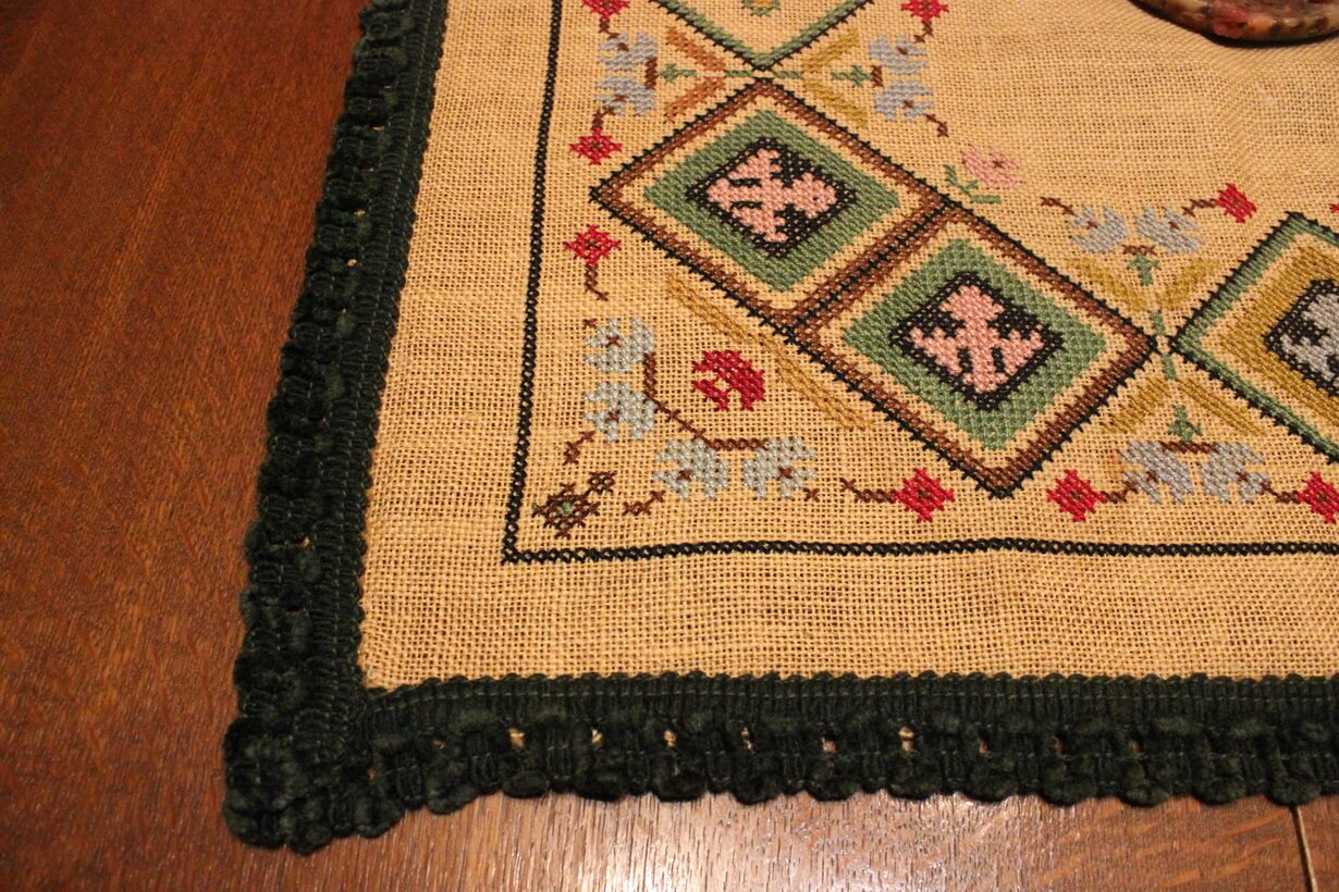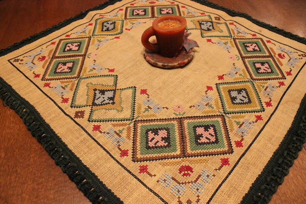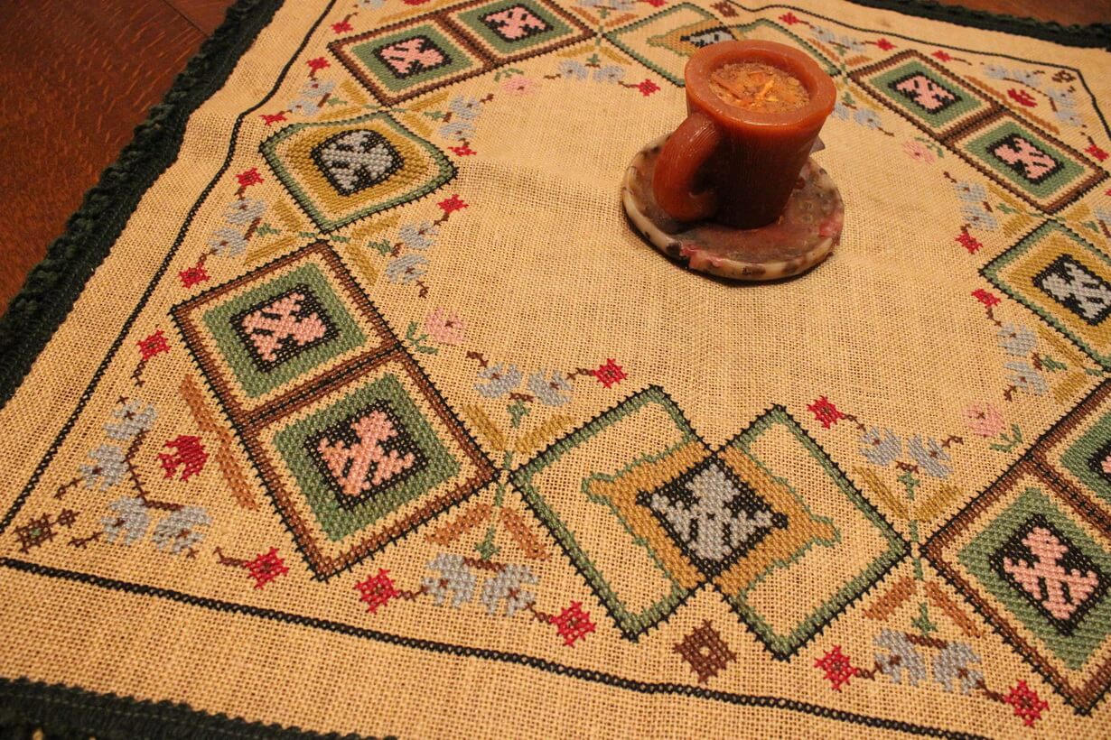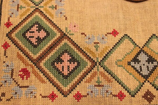 The fabric is sackcloth (Canvas Hessian). The design motif was sourced from a magazine. Cross-stitch was used. The choice of colors was personal.