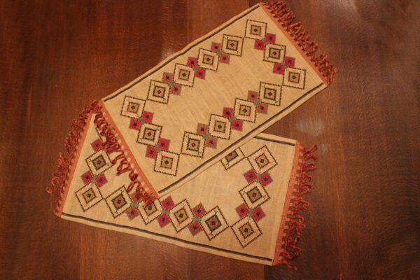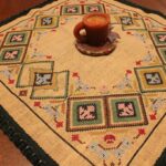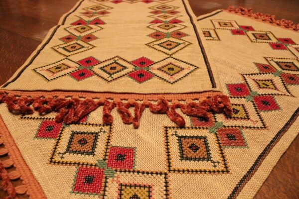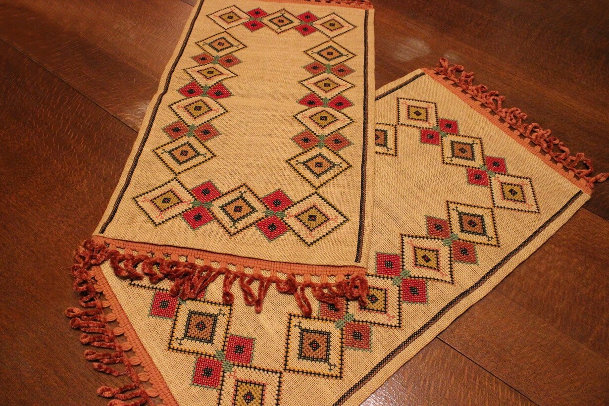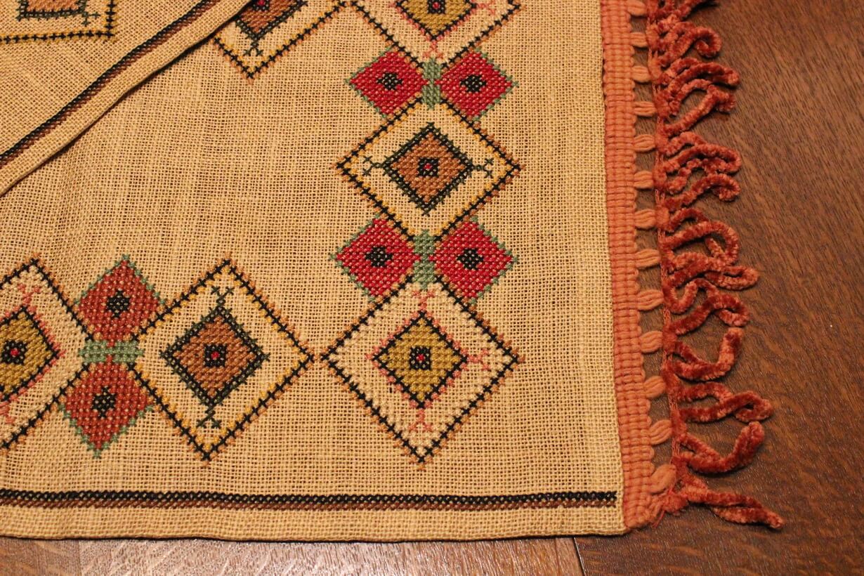 The fabric is hessian canvas (sackcloth). The design motif originated from 100% improvisation. Cross-stitch was used. The choice of colors was personal.