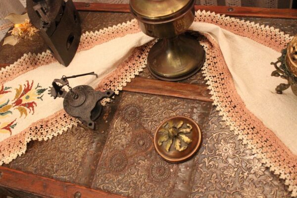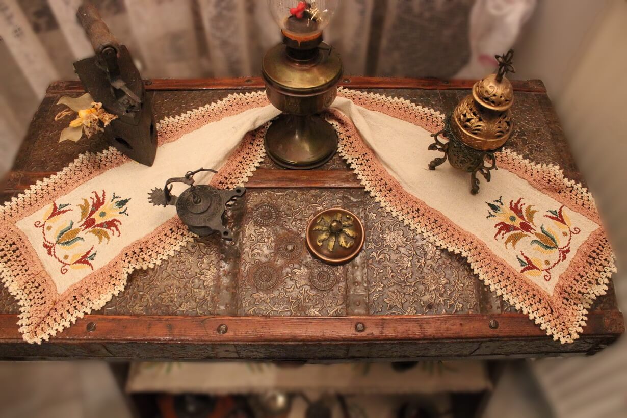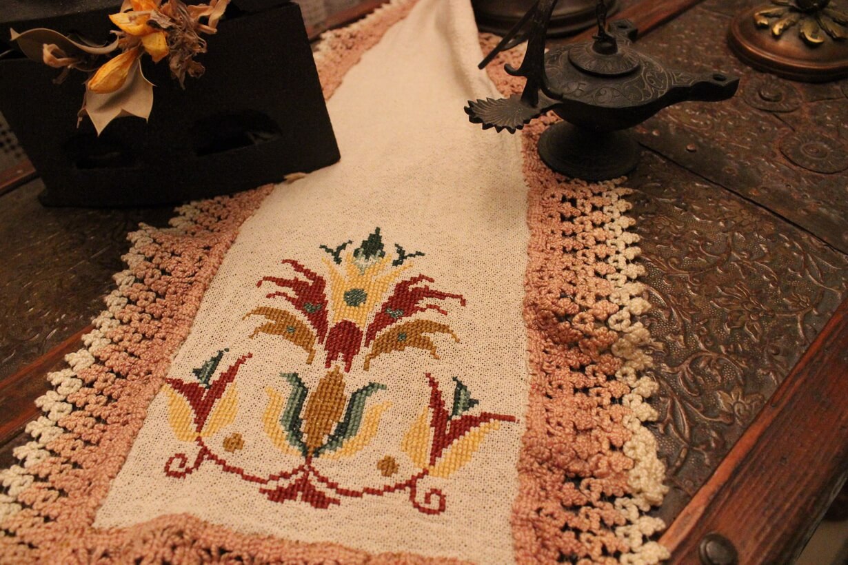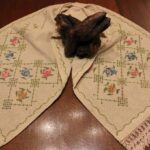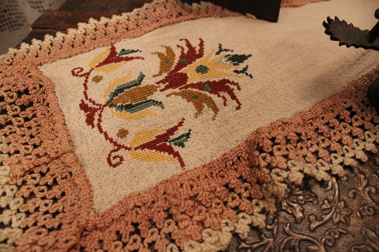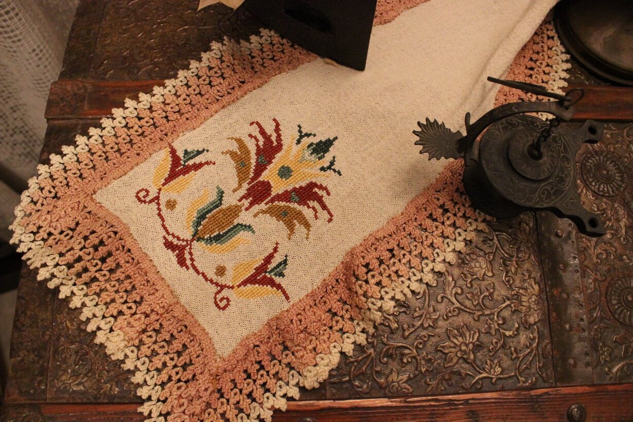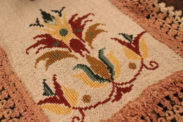 The fabric is called “Arachovitiko”. This is a traditional fabric with pills coming from the Greek village Arachova. The design motif was sourced from a magazine. Cross-stitch was used.