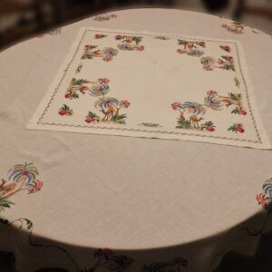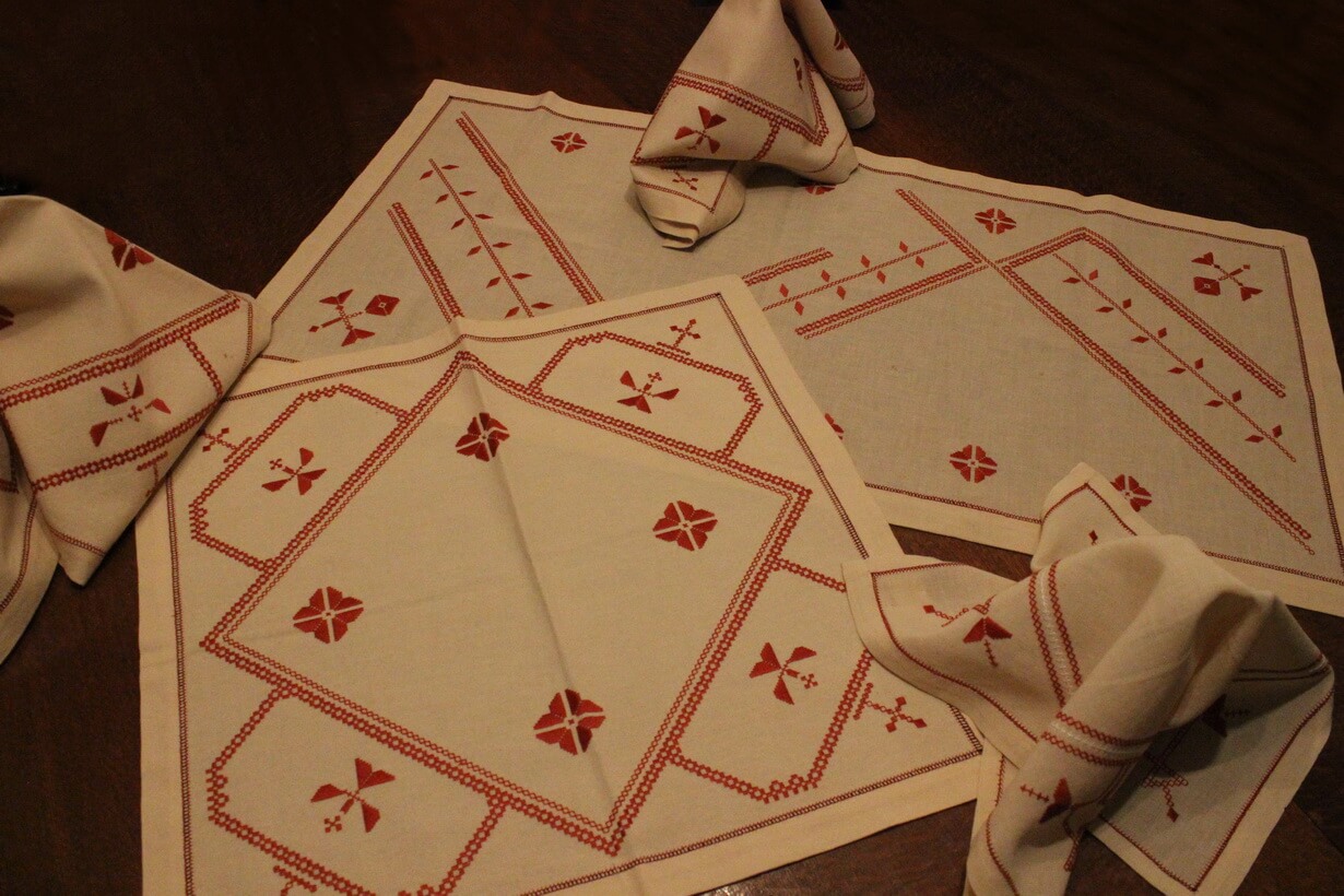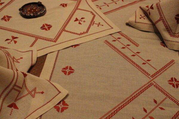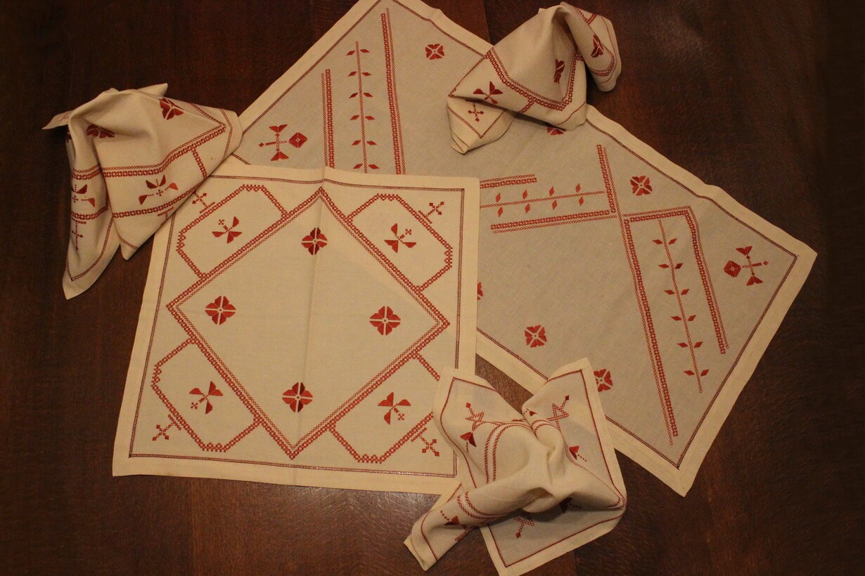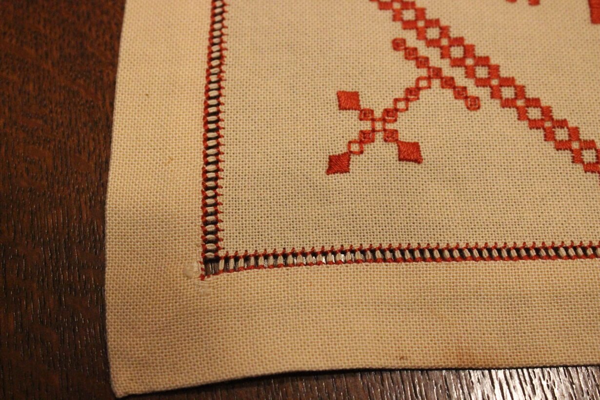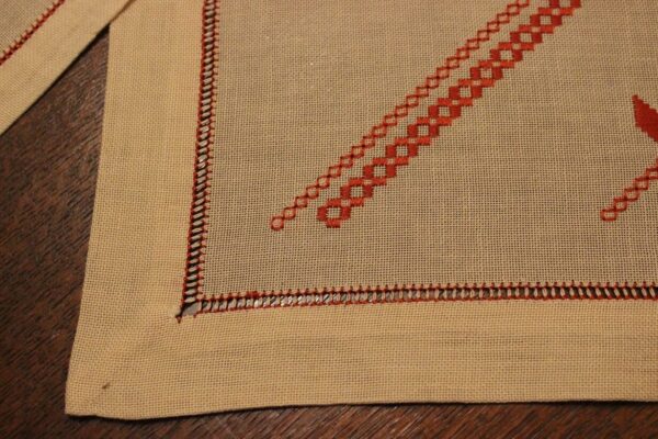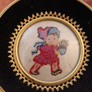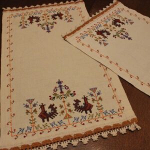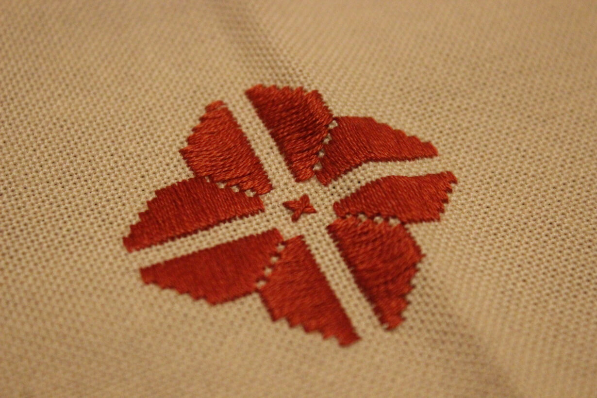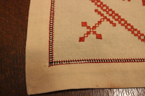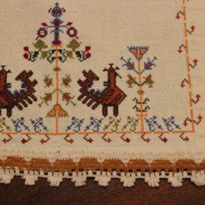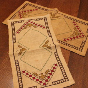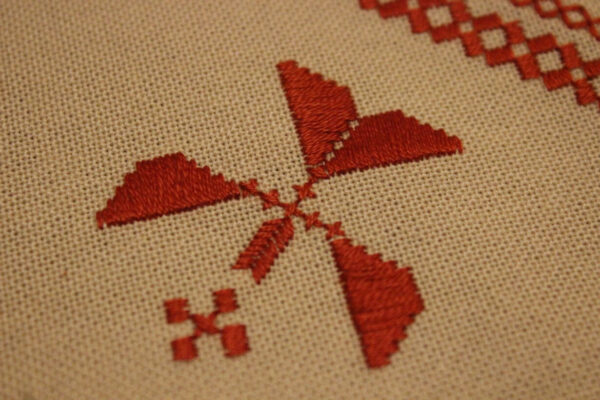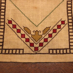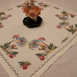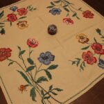 The fabric is etamine. The design motif was sourced from a magazine and used to create this composition. Satin stitch was used.