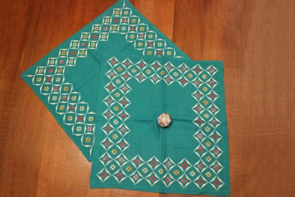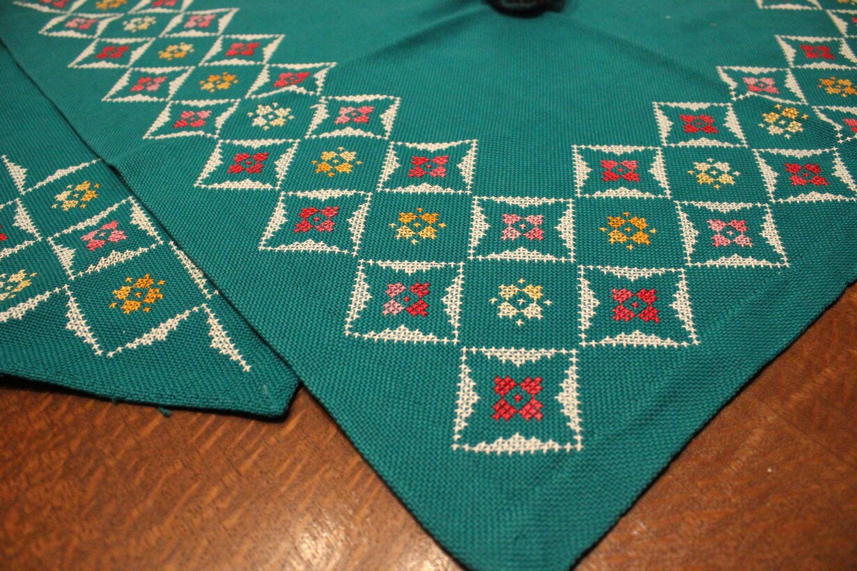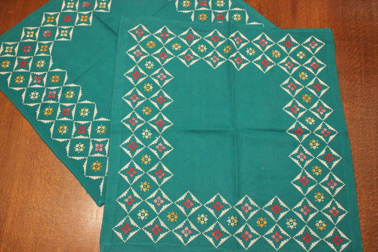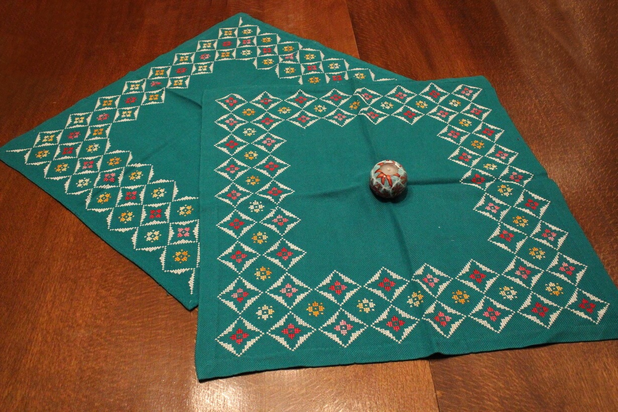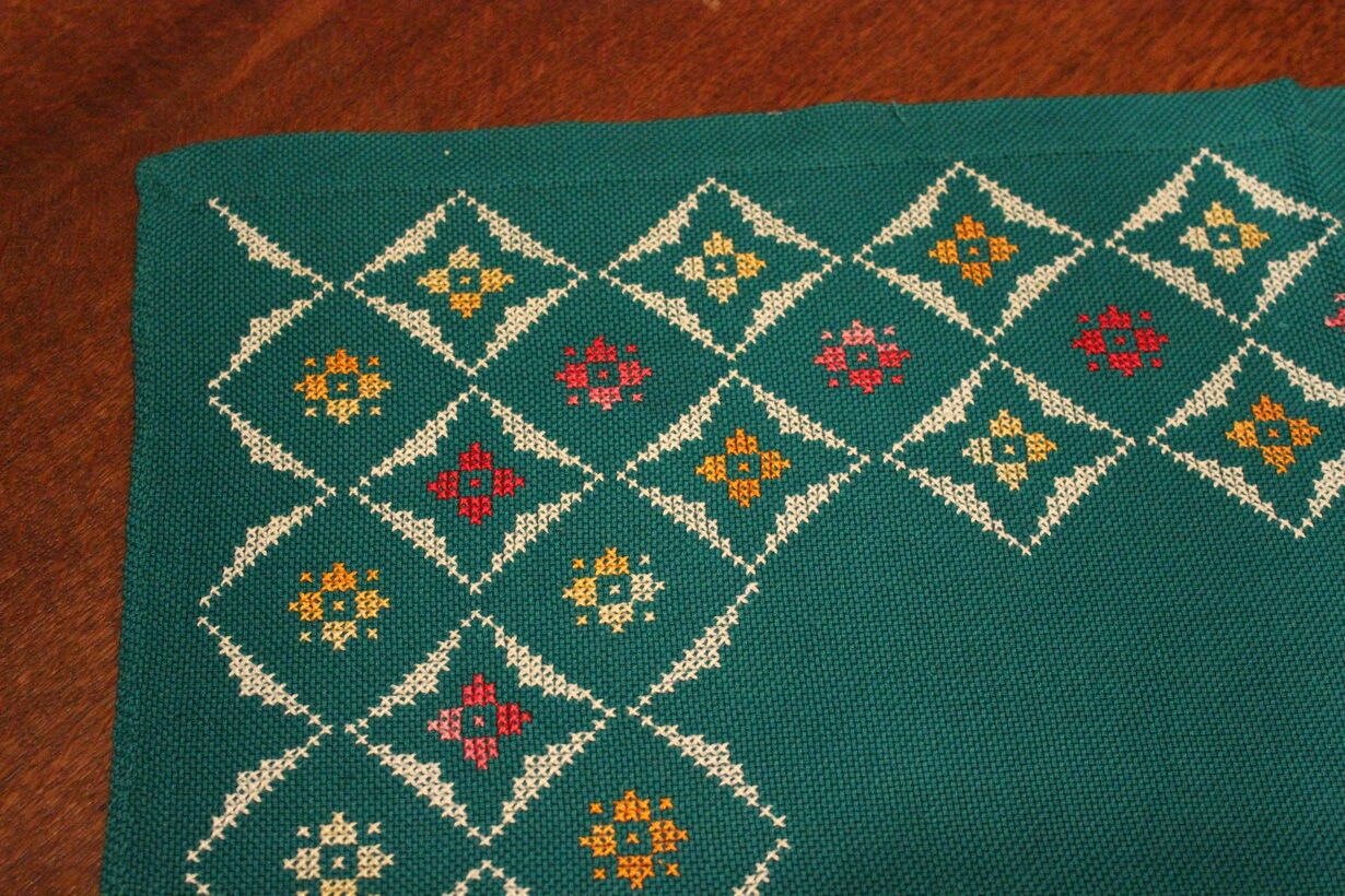 The fabric is etamine. The design motif was created using a basic pattern and repetition. Cross-stitch was used.