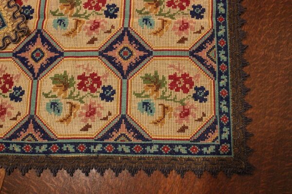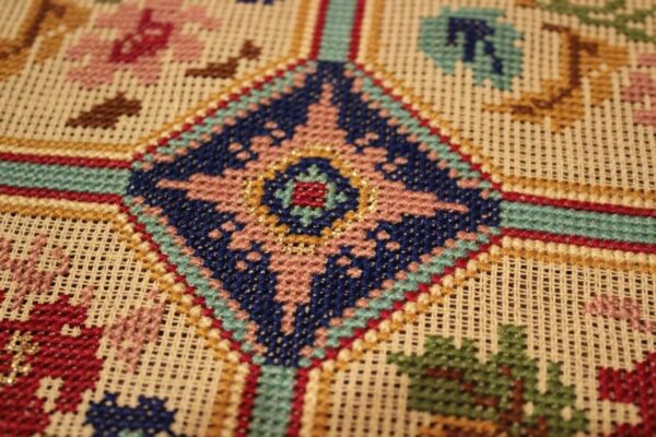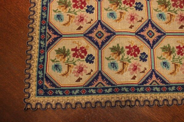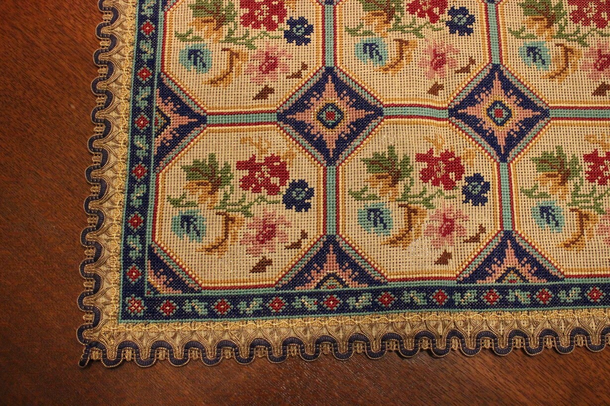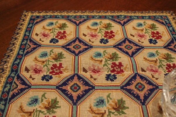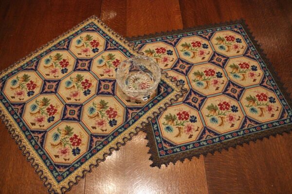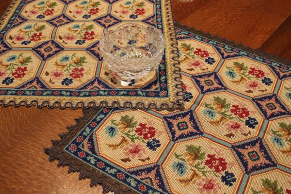 The canvas is medium. The design motif was sourced from a magazine. Cross-stitch was used. This is a set consisting of 2 pieces.