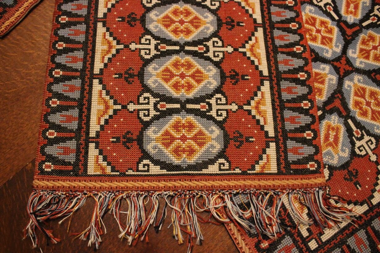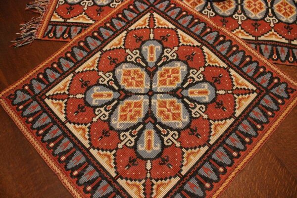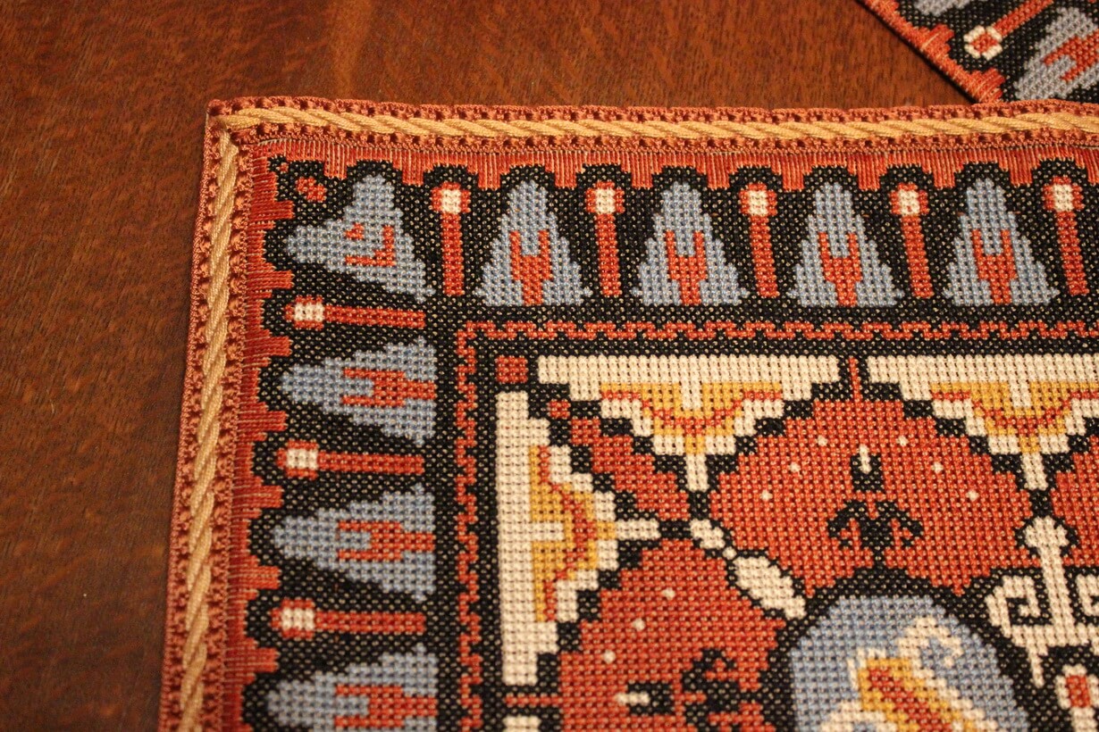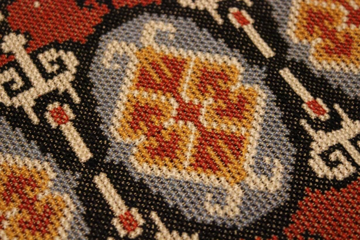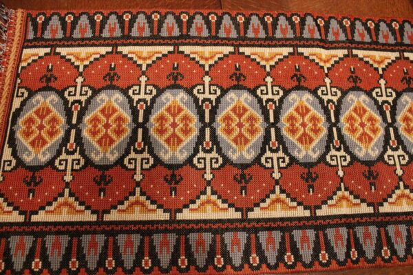 The canvas is thick. The design motif was sourced from a magazine and used to create this composition. Cross-stitch was used.