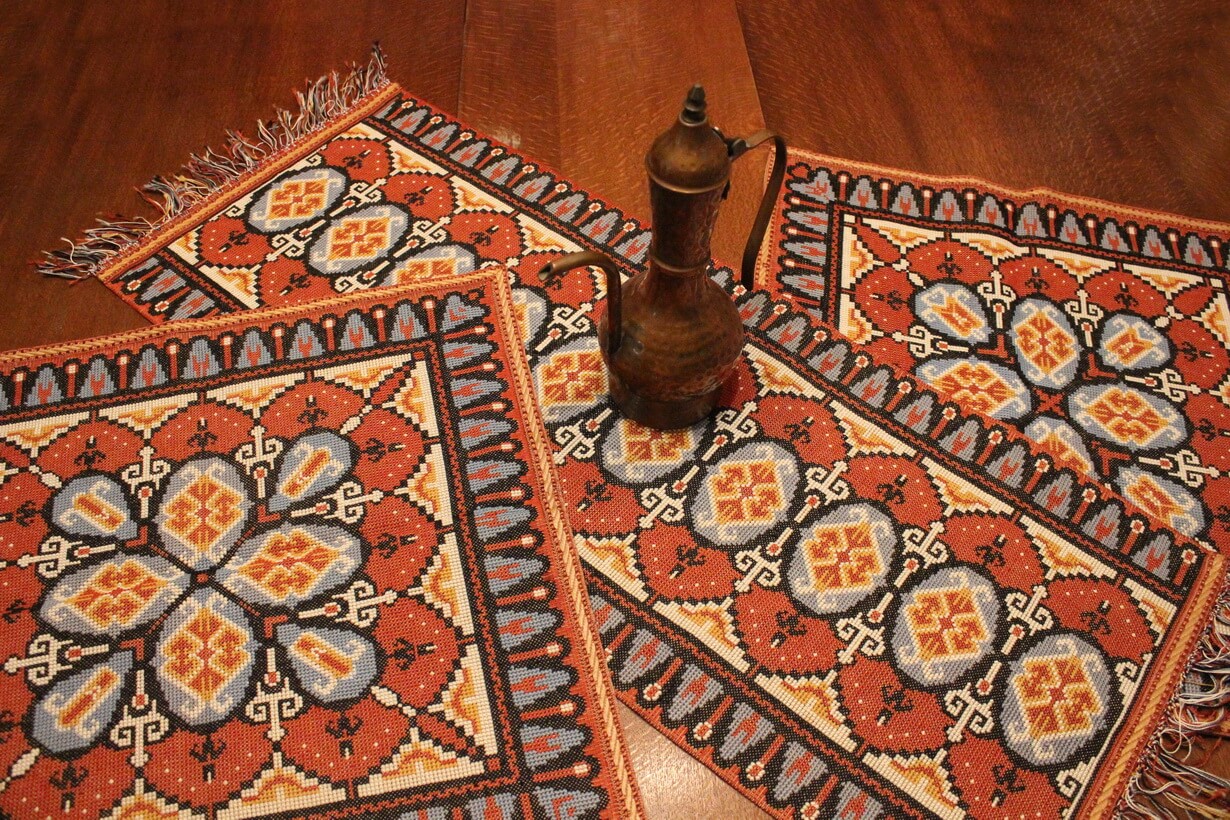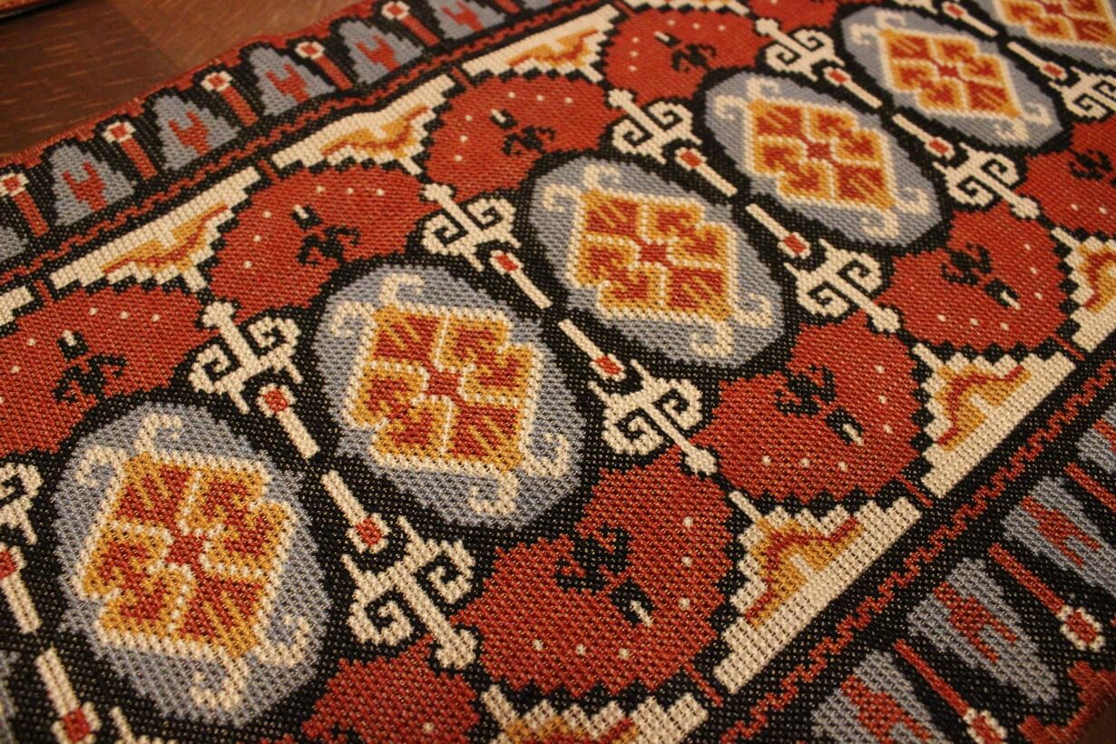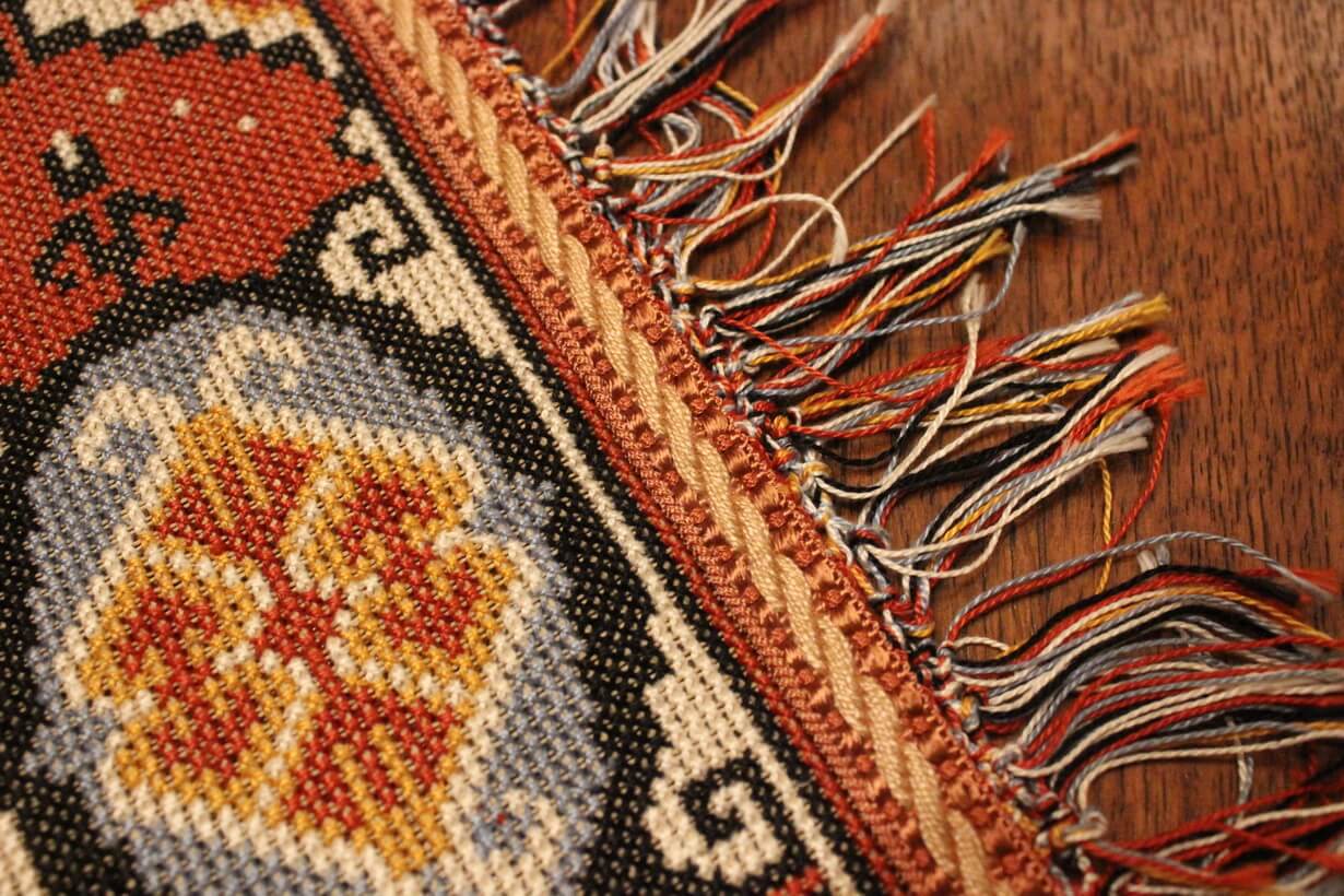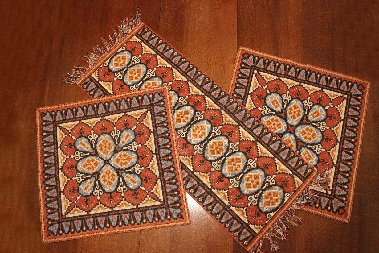 The canvas is thick. The design motif was sourced from a magazine and used to create this composition. Cross-stitch was used.