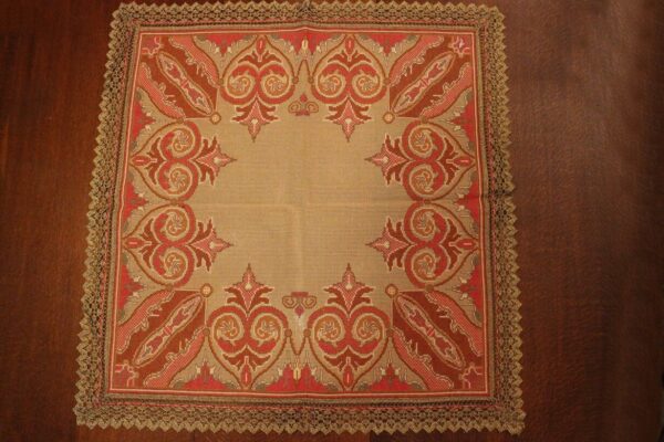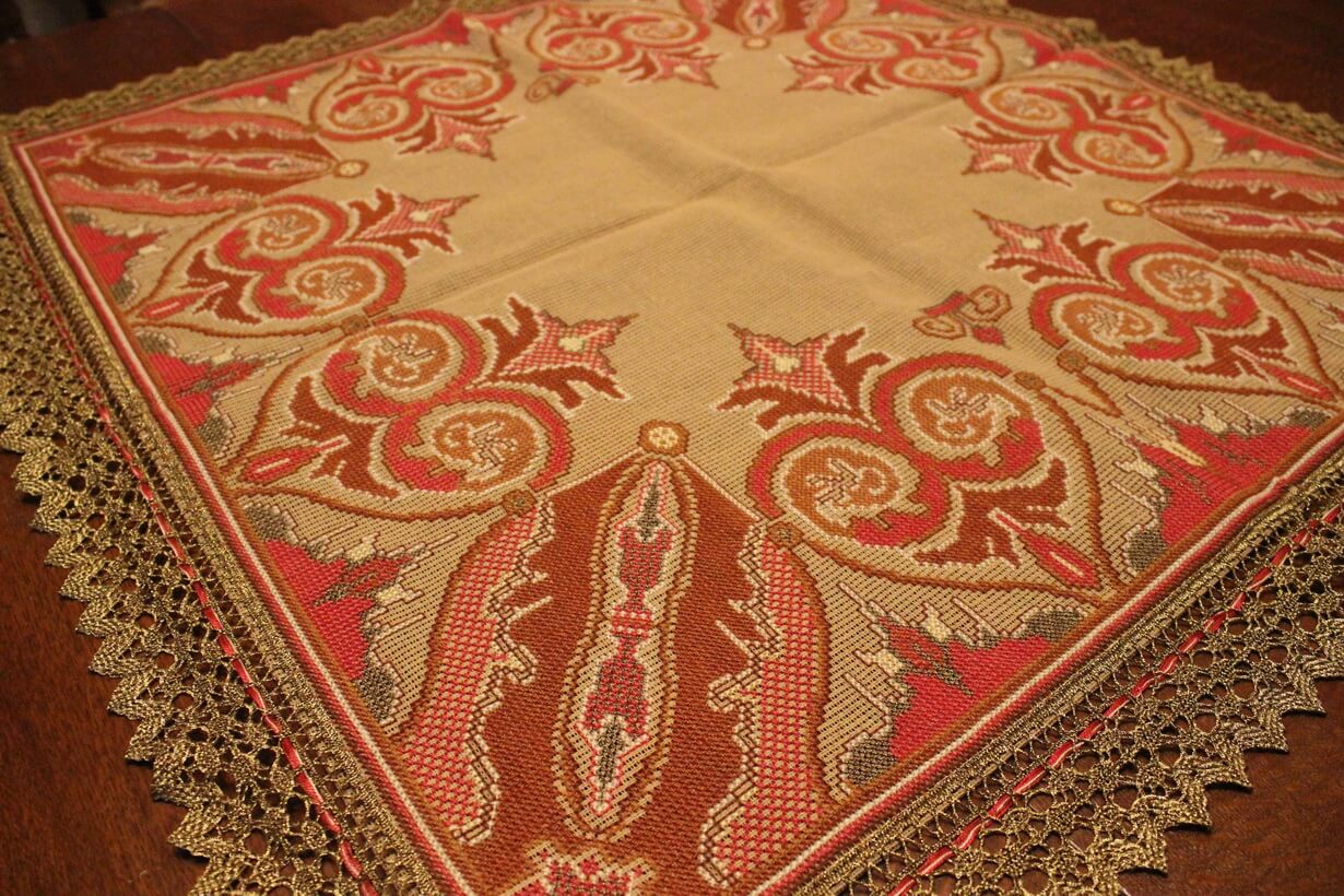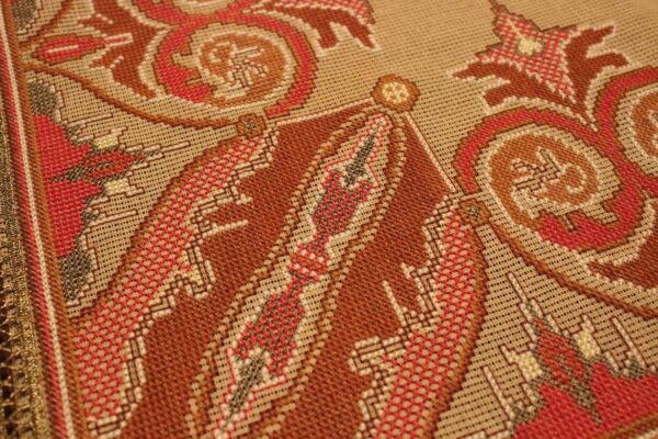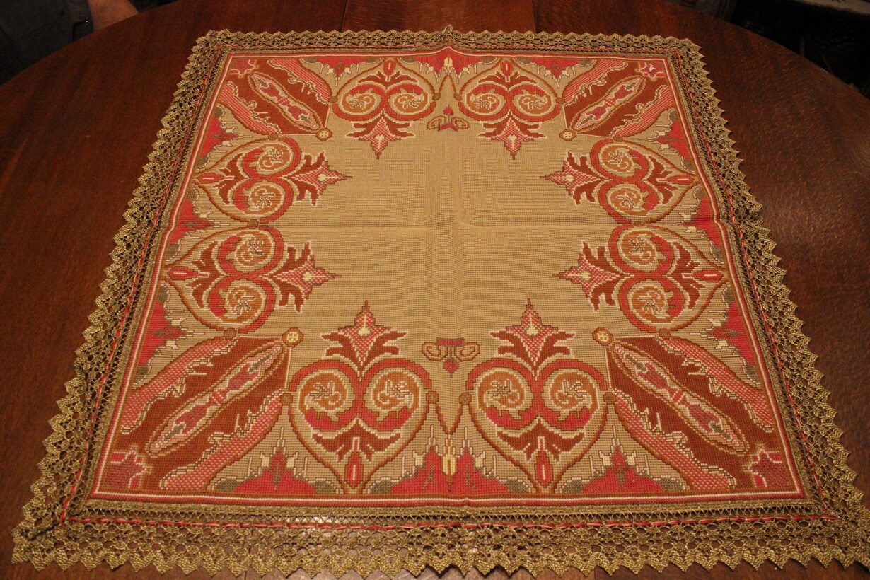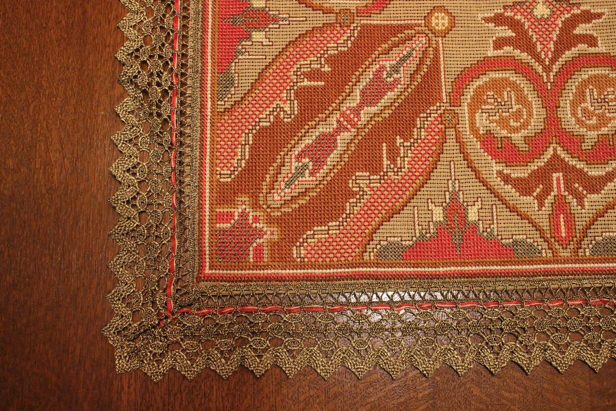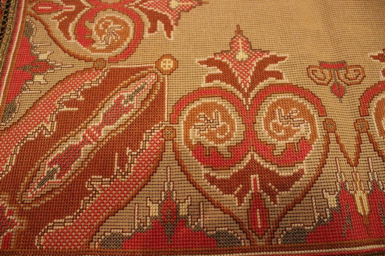 The canvas is medium. The design motif was sourced from a magazine combined with improvisation. Cross-stitch was used. The choice of colors was personal.