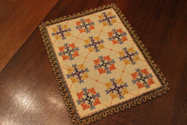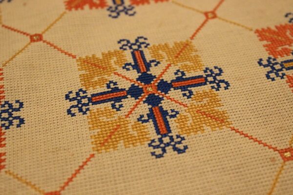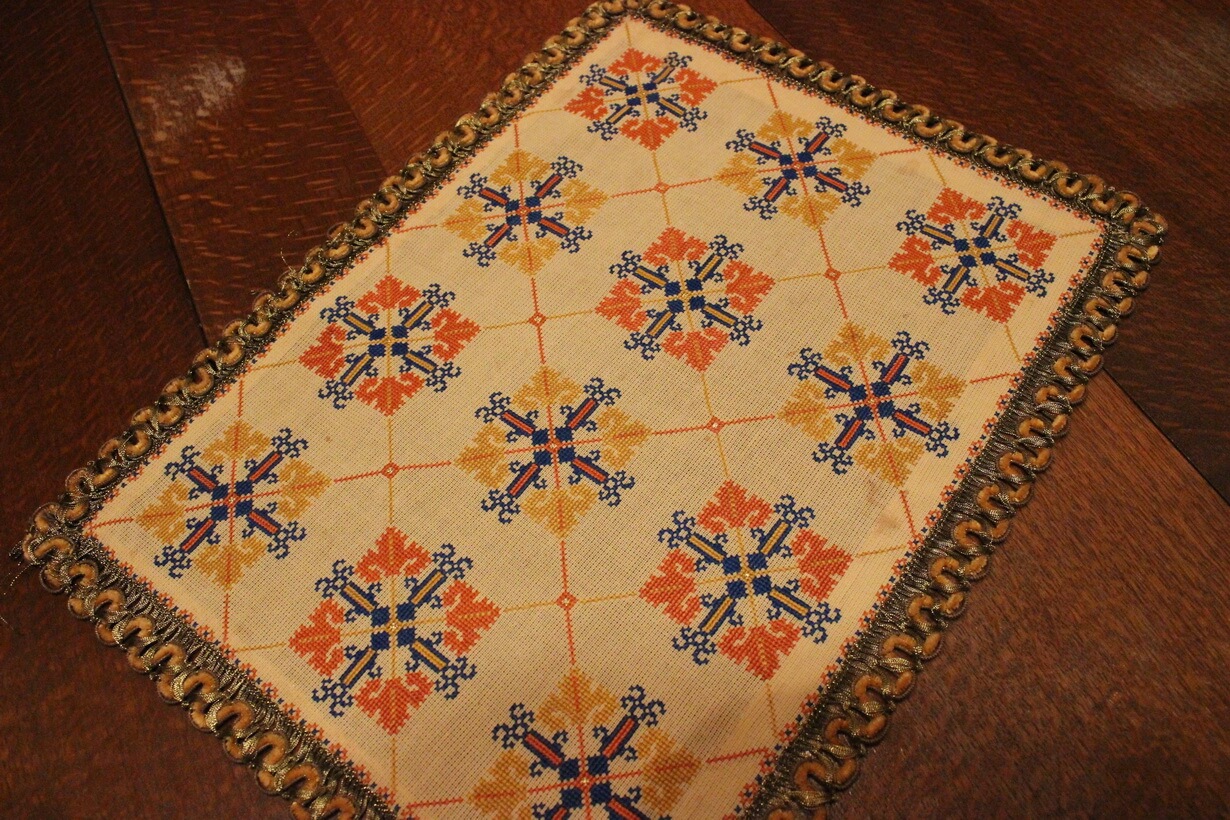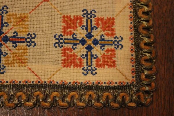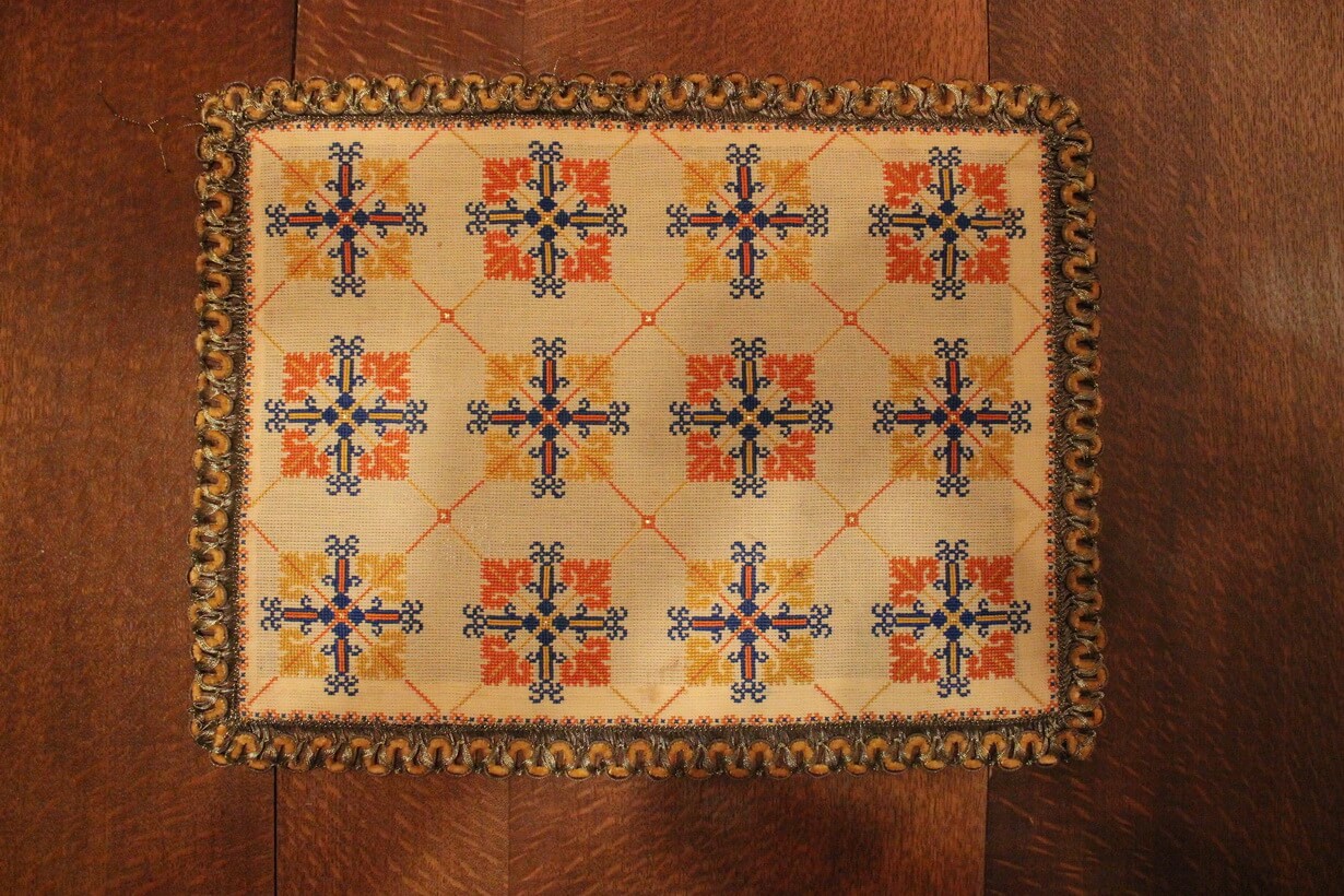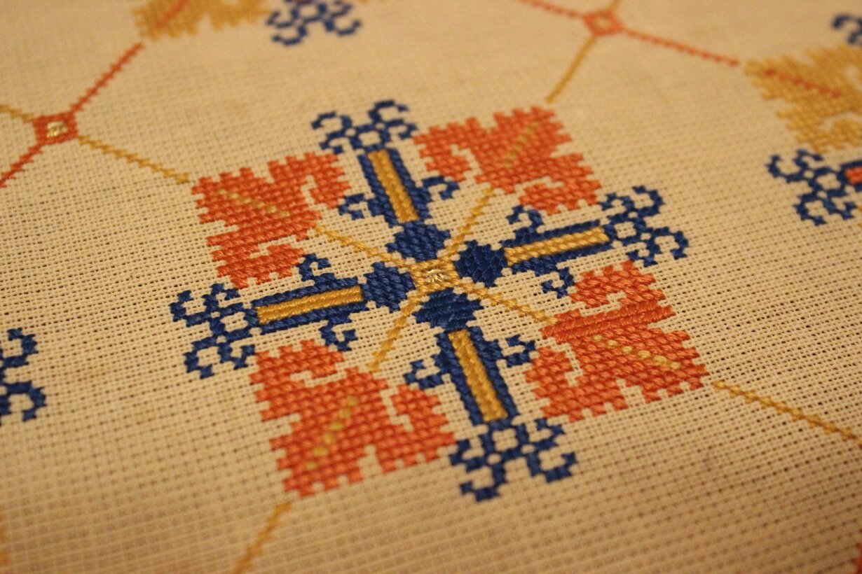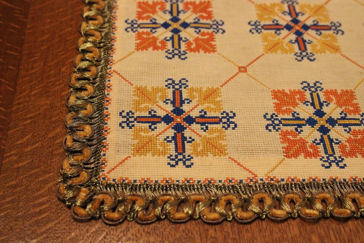 The canvas is fine. The design was sourced from a magazine. Cross-stitch was used.