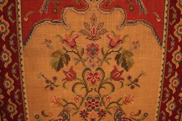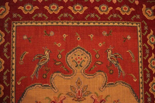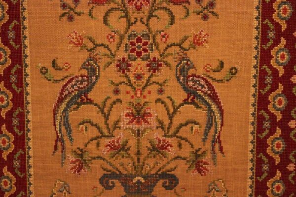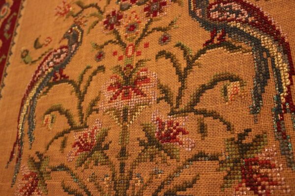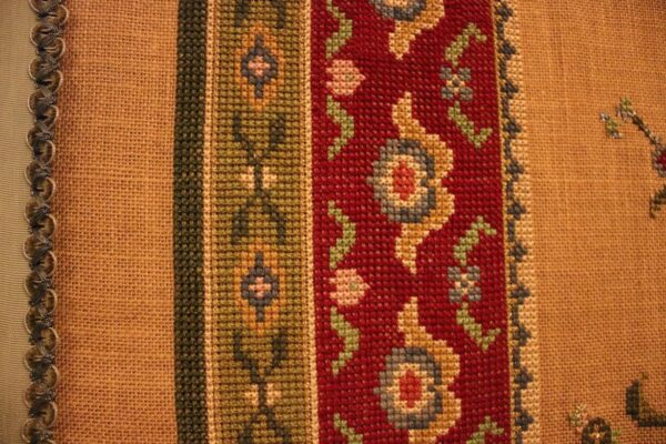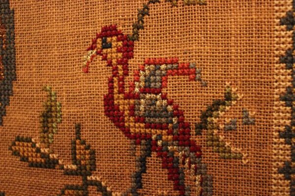 The fabric is hessian canvas (sackcloth), and cross-stitch was used.