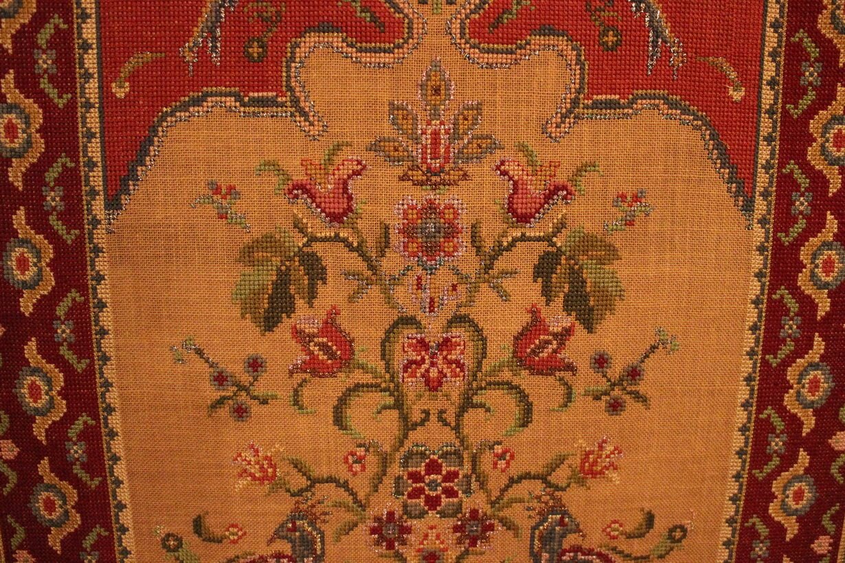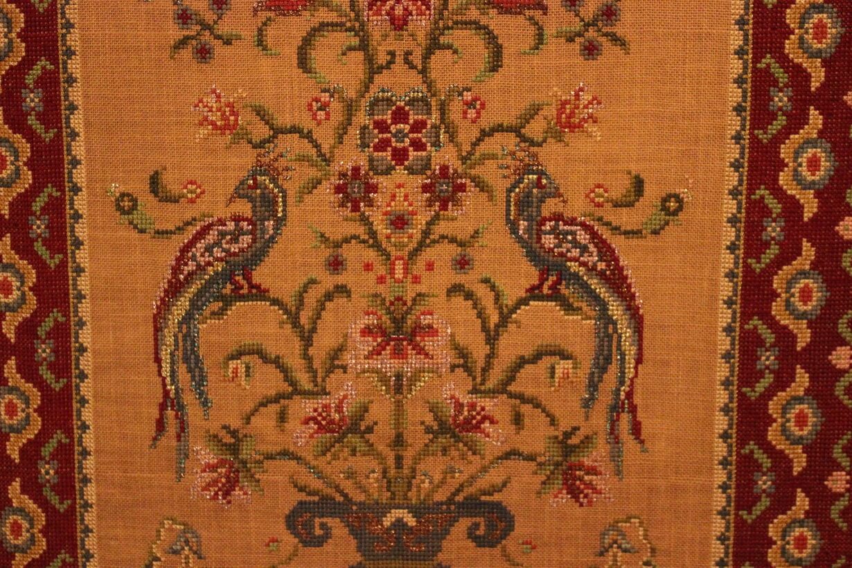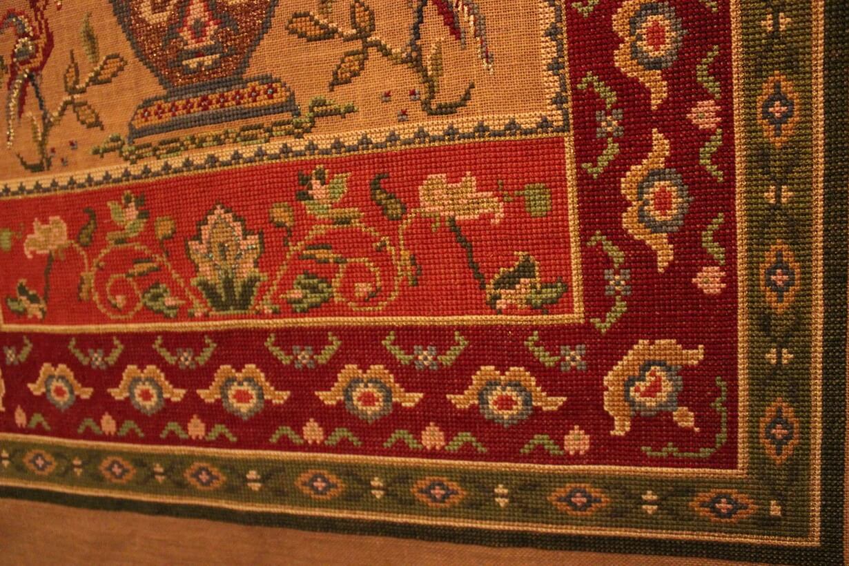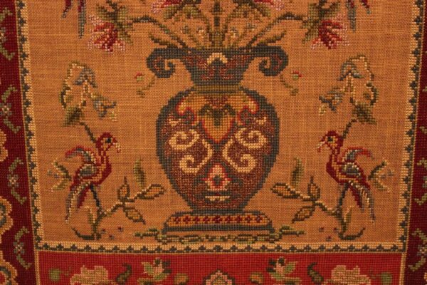 A work with an oriental character. It originates from a magazine design (patterns for the vase, birds, and branch), but includes improvisation with many personal additions. An improvised frame with a wooden border and velvet was also added for hanging the work on the wall.