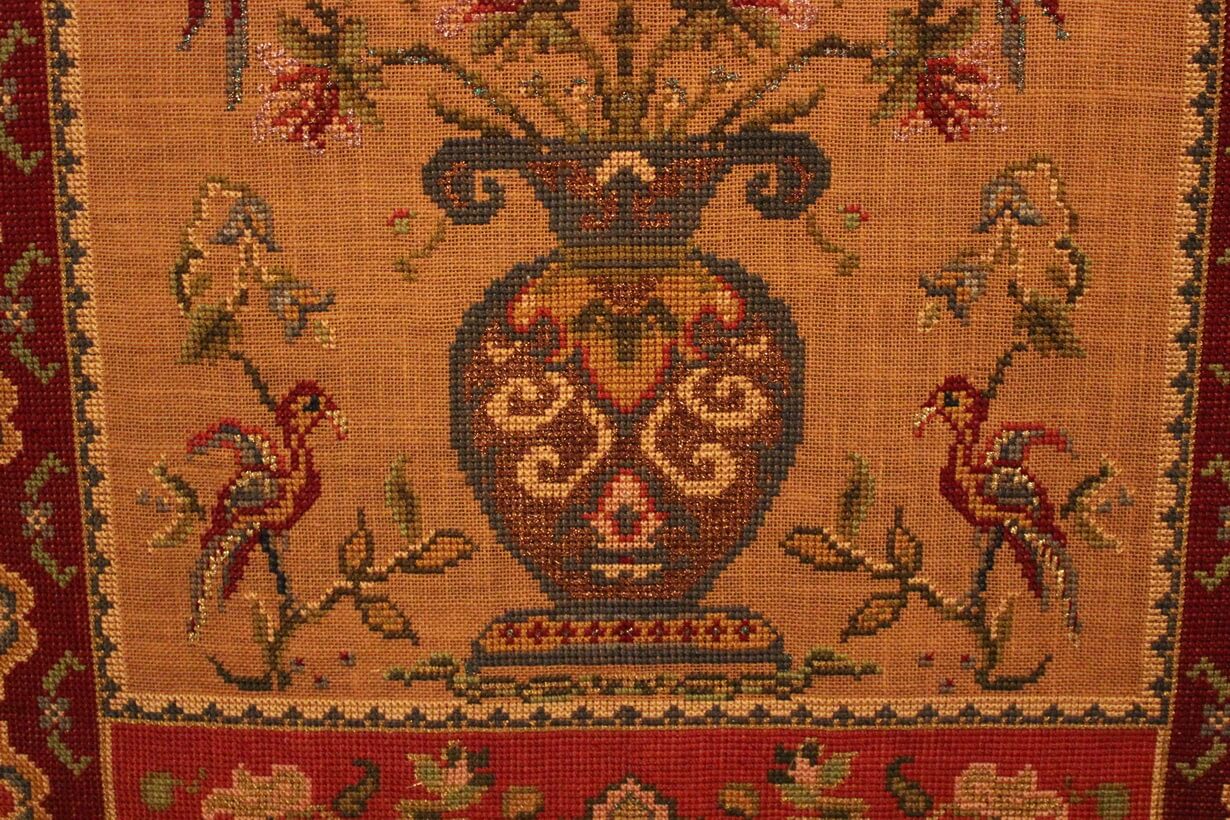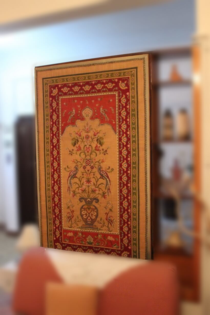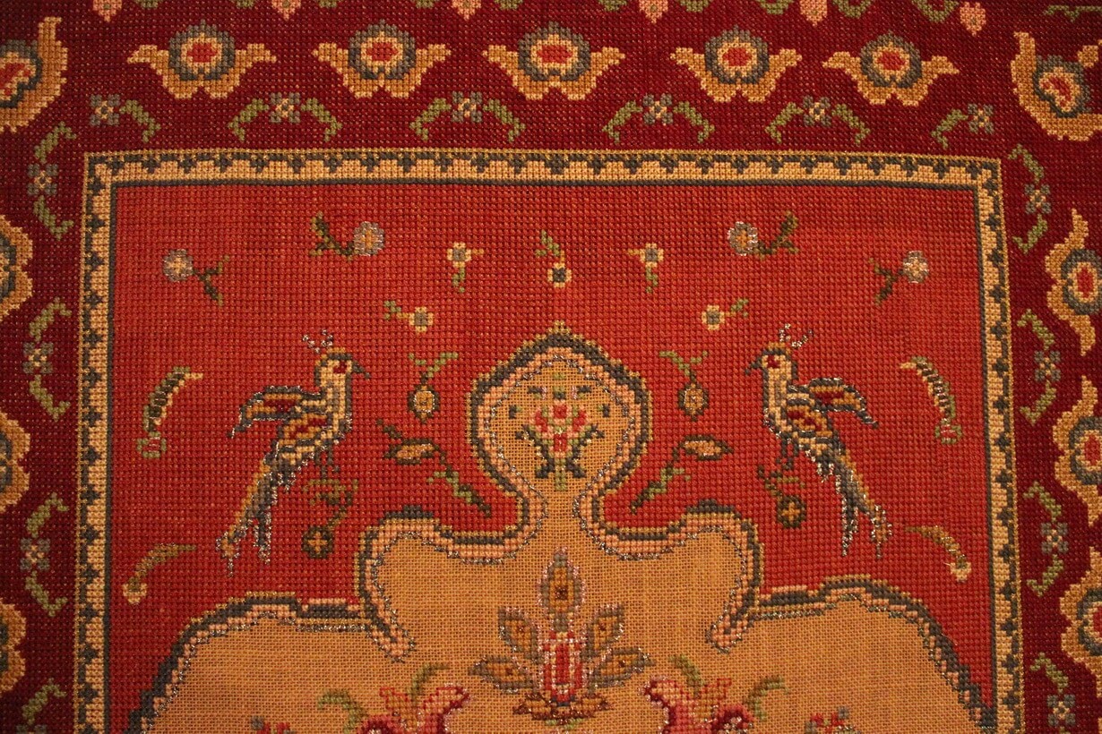 A work with an oriental character. It originates from a magazine design (patterns for the vase, birds, and branch), but includes improvisation with many personal additions. An improvised frame with a wooden border and velvet was also added for hanging the work on the wall.