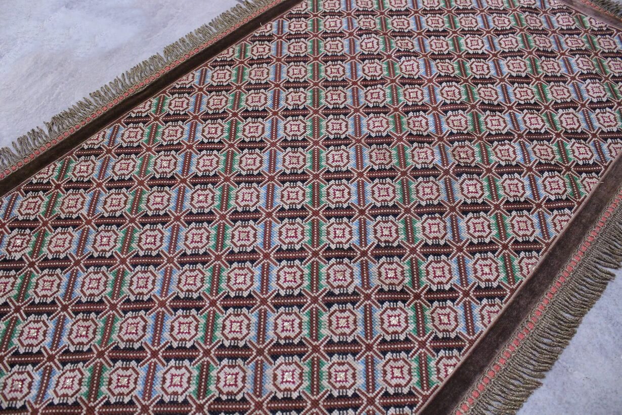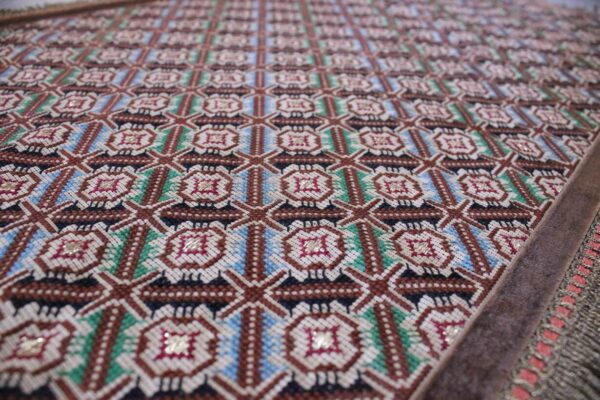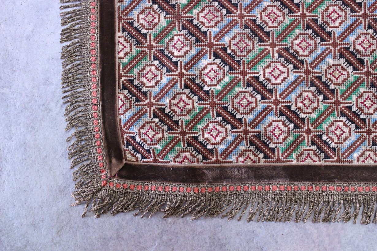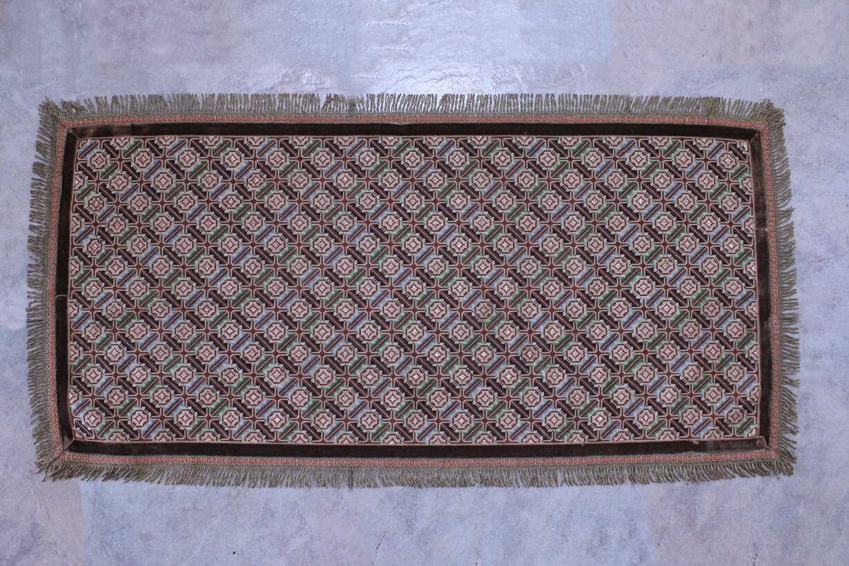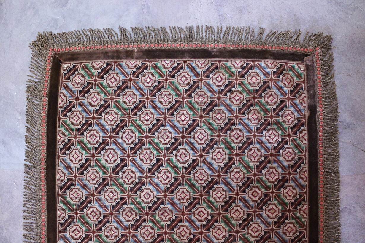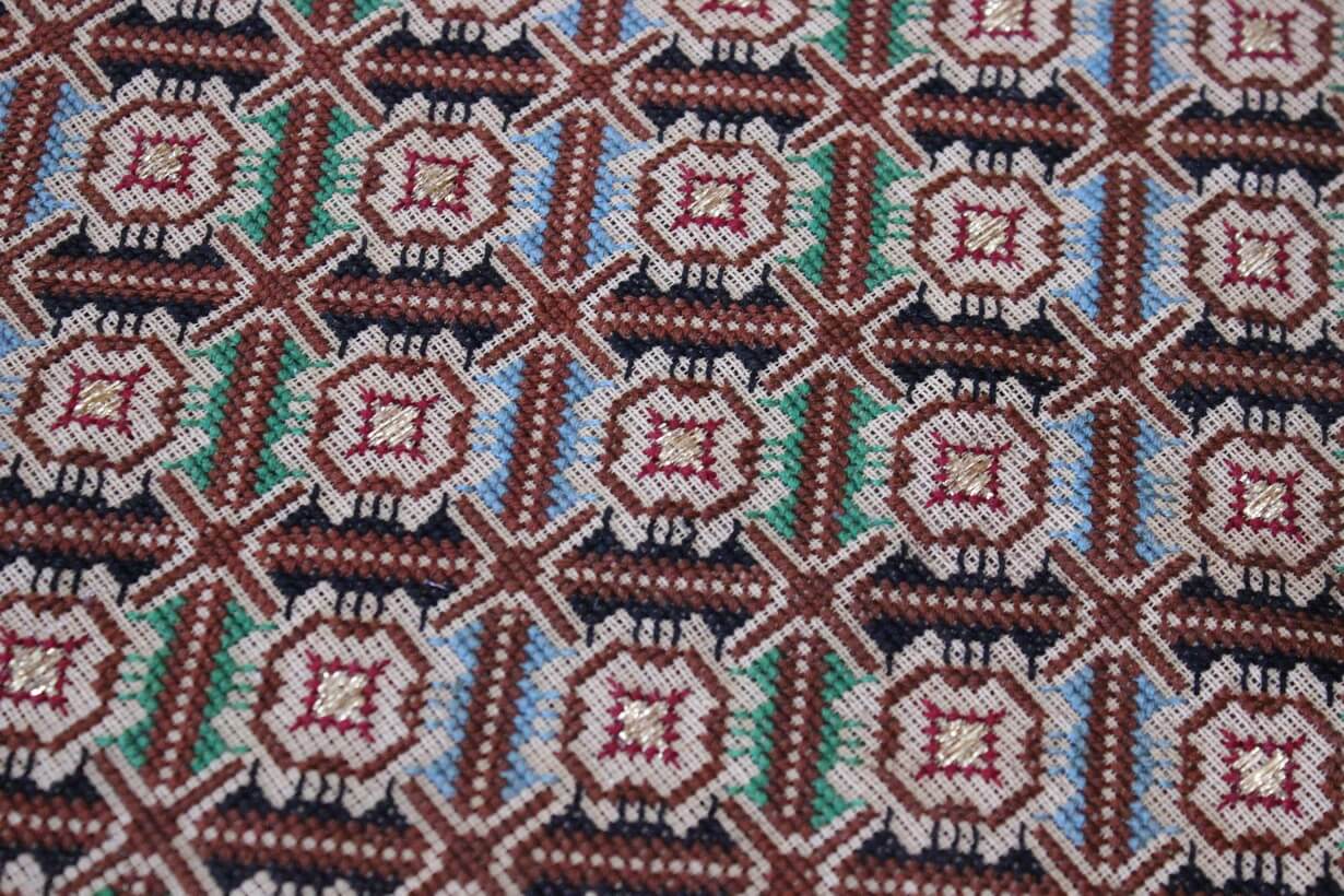 The canvas is fine, and cross-stitch was used, with hand topstitch in a few areas.