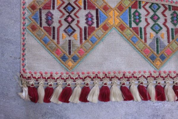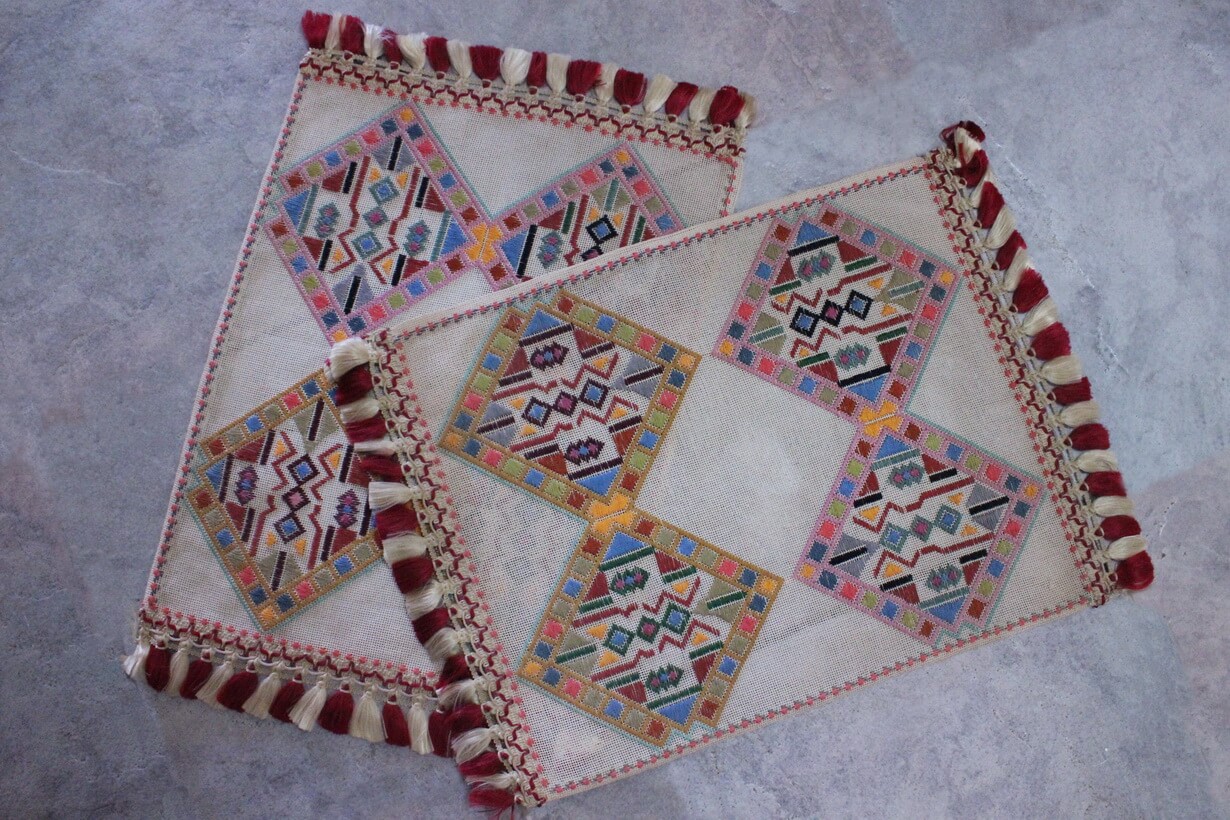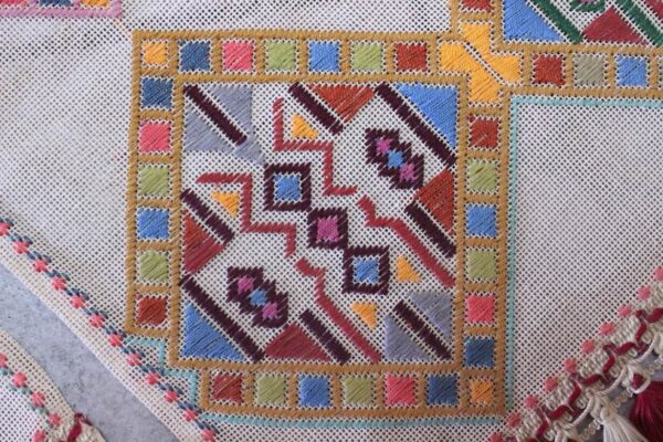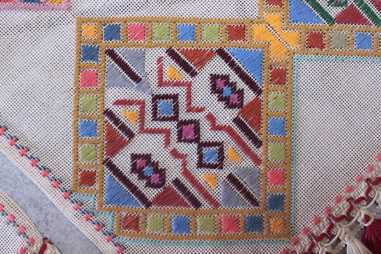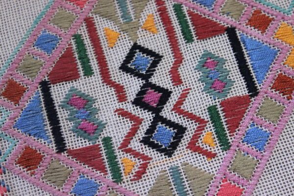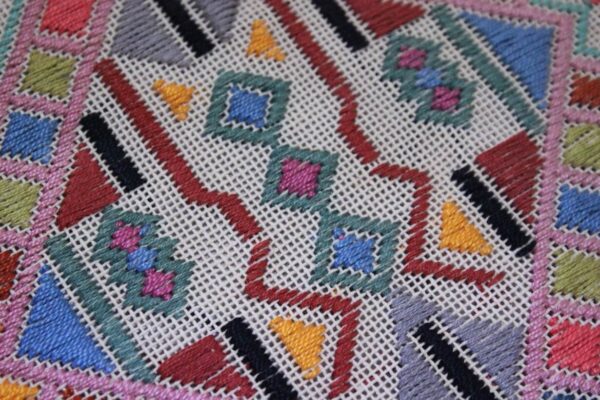The canvas is fine and white. The design motif was sourced from a magazine, and satin stitch was used.
