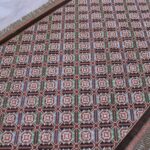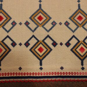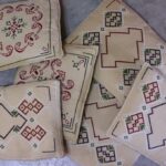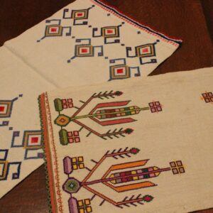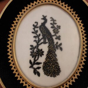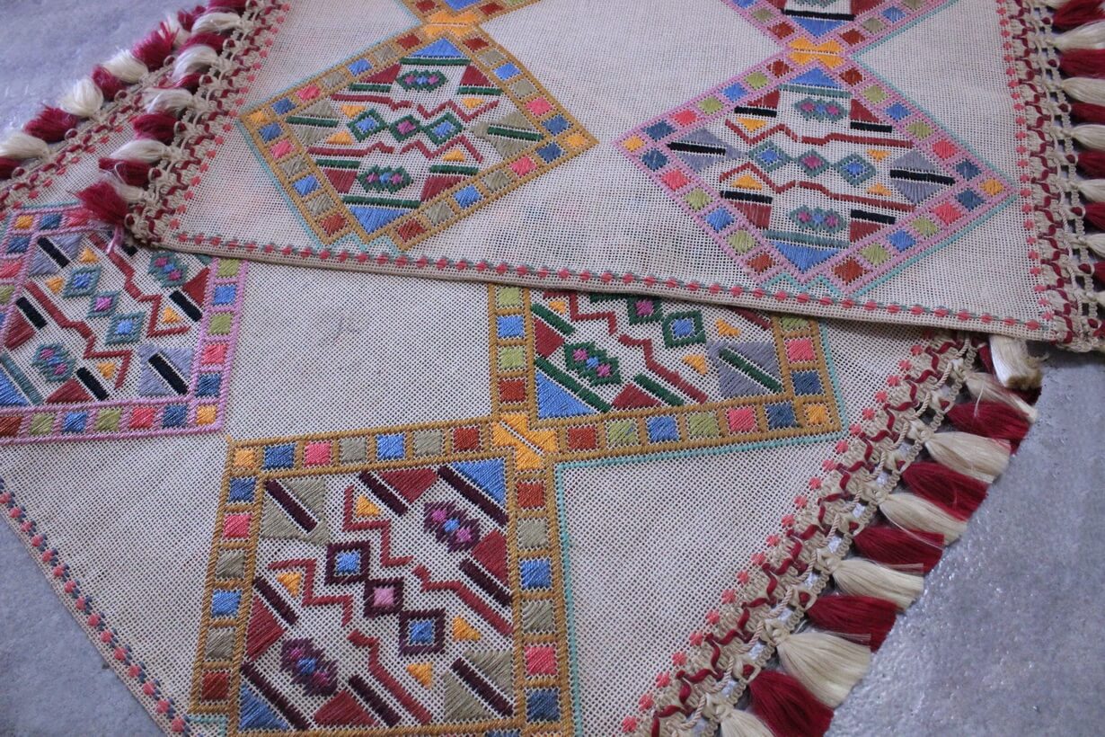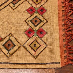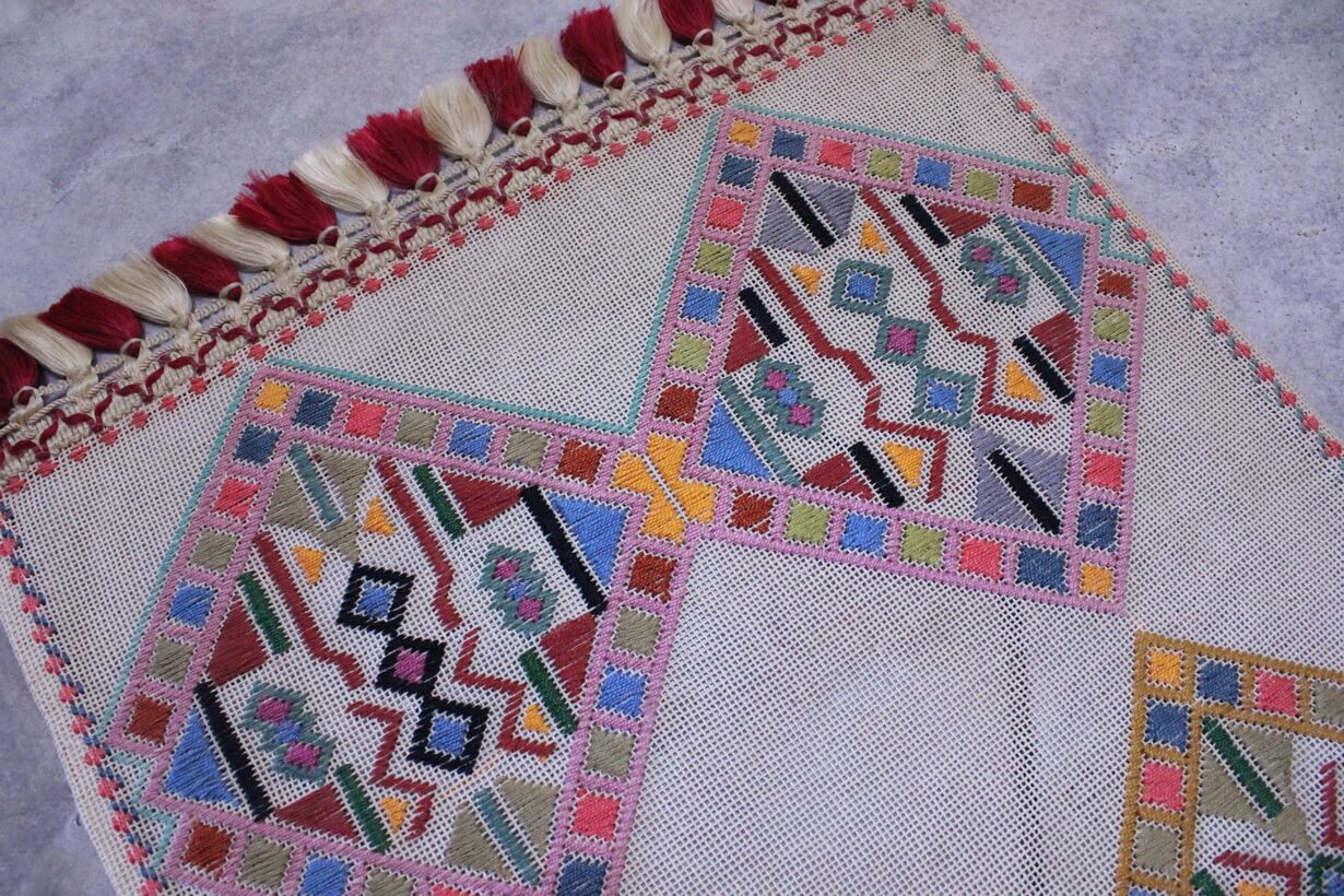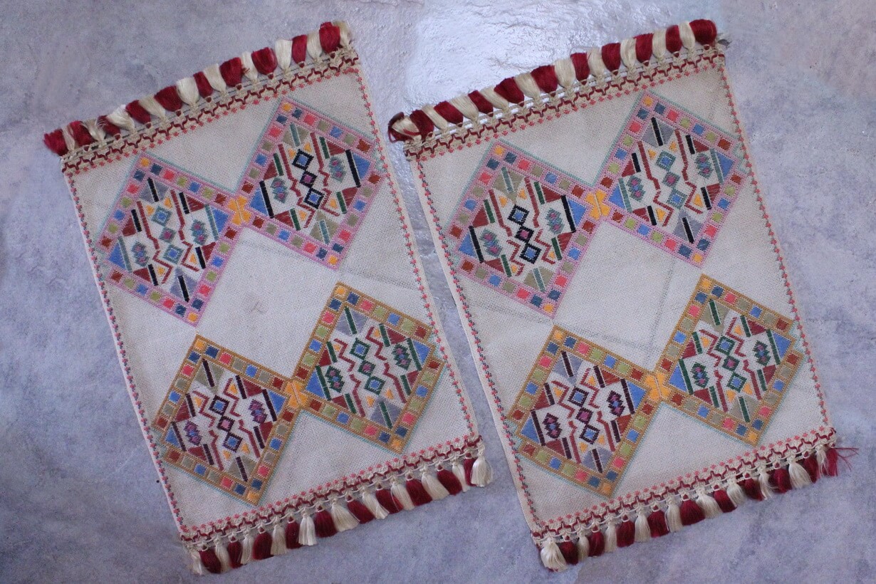 The canvas is fine and white. The design motif was sourced from a magazine, and satin stitch was used.
