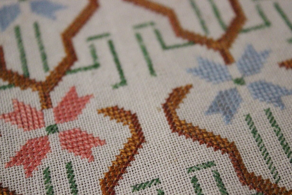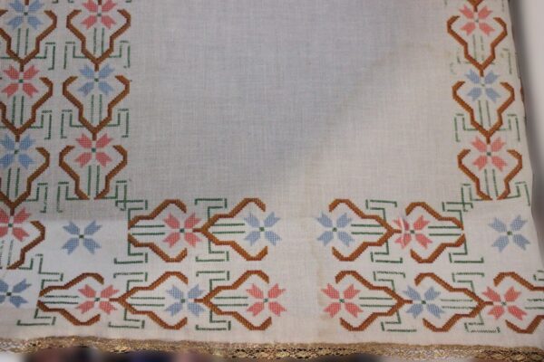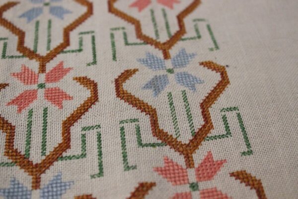 The fabric is etamine. The design motif was sourced from a magazine. Cross-stitch was used.