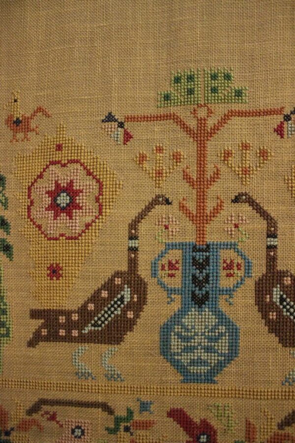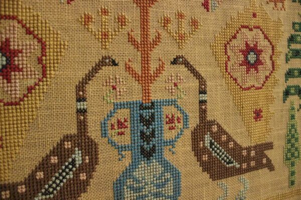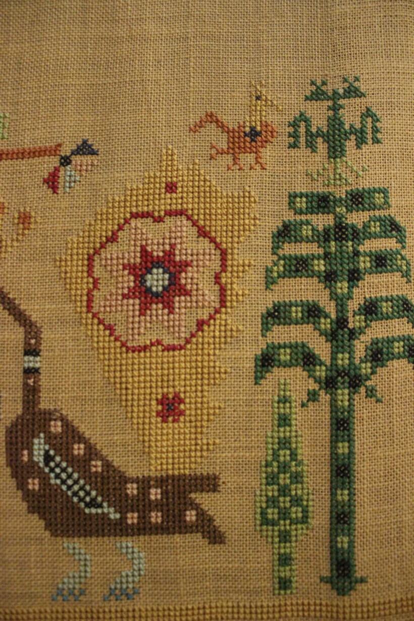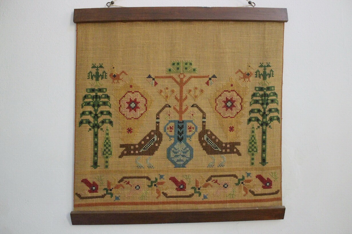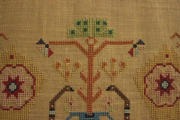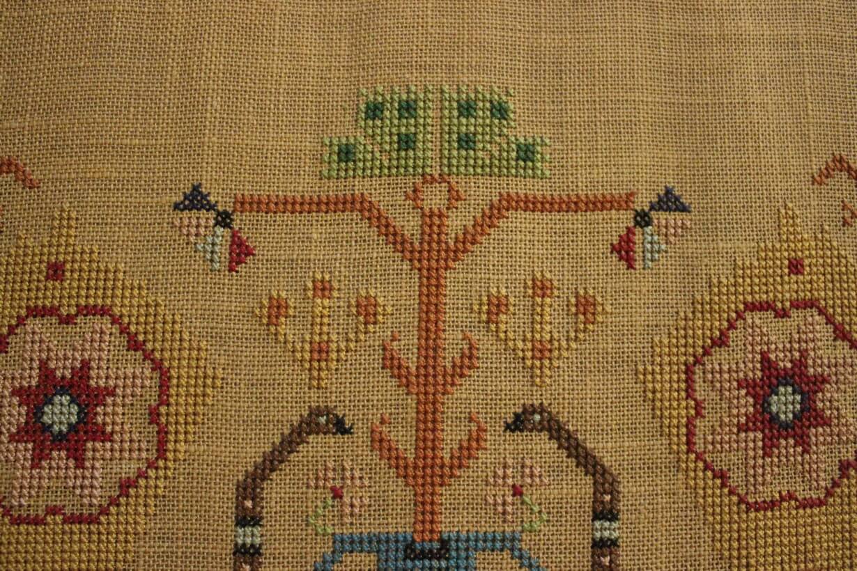 The fabric is hessian canvas (sackcloth). The design motif was sourced from a magazine. Cross-stitch was used.