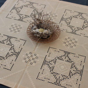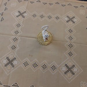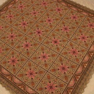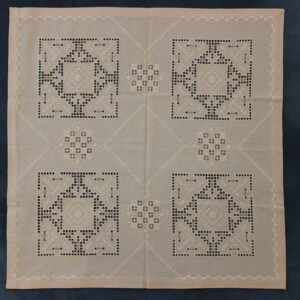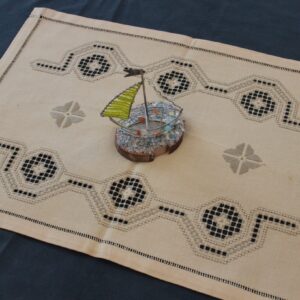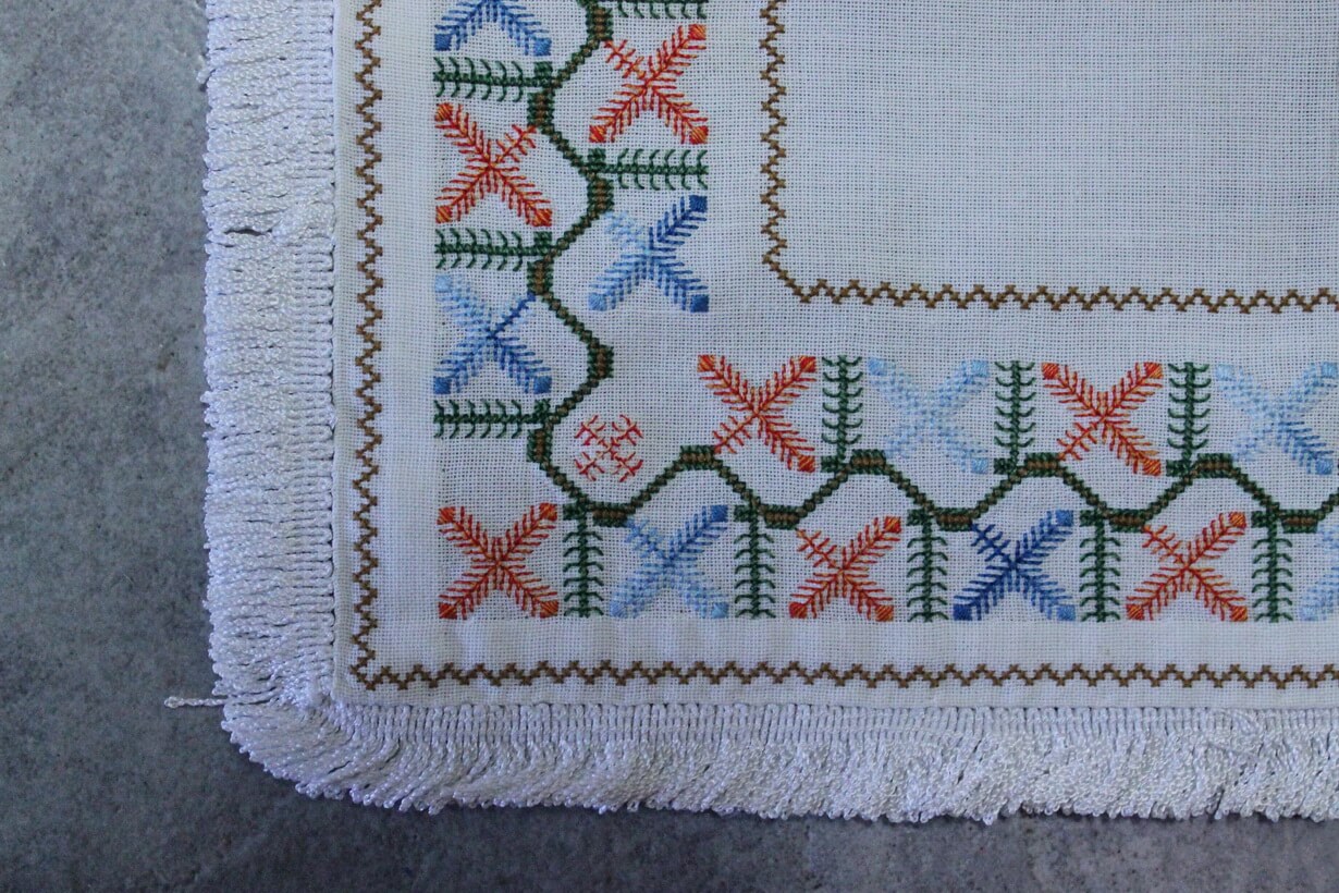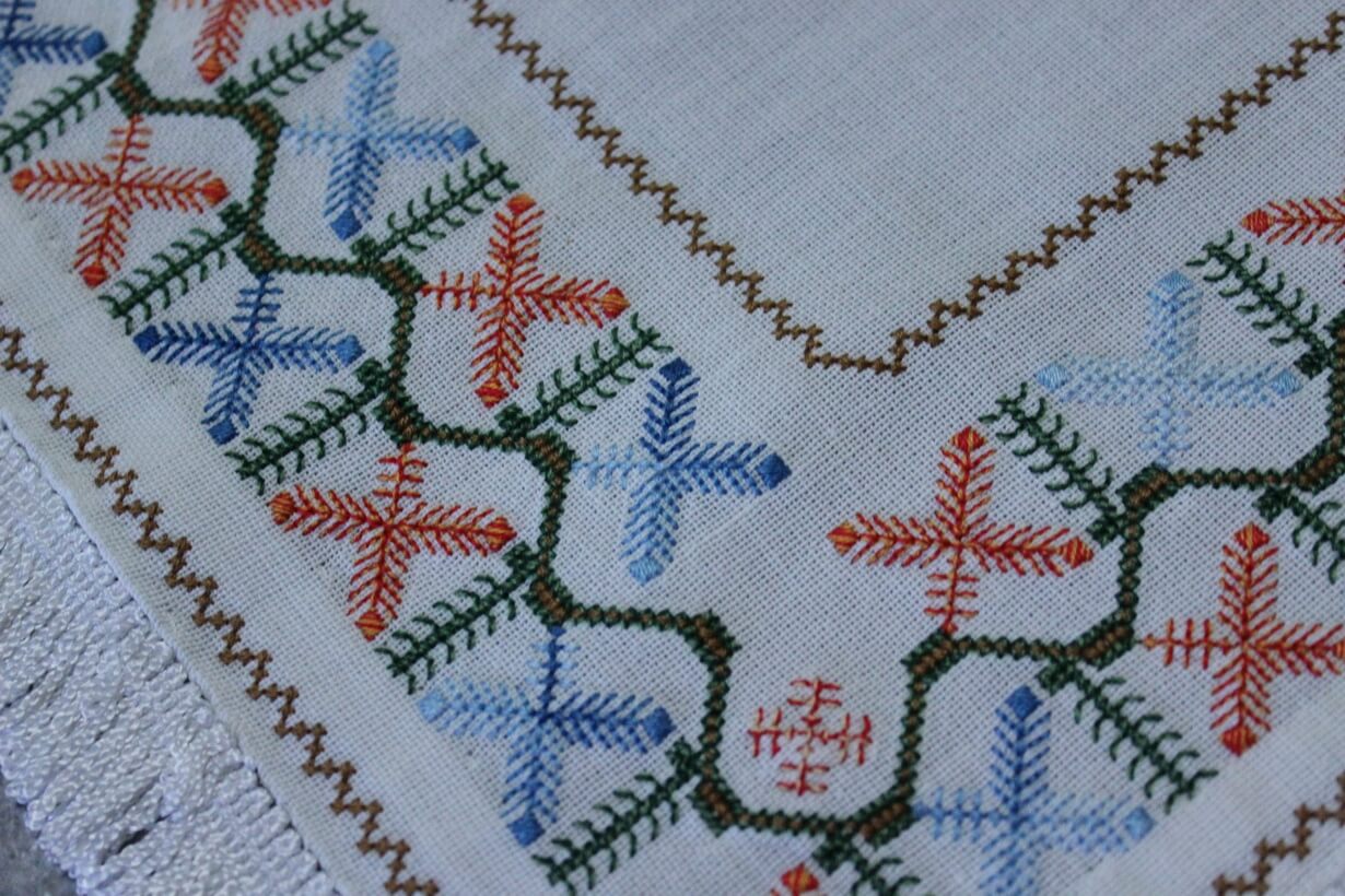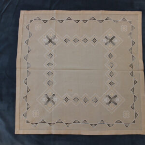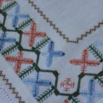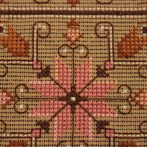 The canvas is fine. The design motif was sourced from a magazine and used to create this composition. Hand topstitch was used.