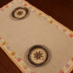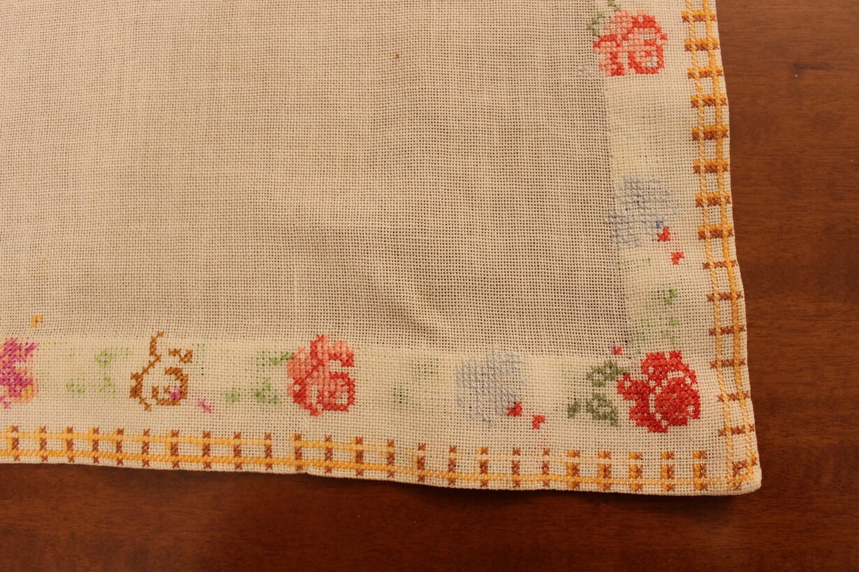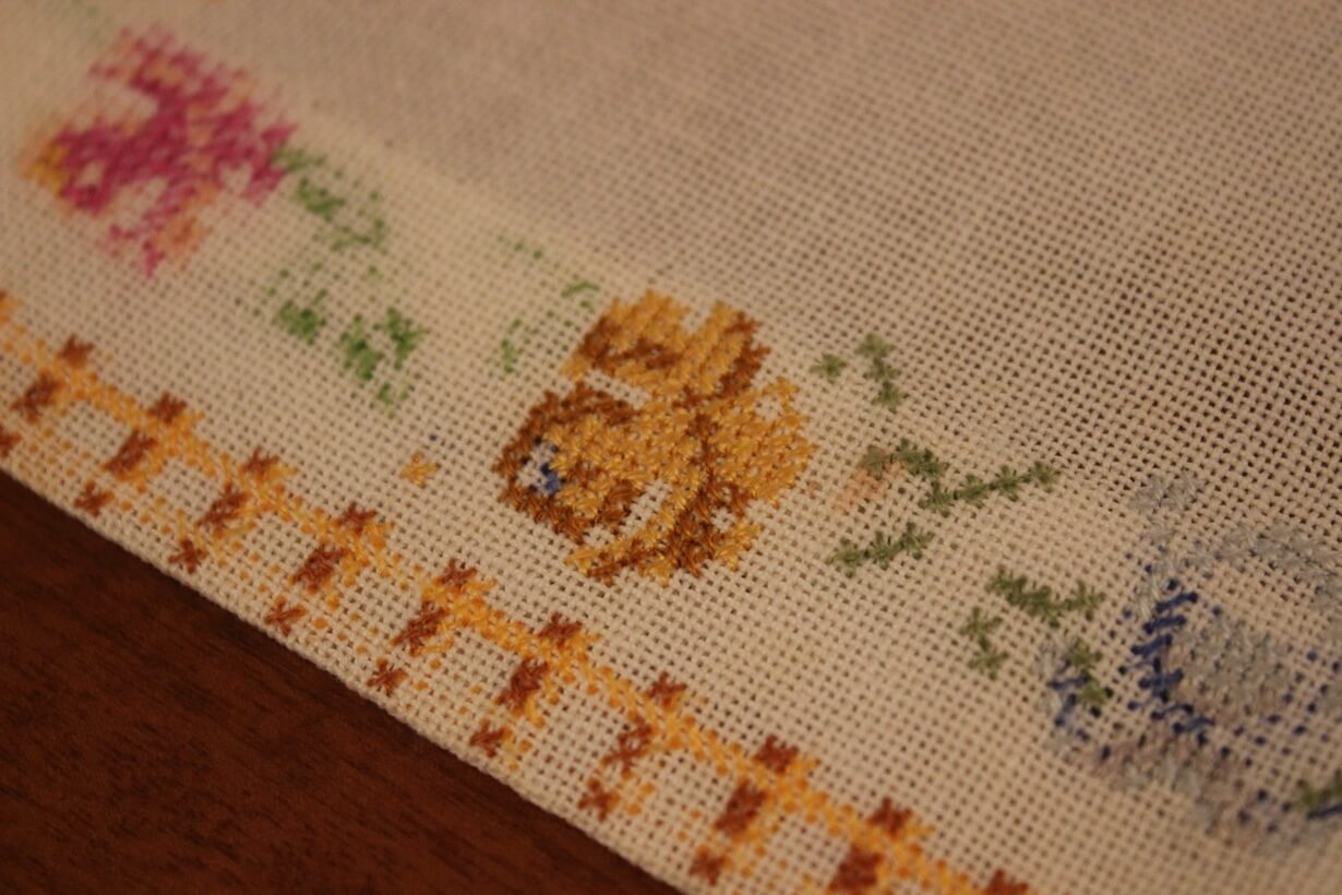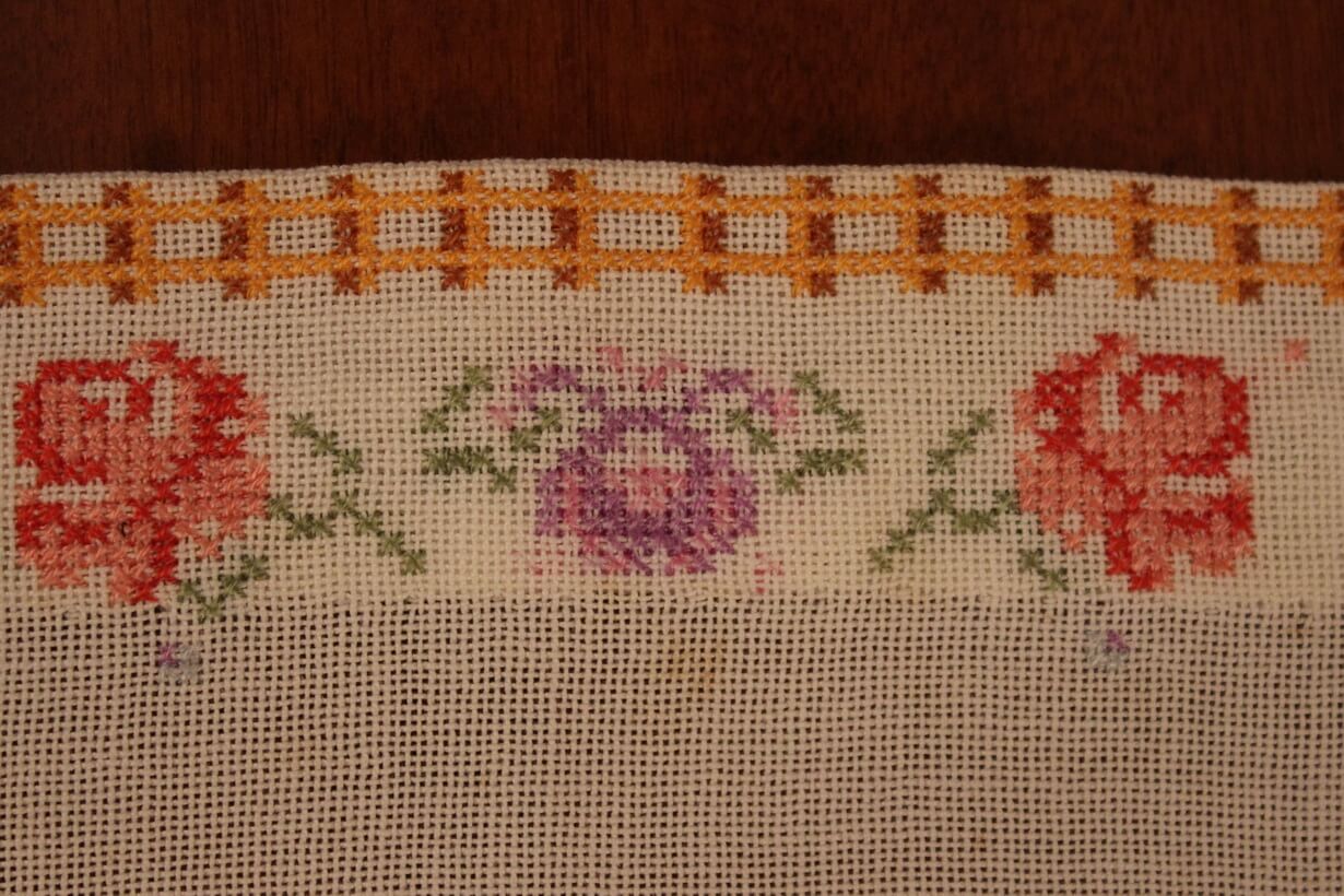 This is one of the artist’s early works. The fabric is etamine. The design motif was sourced from a magazine and used to create this composition. Cross-stitch was used.
