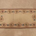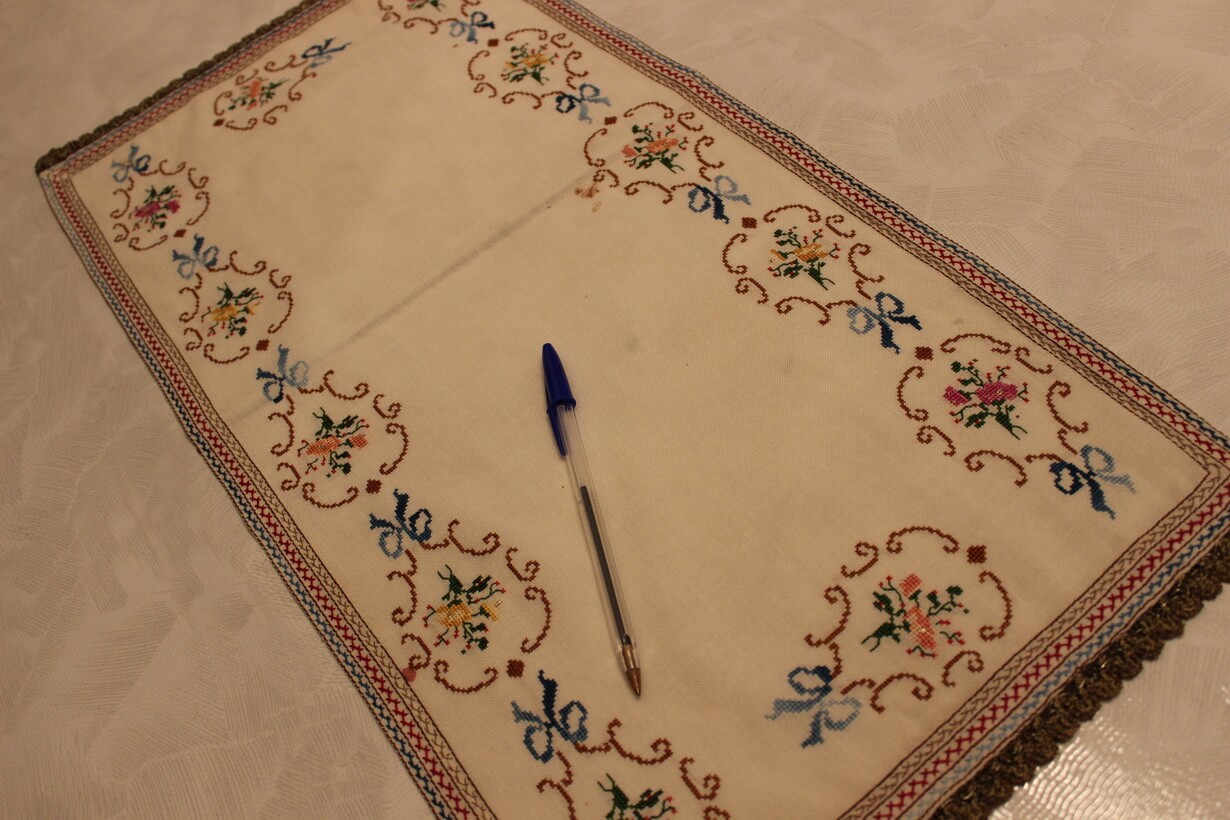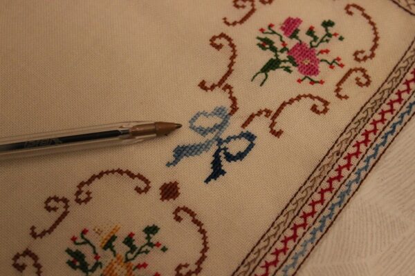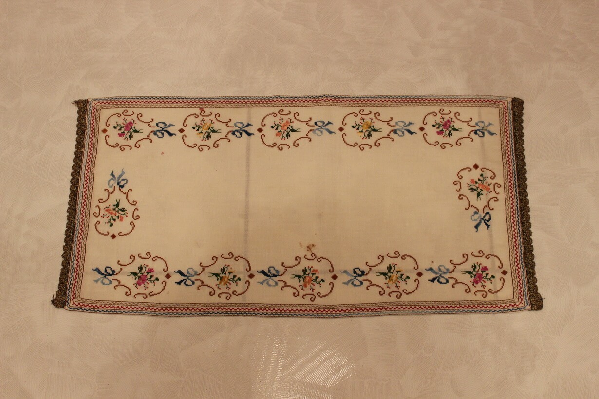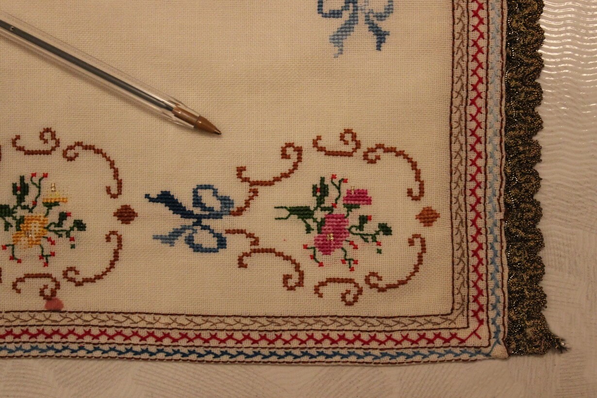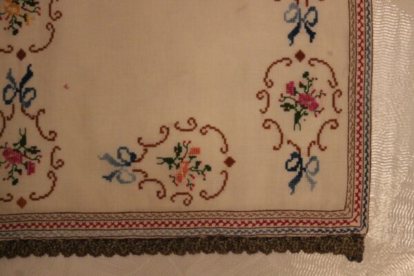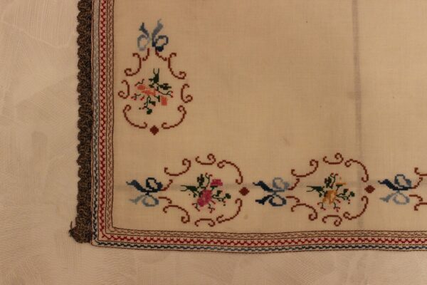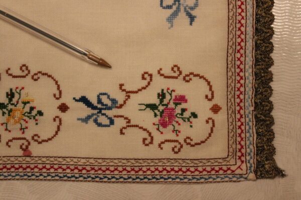 The fabric is etamine. The design motif was created using a basic motif (called “mirror” in Greek, because it resembles a small mirror) and repetition. Cross-stitch was used.