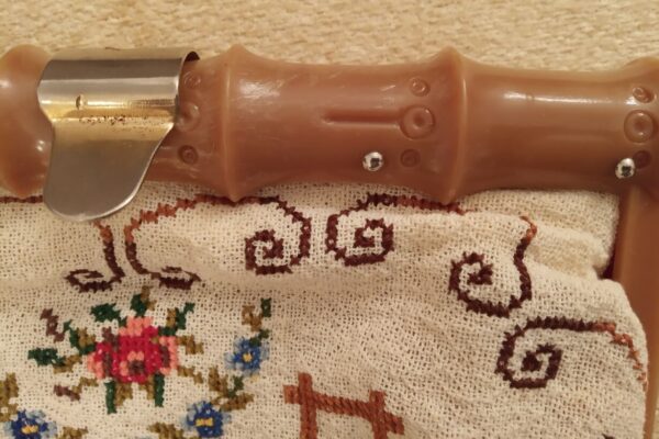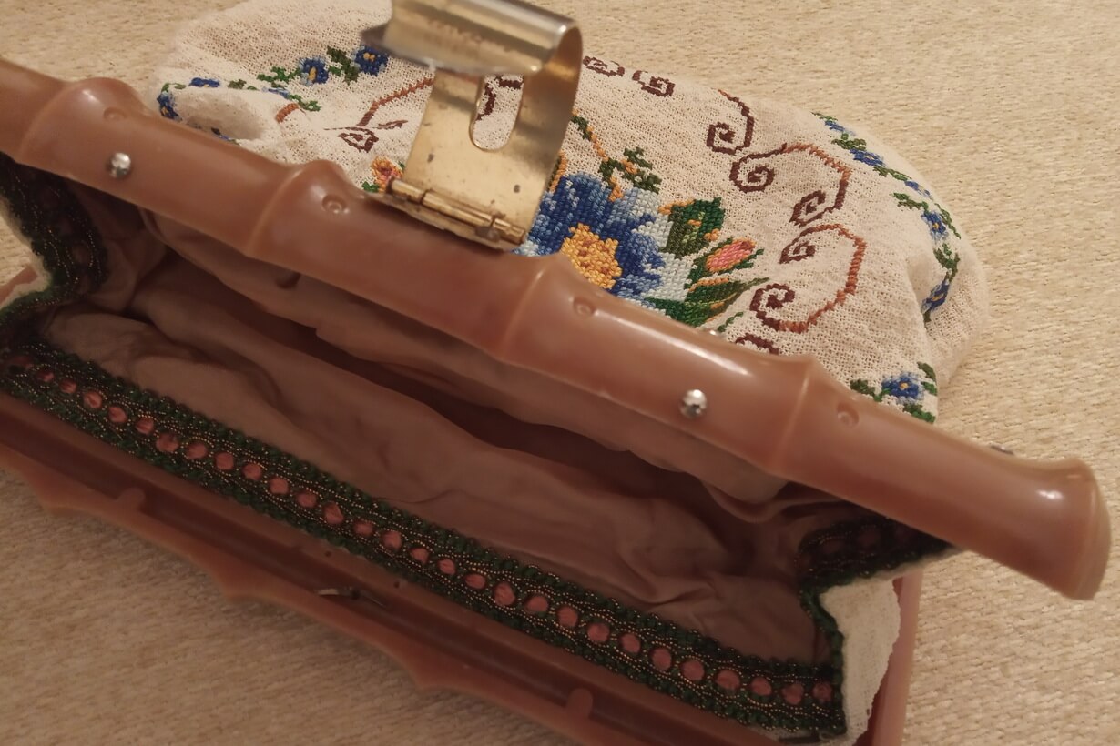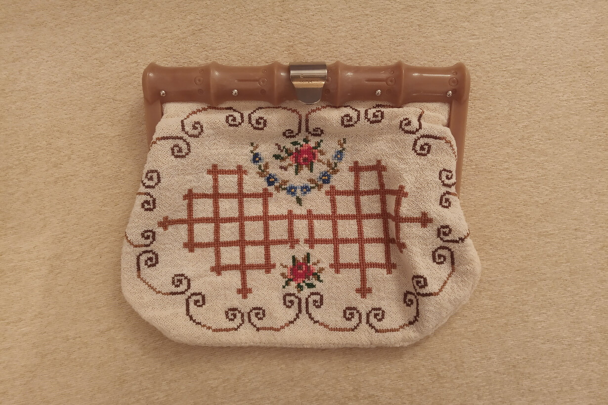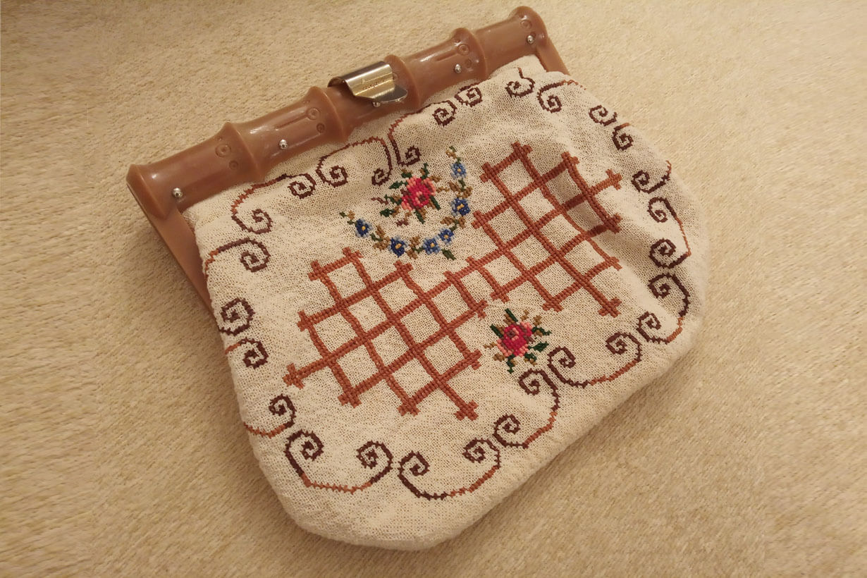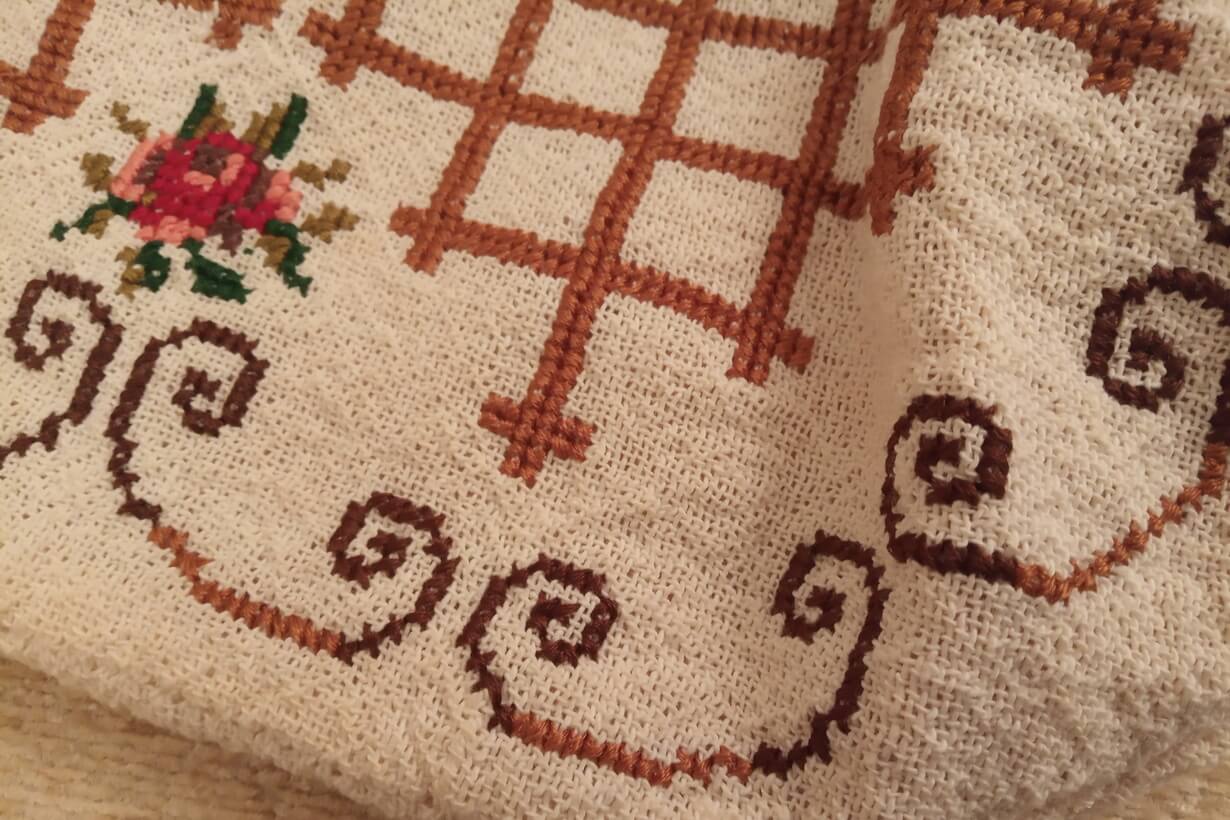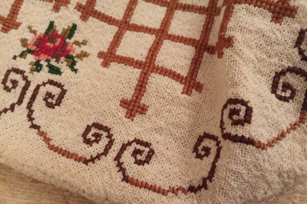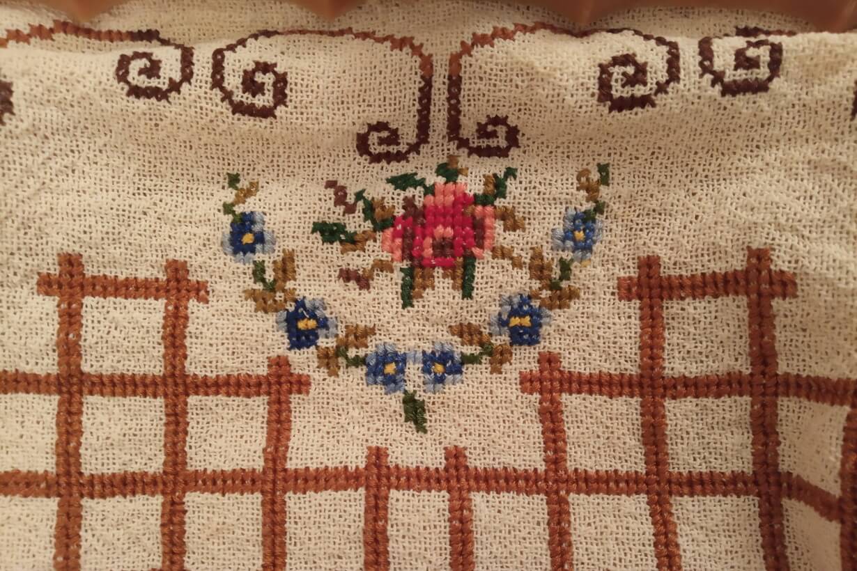 The fabric is called “Arachovitiko”. This is a traditional fabric with pills from the Greek village of Arachova. The design motif was sourced from a magazine. Cross-stitch was used.